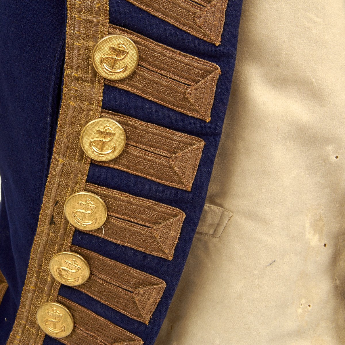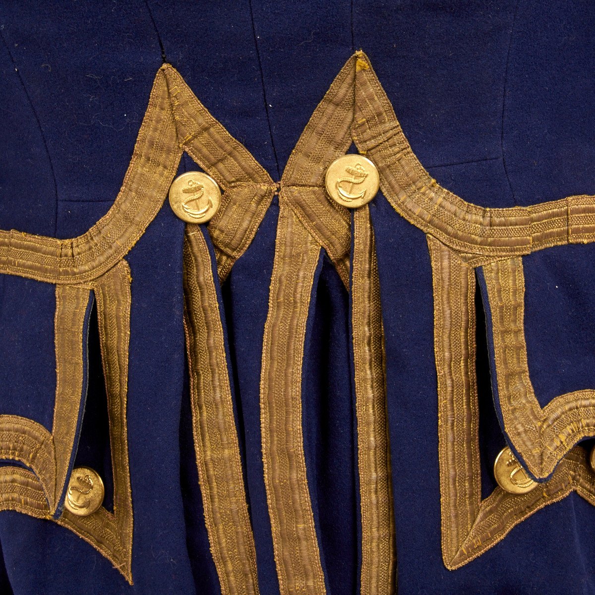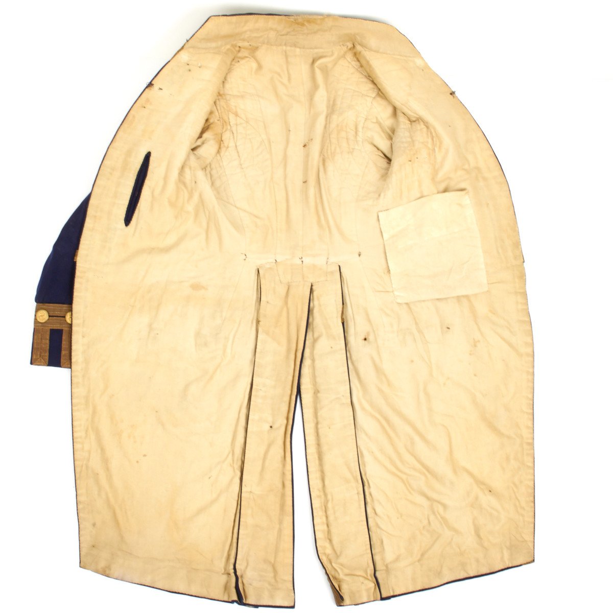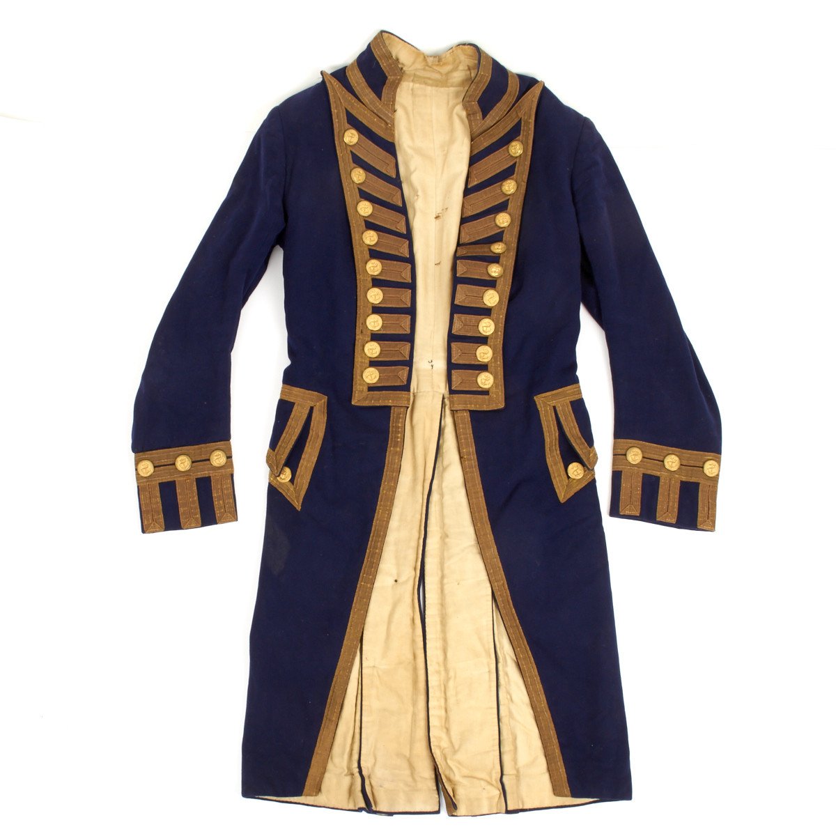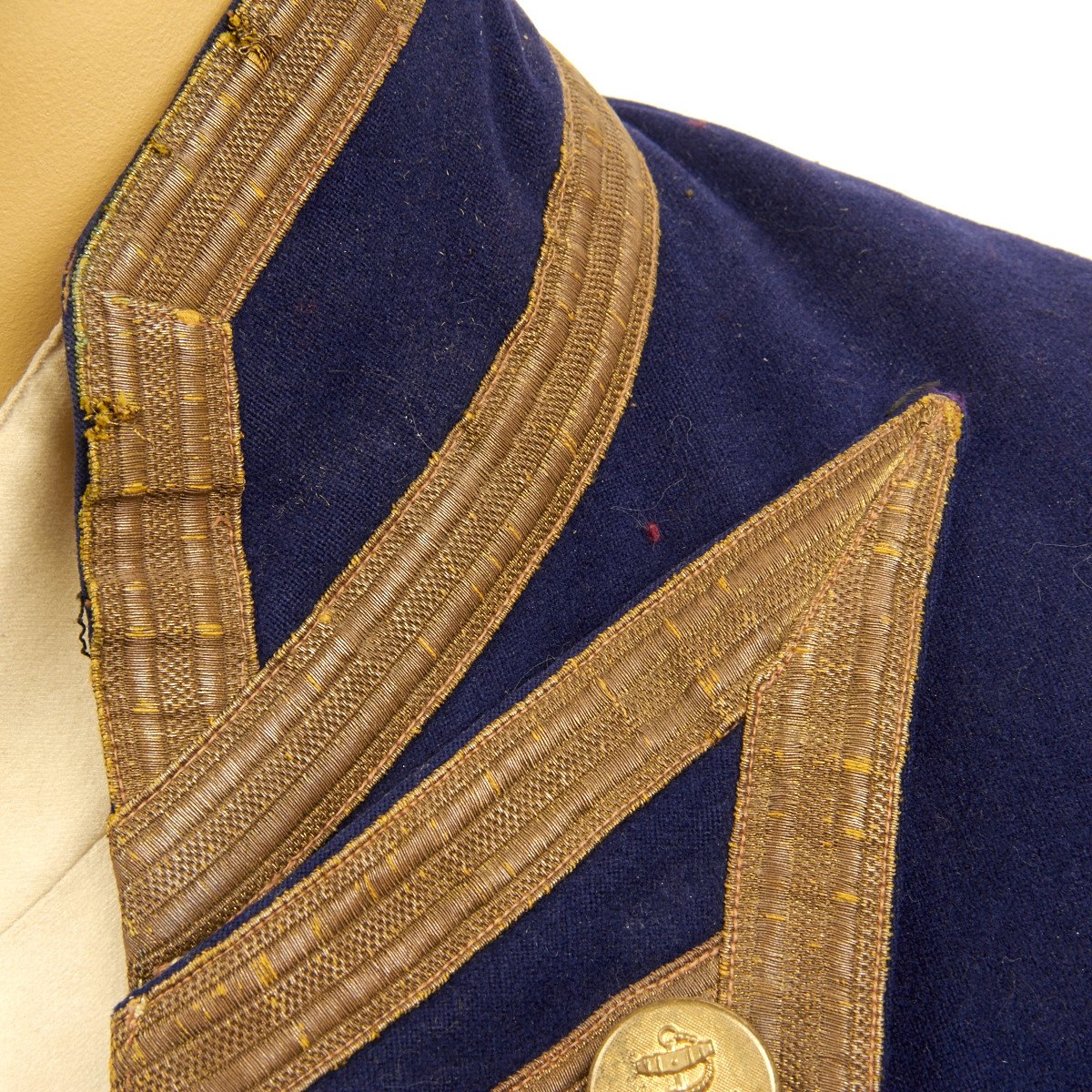 - Officer's Frock Coat with gold braid, all original Naval gilt Buttons and lining complete. Note the quilted stitching in inner arm area (repaired/replaced) was resewn post 1830.
