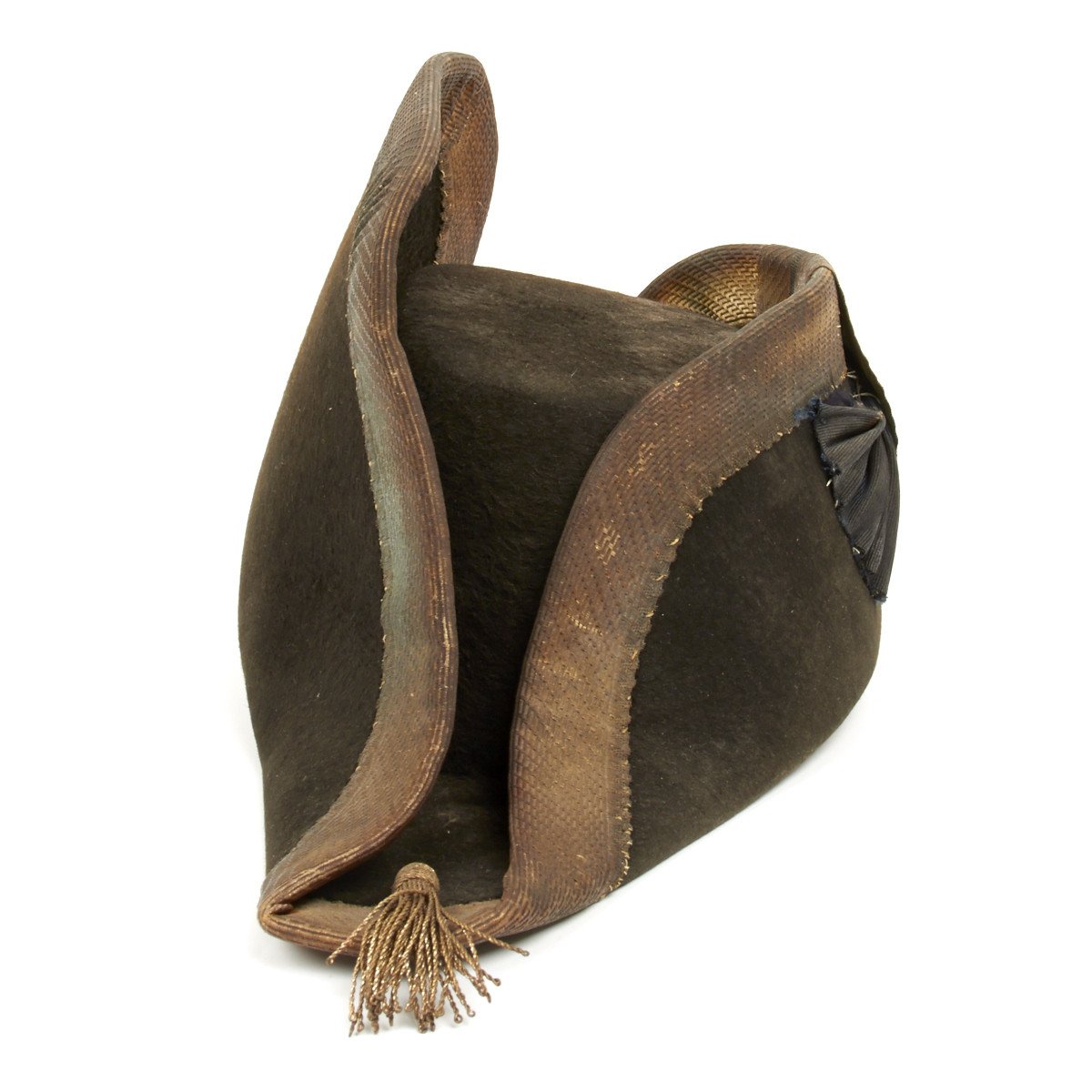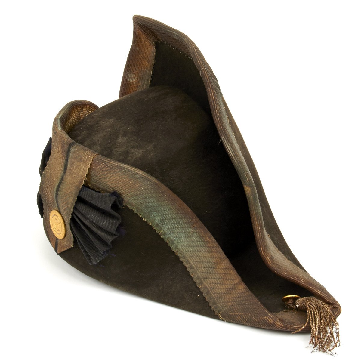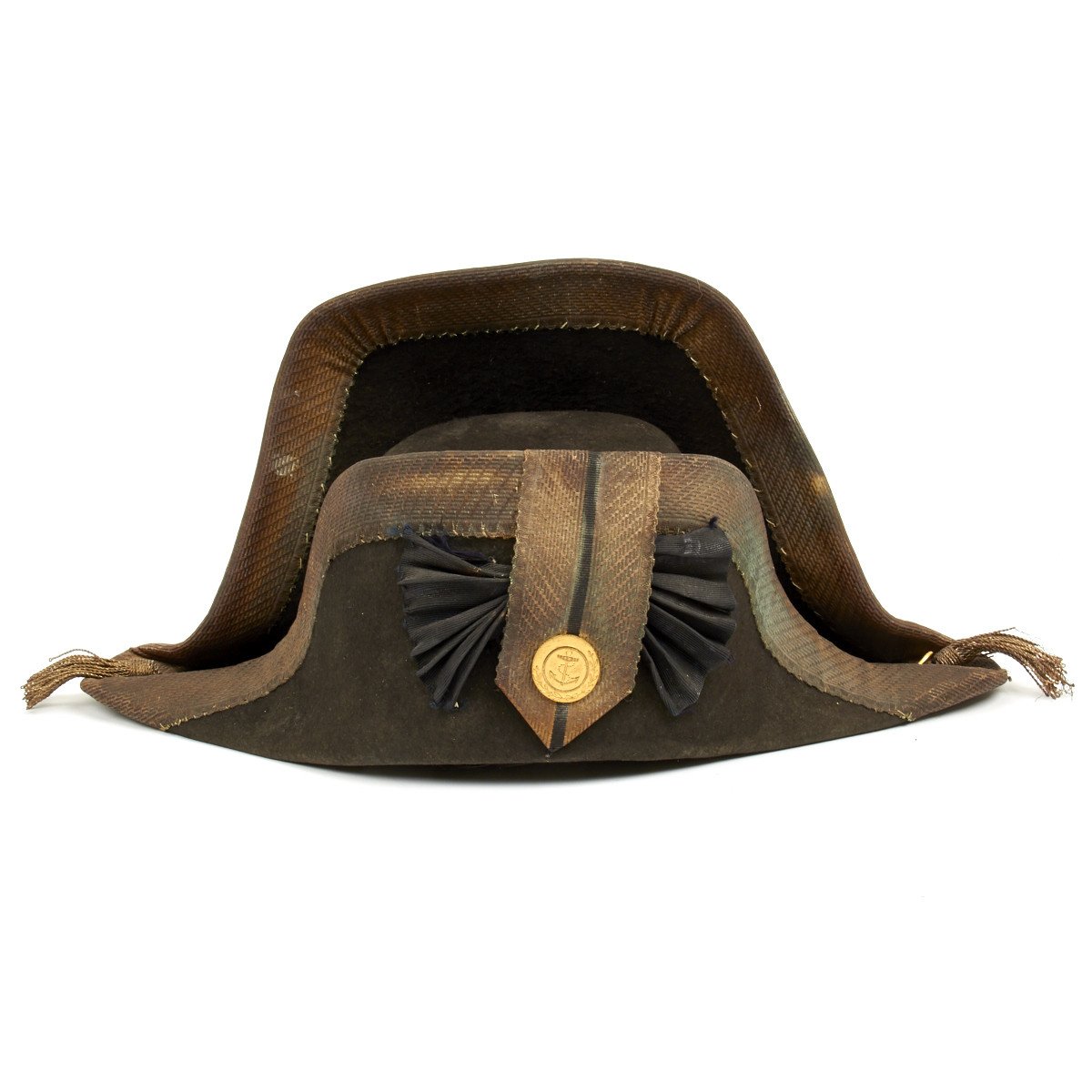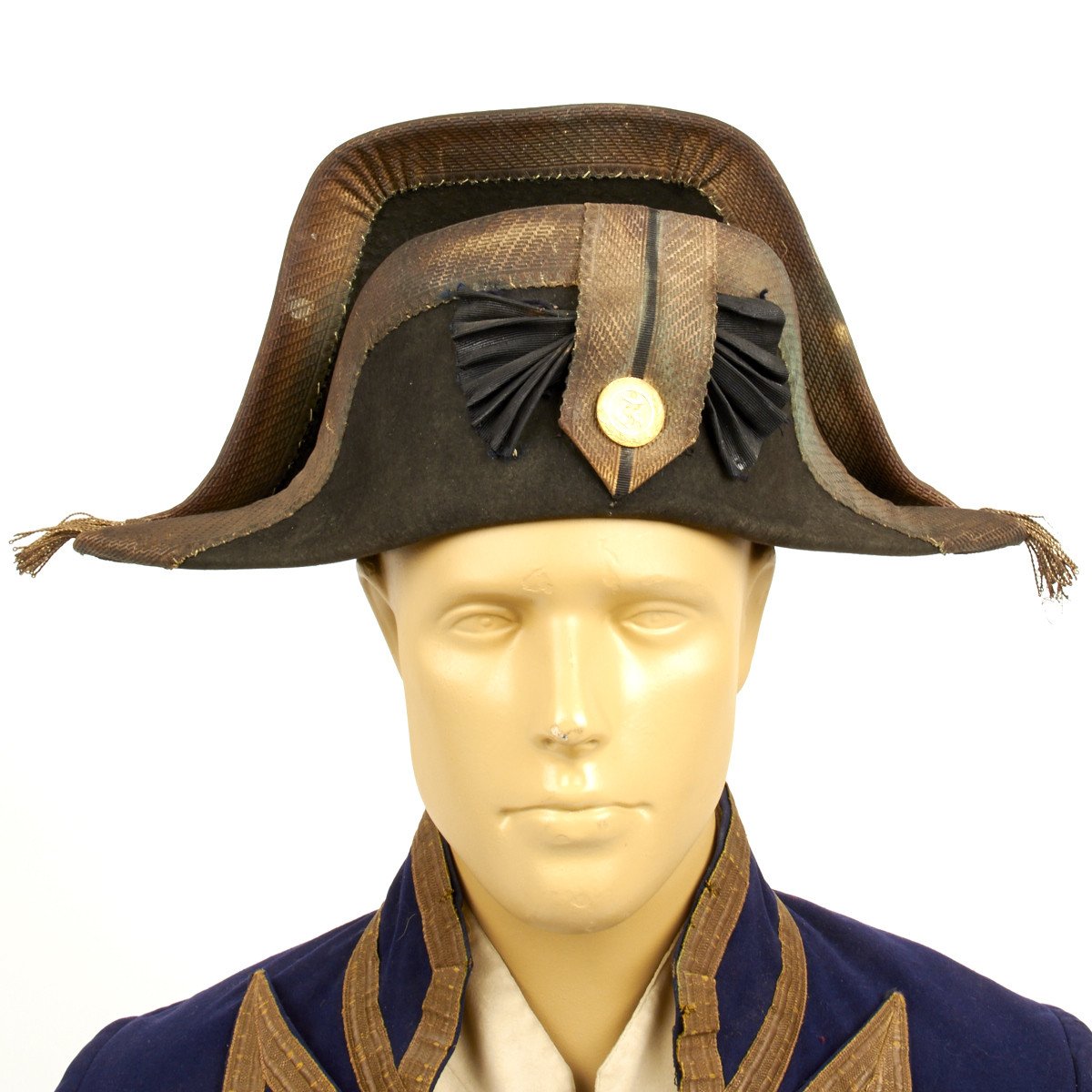 - Officer's cocked hat worn left to right showing gold braid, correct Naval gilt button and pleated ribbon cockade.