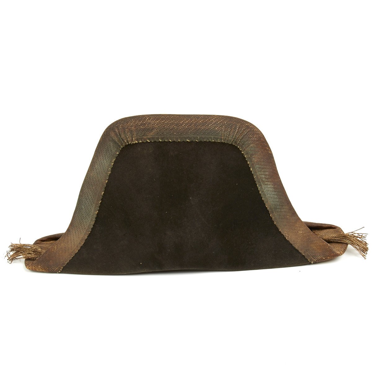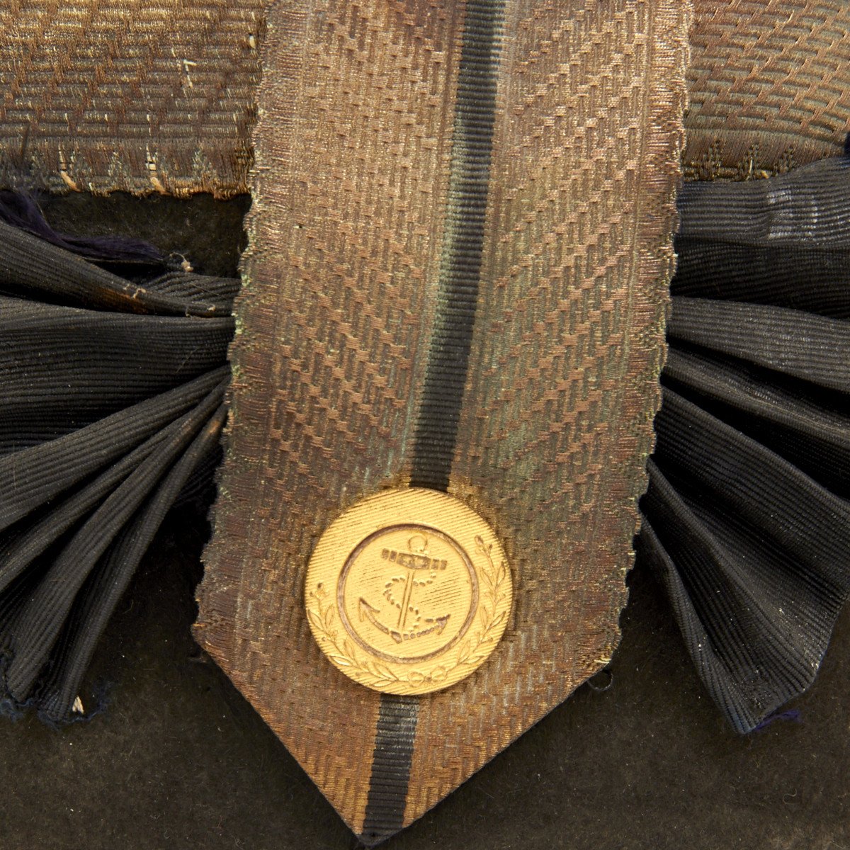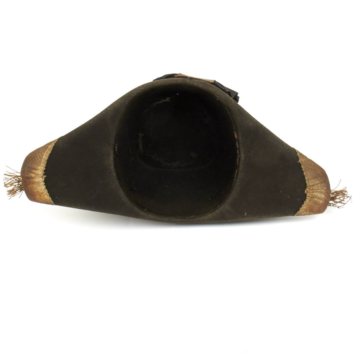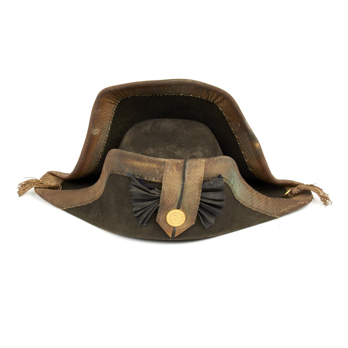 - Officer's cocked hat worn left to right showing gold braid, correct Naval gilt button and pleated ribbon cockade.