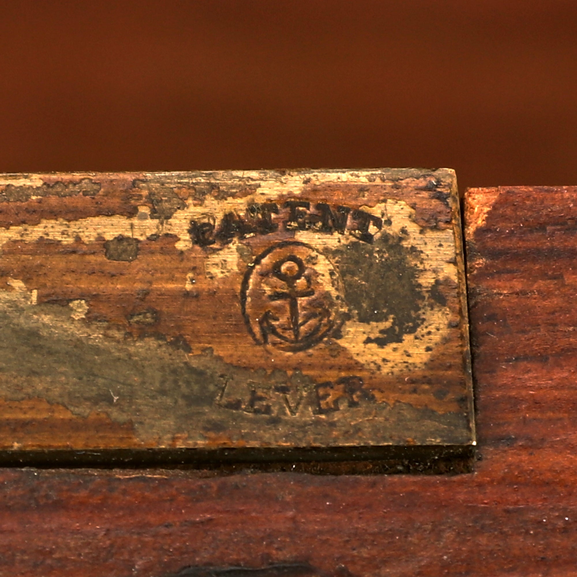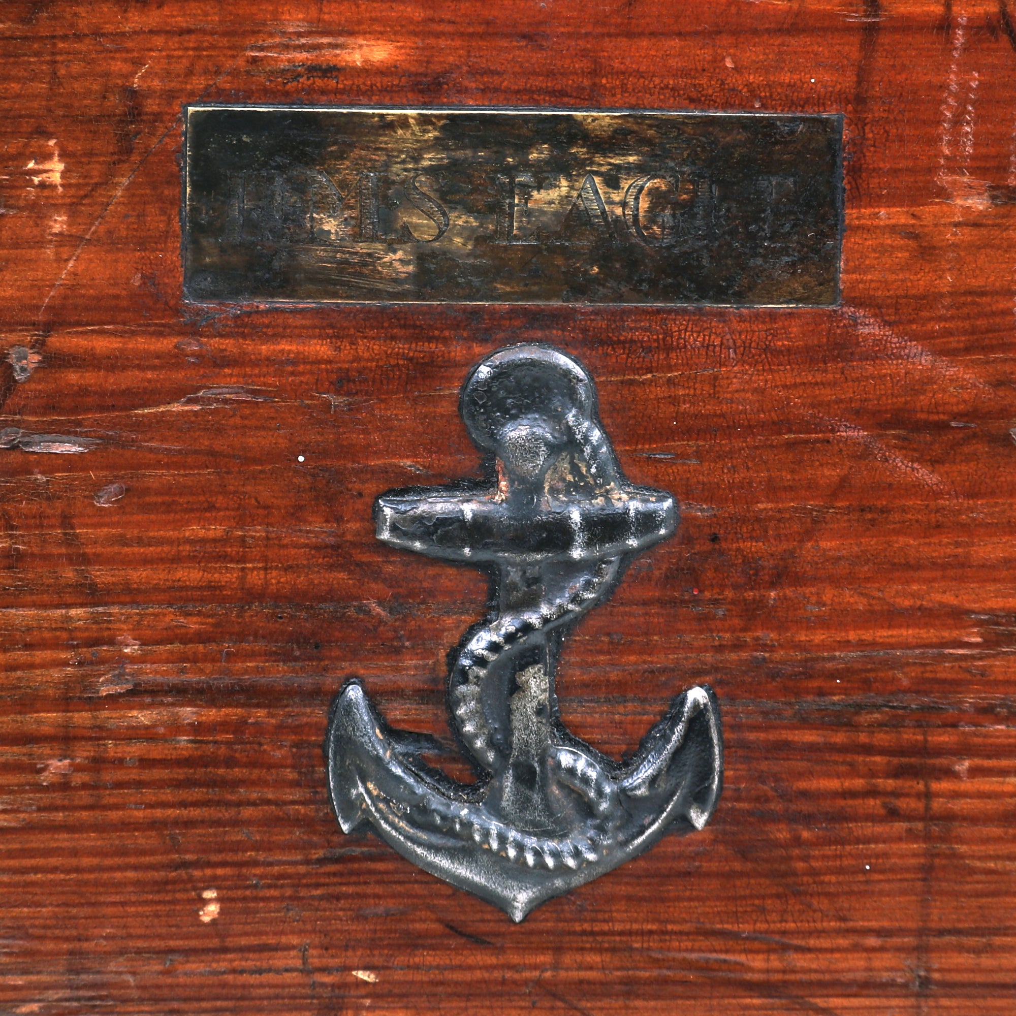 The front of the chest is decorated with a 2.5-inch (6.4 cm) brass anchor entwined with its cable. Above the anchor is a small brass plate engraved HMS EAGLE. Directly above this is the lock for the lid. Amazingly, the key is still present. One feature of the chest that remains a mystery is the presence of two inset hinges between the bottom plate and the front panel. At this time, the bottom is securely screwed to the four sides, but perhaps this was not always so.