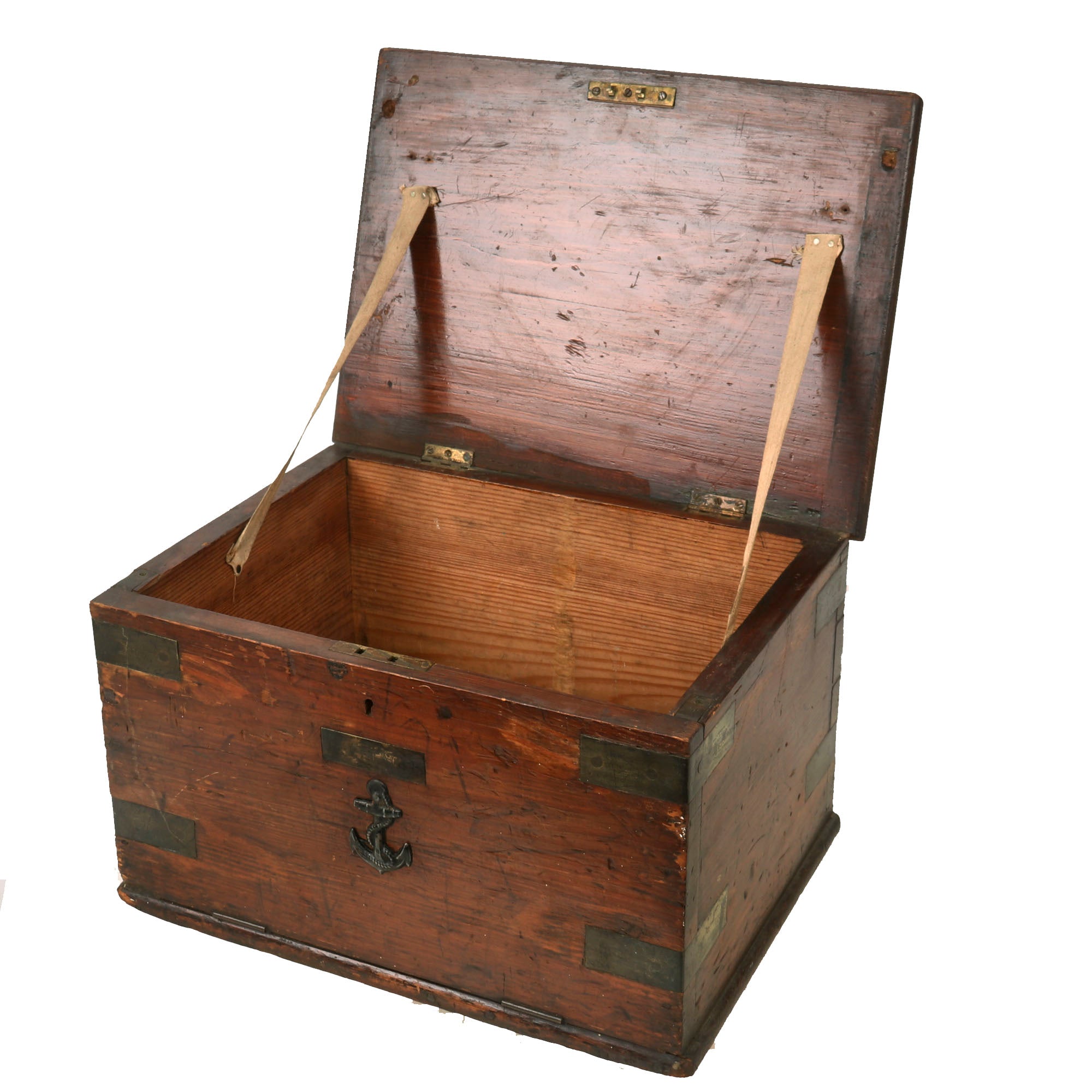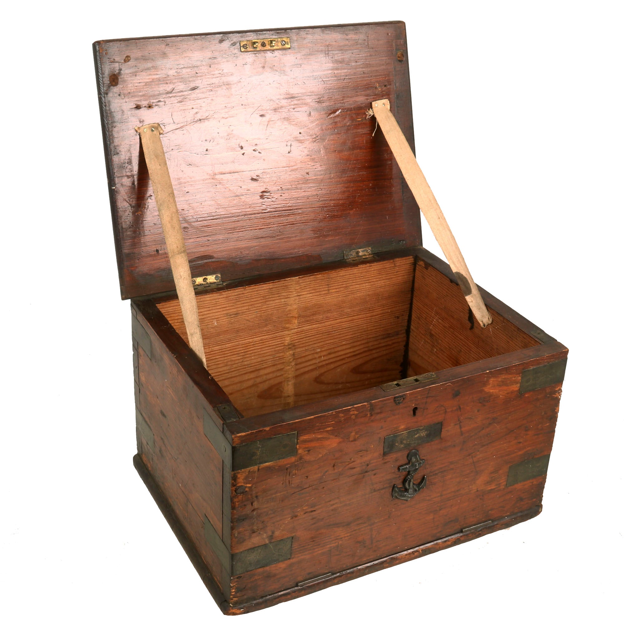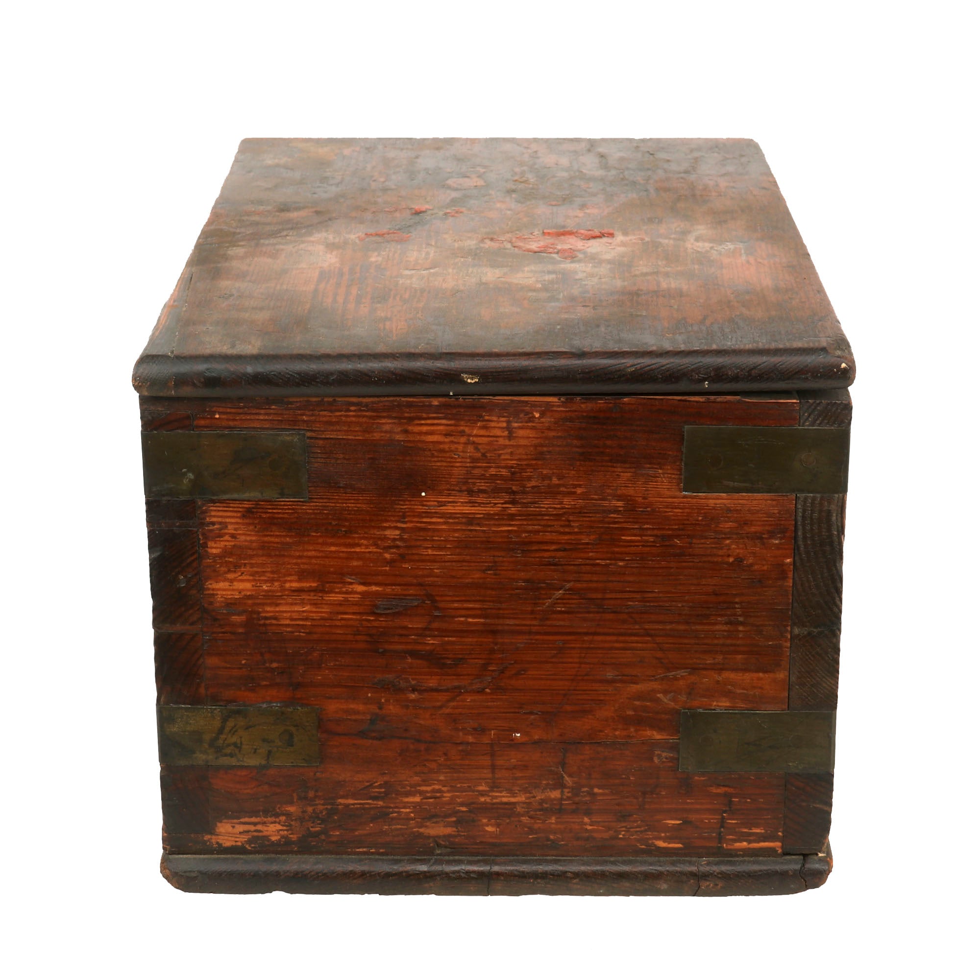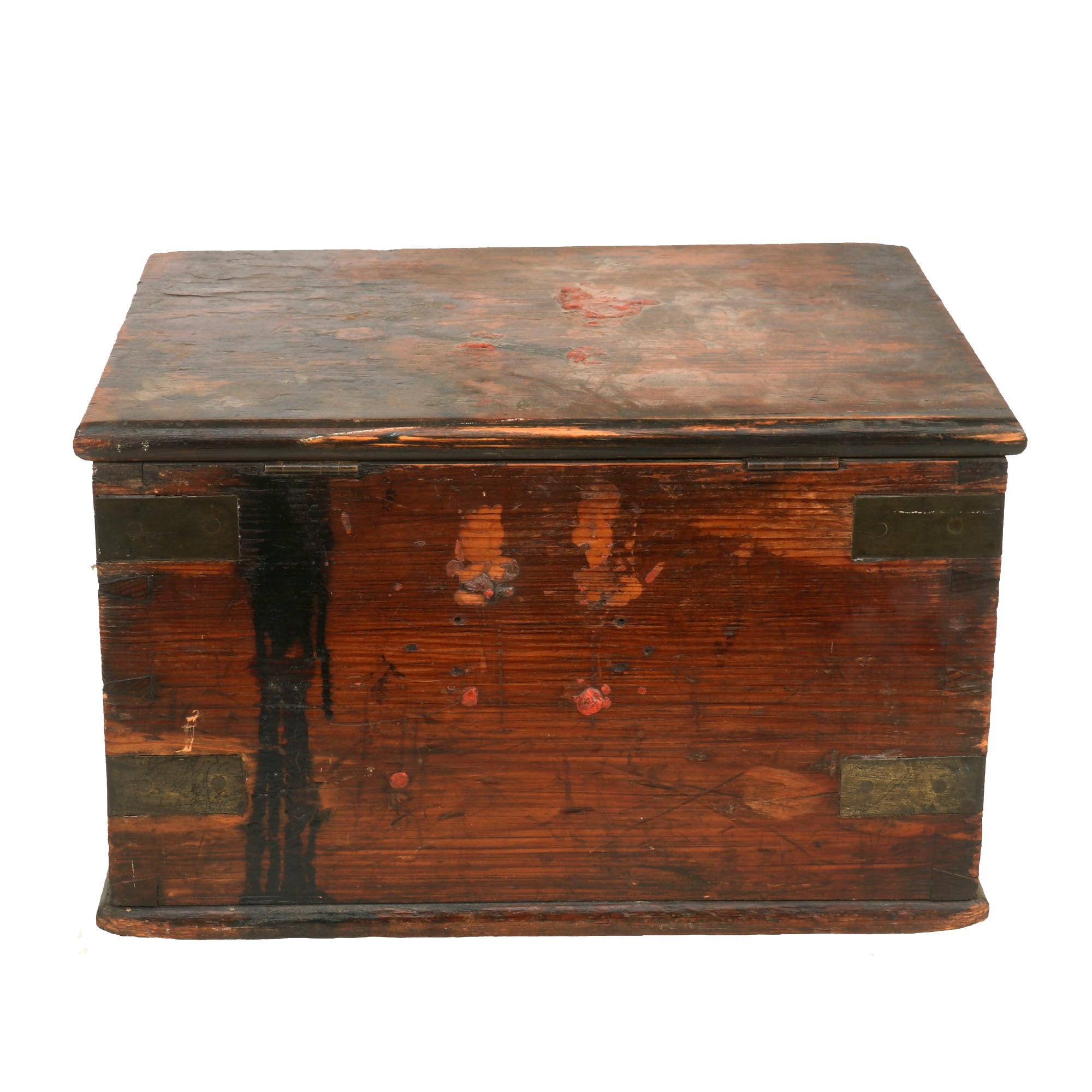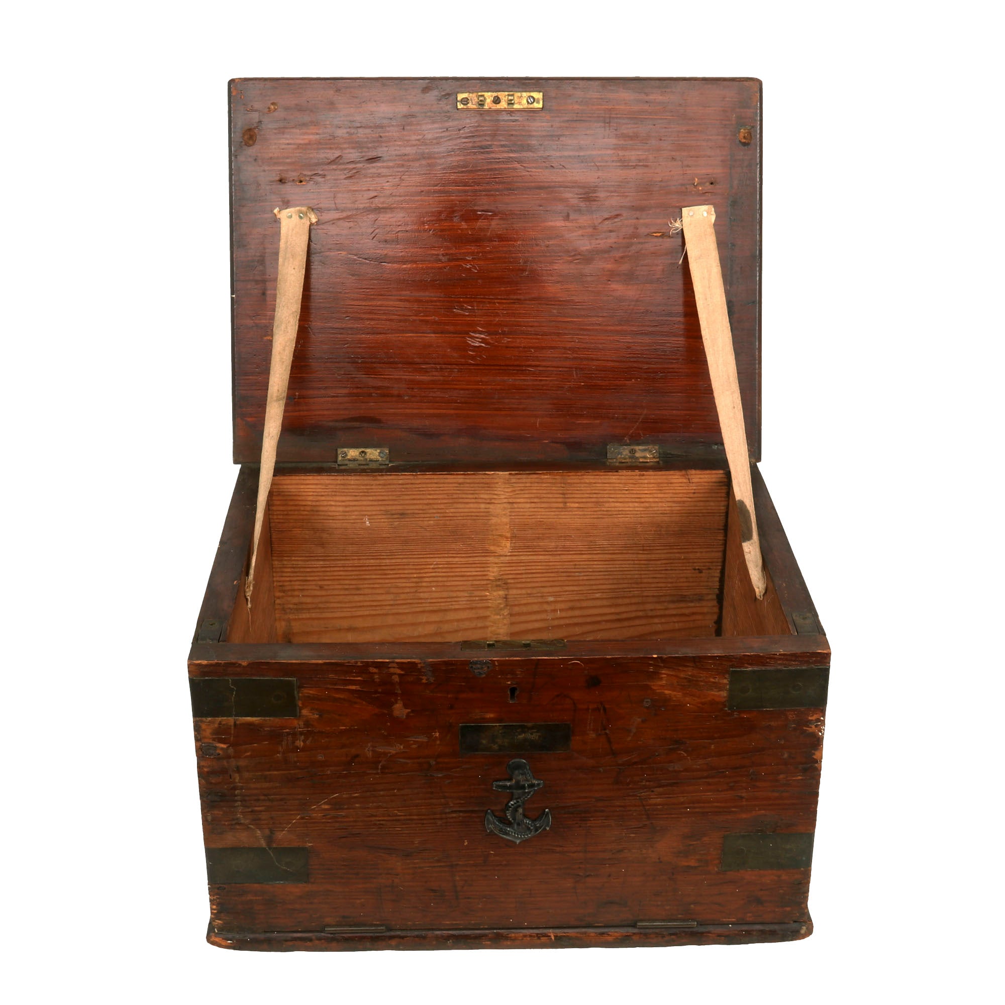 Original Item: Only One Available. This British orders chest was obtained from a private collection of Napoleonic era naval equipment. The chest is strongly constructed of wood and brass and measures 15.6 inches (39.7 cm) wide, 11.5 inches (29 cm) deep, and 9.6 inches (24.5 cm) high. At some point in its history, it looks like an inkbottle was tipped over and blackened some of the lid and the back. Old sealing wax is spotted around the lid and back, also, testifying graphically to the chest's original function.