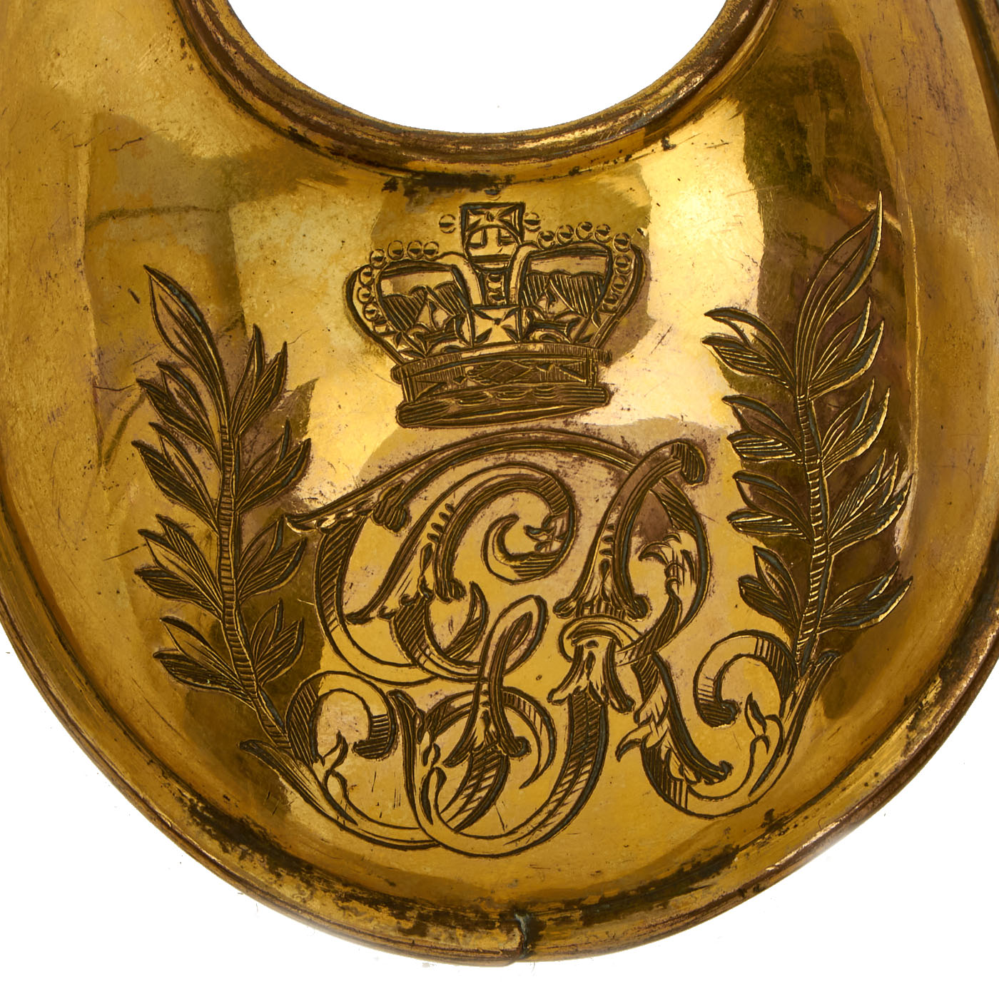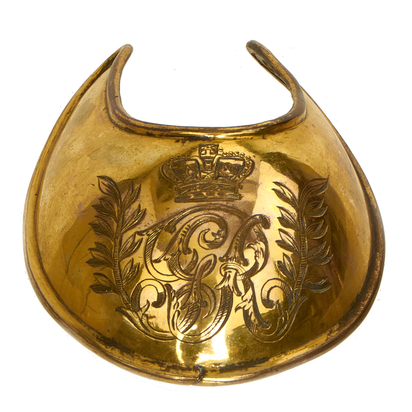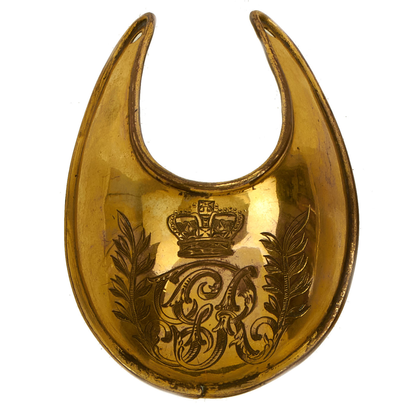 Original Item: Only one available. An officer's Gorget was perhaps the last symbolic piece of "armor" worn by British officers to denote their authority. The introduction of firearms in the 16th and 17th centuries reduced knightley suits of armor as a viable defense. By the time the 18th century arrived, cavalry wore Cuirasses for upper body protection but the great weight needed to deflect musket balls became obsolete after the battle of Waterloo in 1815. Thereafter armor was strictly ceremonial