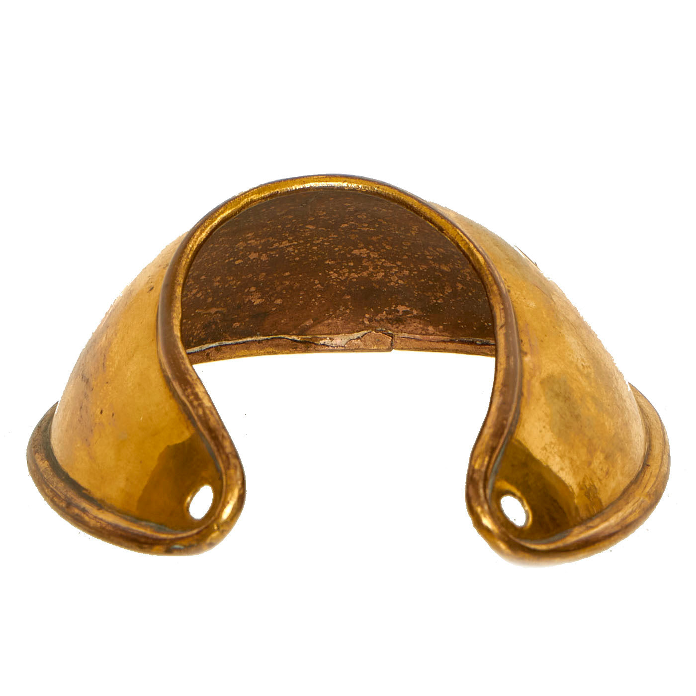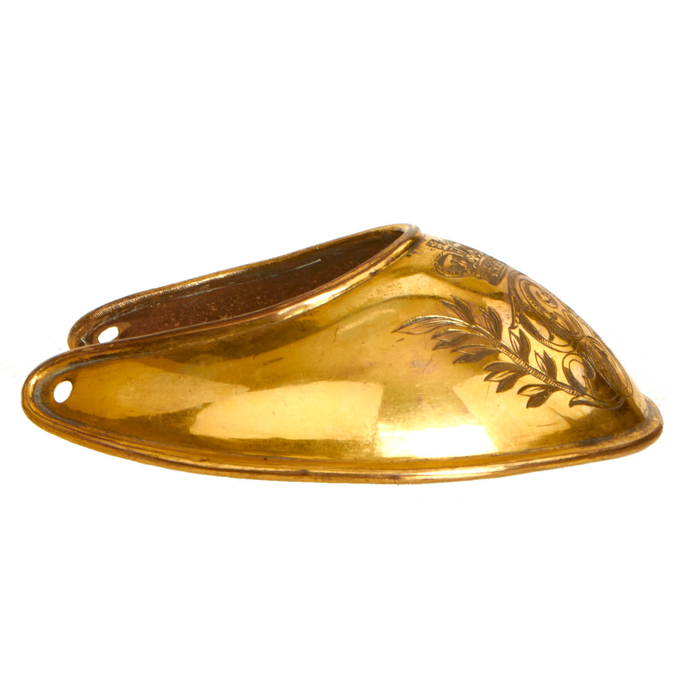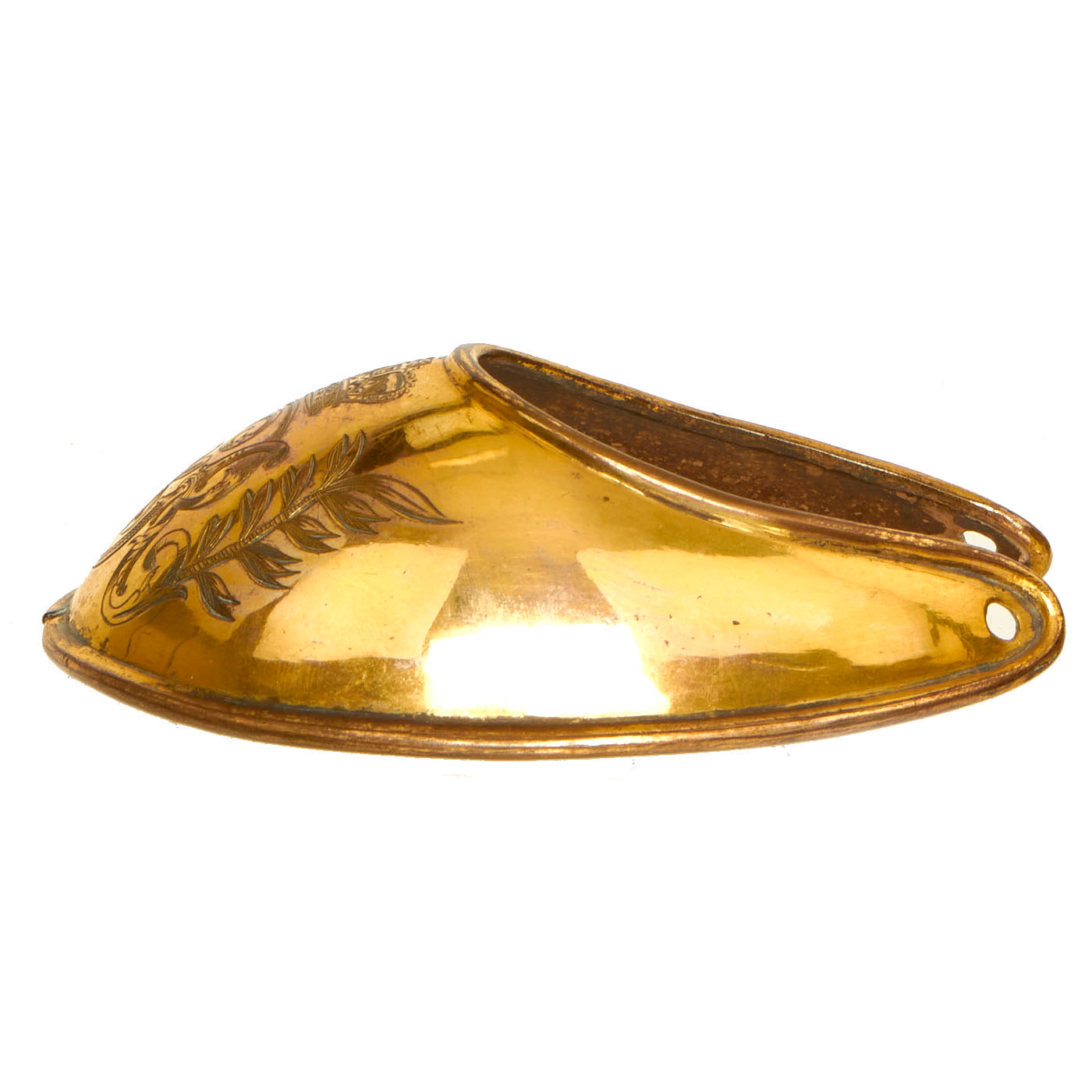 The British 1796 Universal Pattern officer’s Gorget was worn by officers in the British army. It retains most of the original fire gilding especially in the edges and recesses. The front is beautifully engraved with the George III monogram crowned GR, and is flanked with olive branches. The inside is nicely patinated and shows hammering marks.