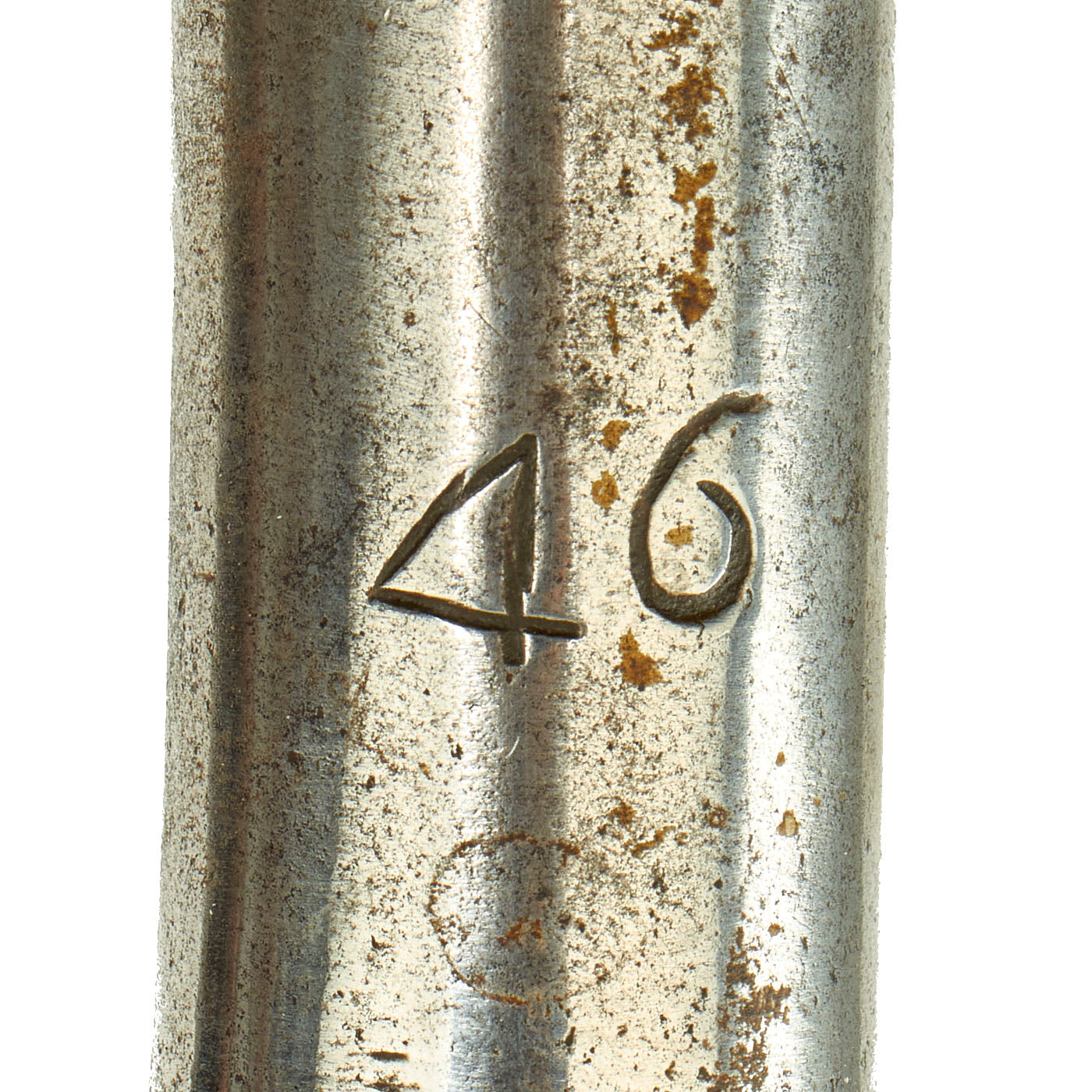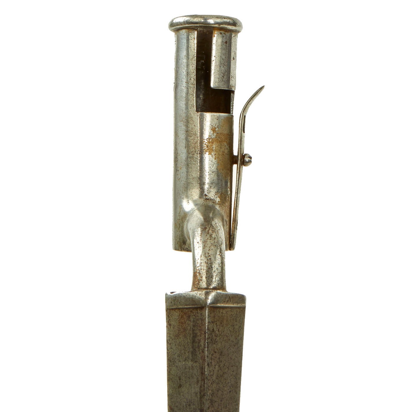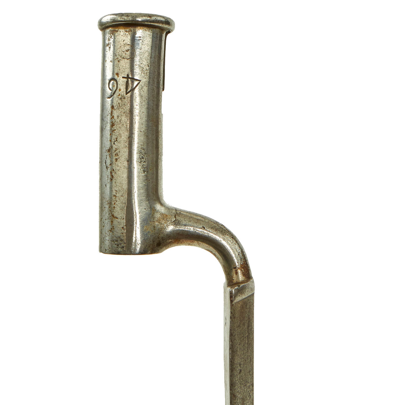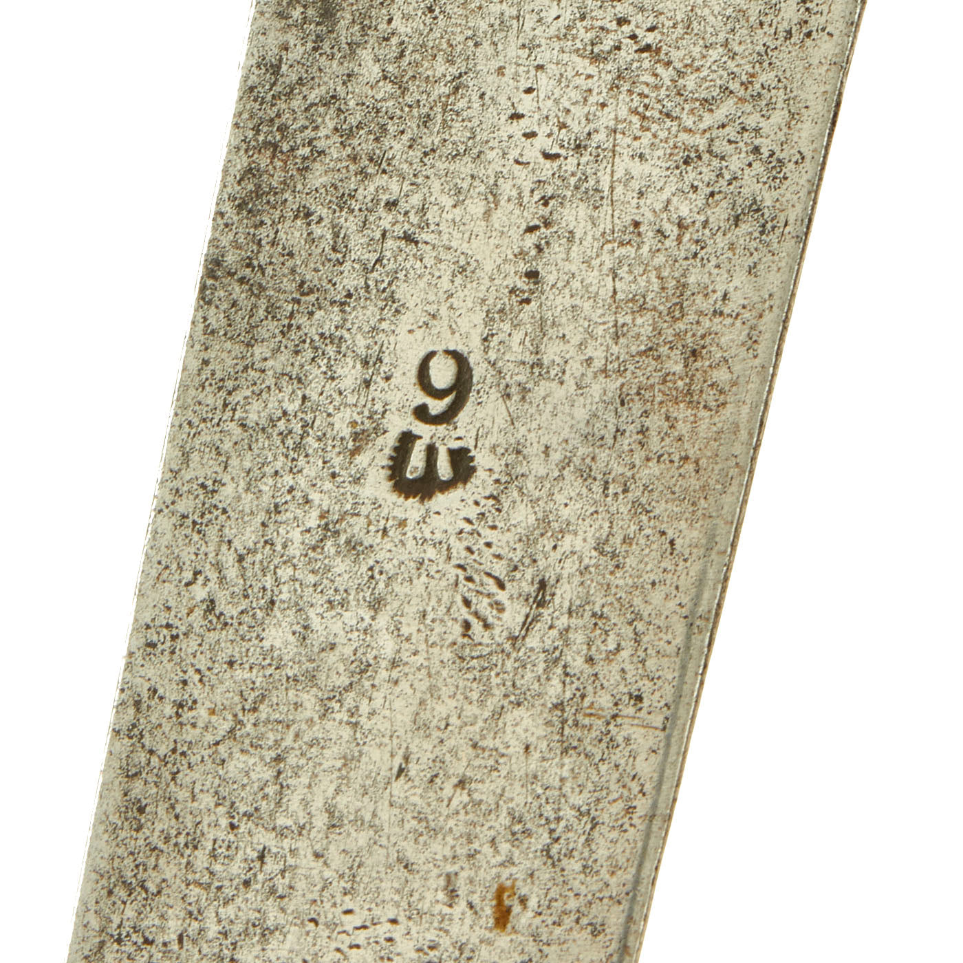 The “India Pattern” musket was the standard infantry musket used from 1797 to 1854 and many variations of the socket bayonet used for these muskets were produced, the main supplier was Osborn, just like this example here. This is the conventional socket bayonet for the India Pattern, having a base ring and three-step mortise in the socket and a triangular blade. The blade has good unsharpened edges and the tip of the blade appears to have been shortened. The socket is fitted with a spring catch, which is occasionally seen on earlier bayonets, but becomes more common in this period.