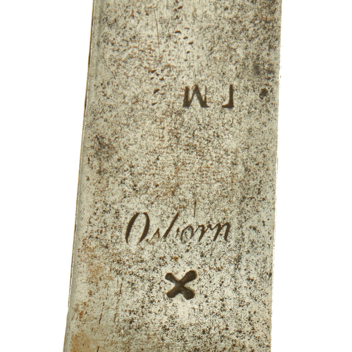 This example was made by Henry Osborn, who produced India Pattern bayonets from 1796–1808, when he entered into partnership with John Gunby. Osborn's name was stamped in a distinctive copperplate script on the ricasso with the usual acceptance and proof marks. The lock is engraved with the number “46” and we believe this to be for the 46th (South Devonshire) Regiment of Foot, who saw extensive service during the Napoleonic Wars.