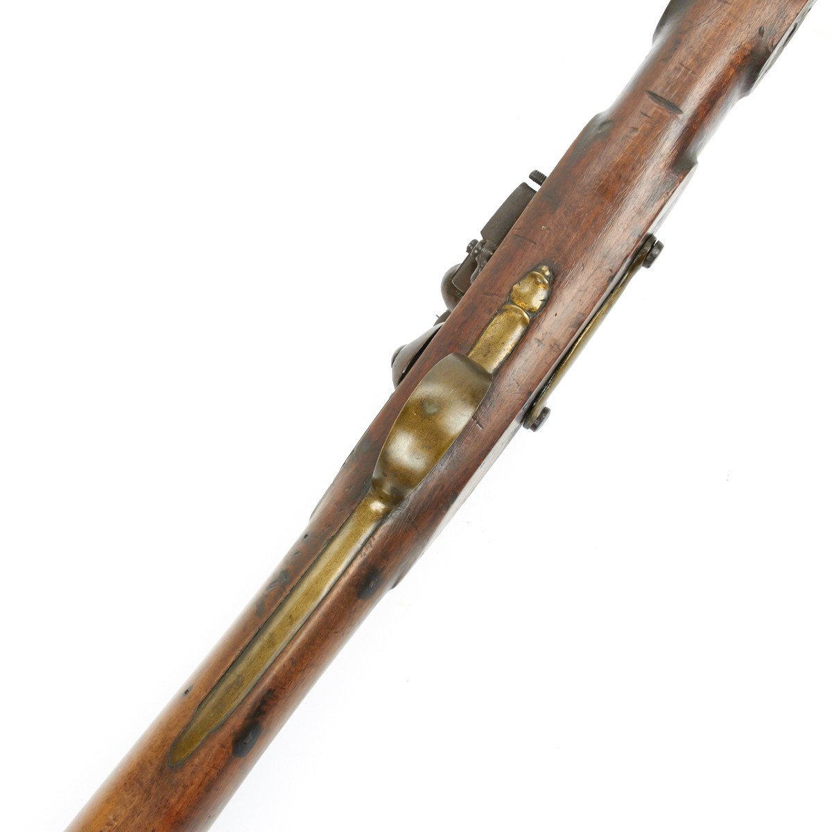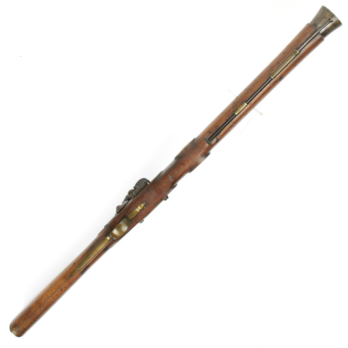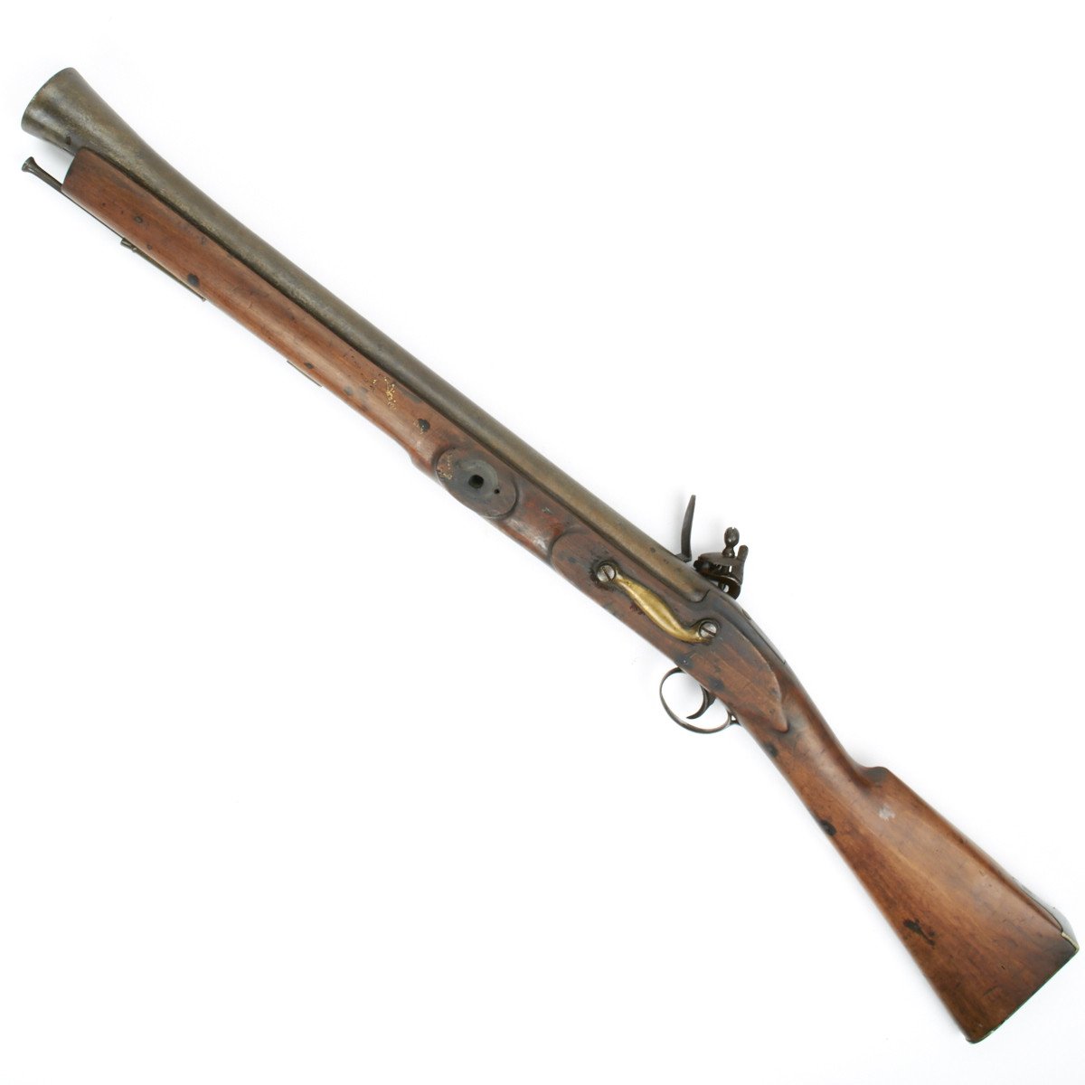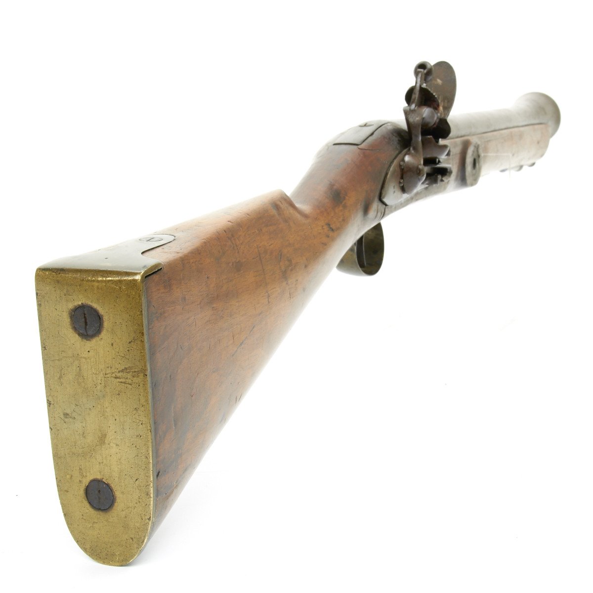 All brass military mounts with heavy hardwood stock cut for swivel yoke mount approximately at center, mount not present. Barrel still retains clear correct British proof marks for the era. Lock marked LONDON with a crown over S.M. thought to be for the London gun maker military contractor William Moore who worked at 78 Edware Road, London and made flintlock swivel guns under Royal government contract. Mr. Moore remained in business until 1835.
