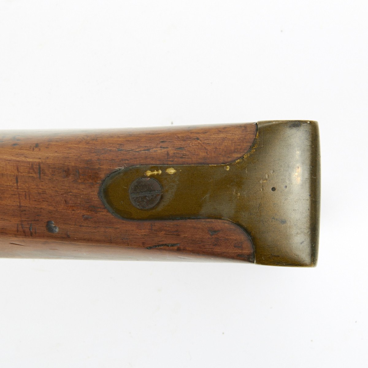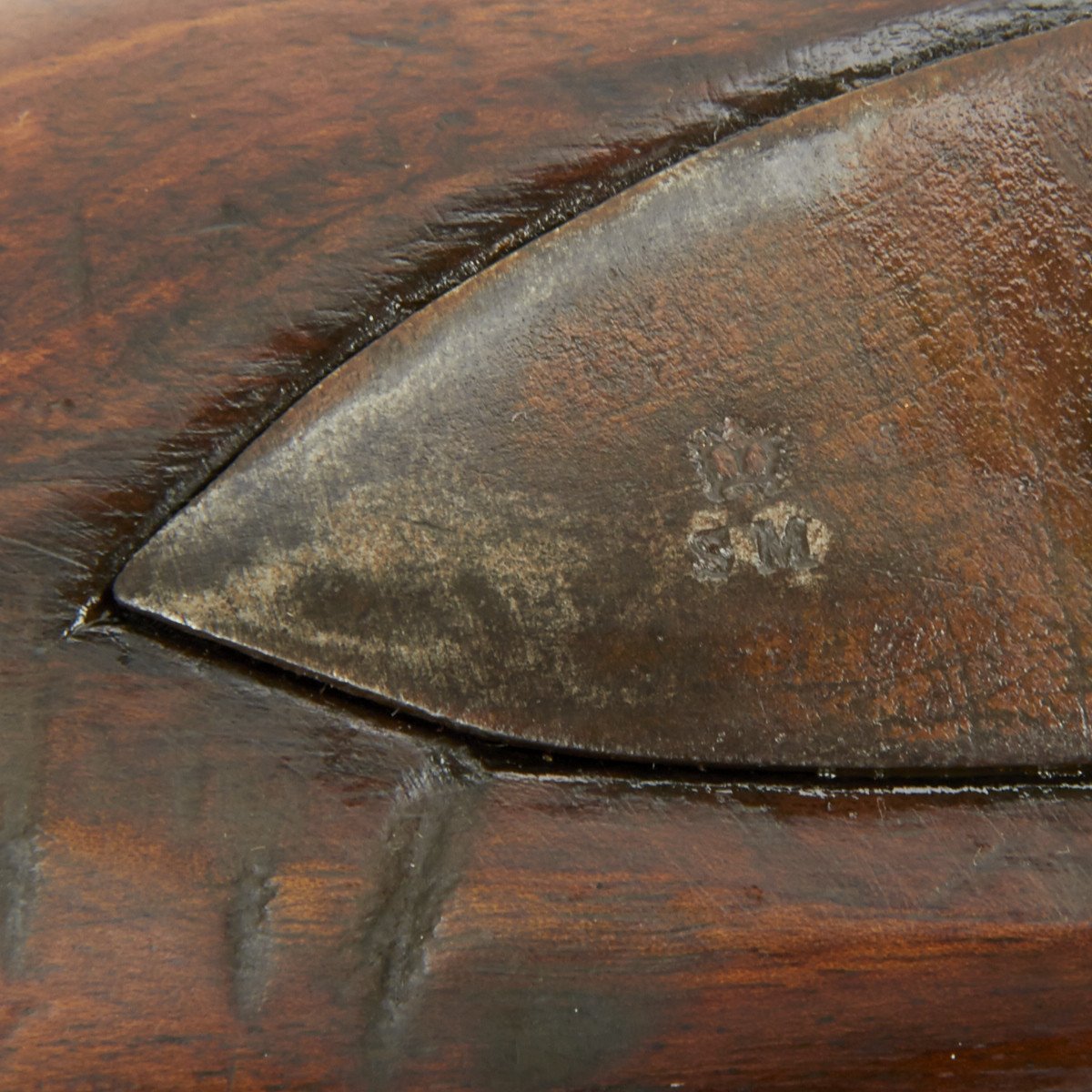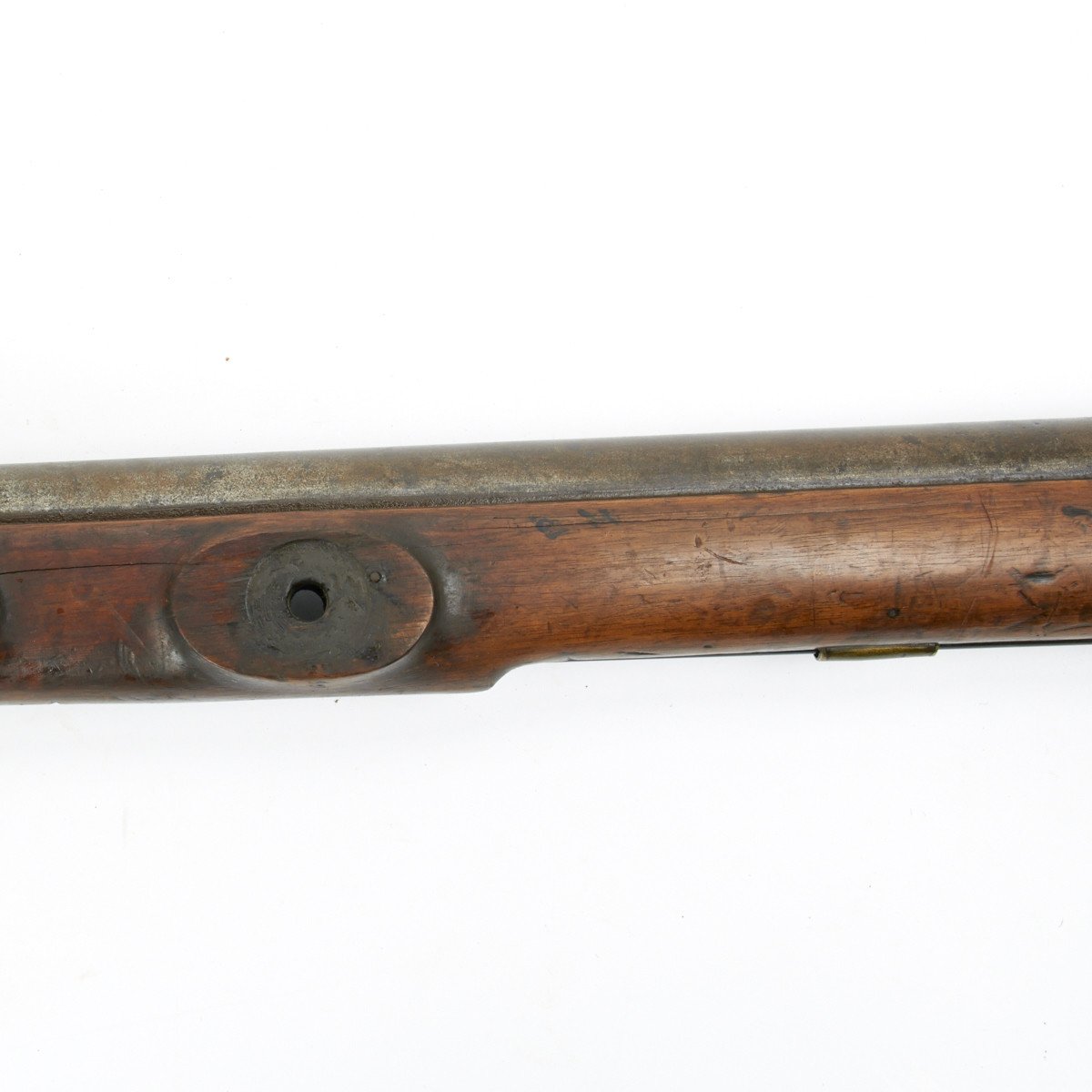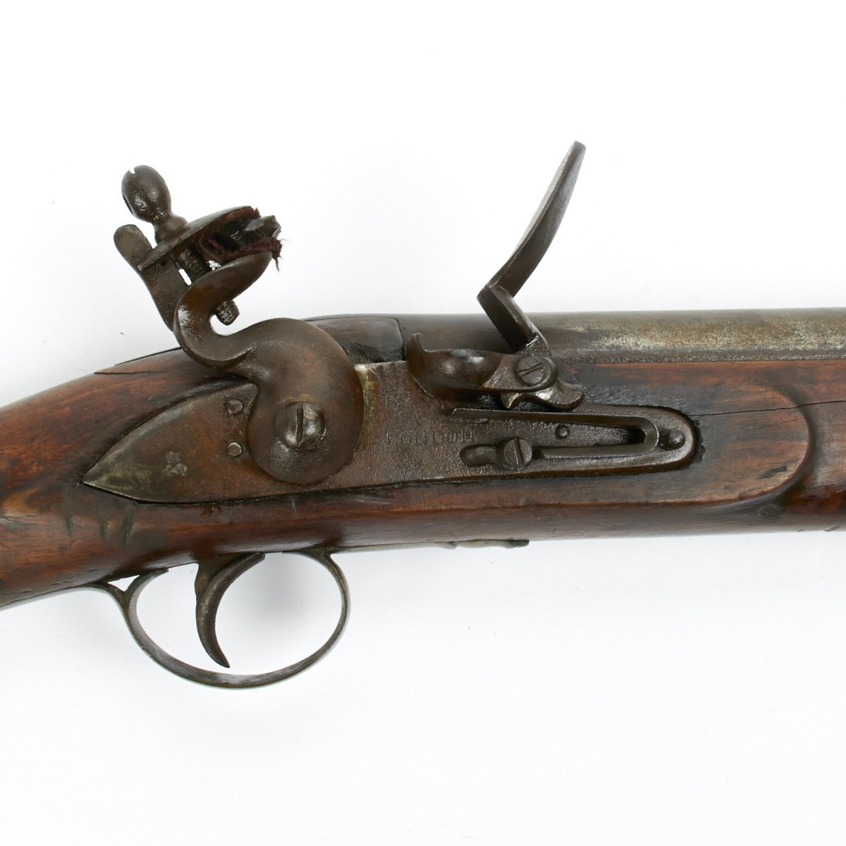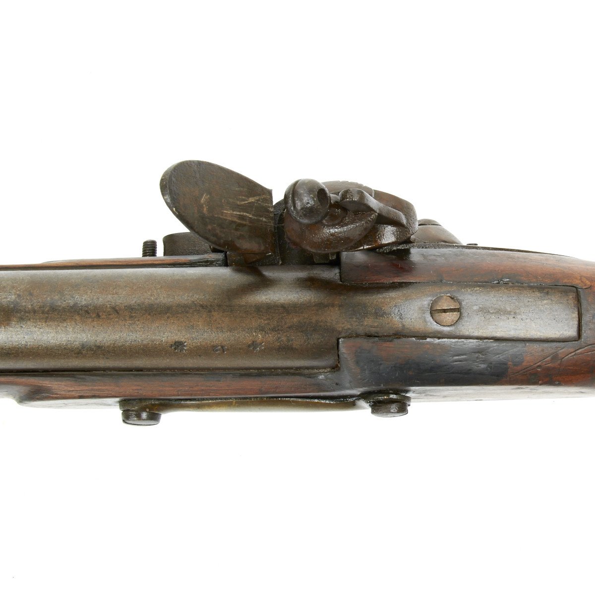 All brass military mounts with heavy hardwood stock cut for swivel yoke mount approximately at center, mount not present. Barrel still retains clear correct British proof marks for the era. Lock marked LONDON with a crown over S.M. thought to be for the London gun maker military contractor William Moore who worked at 78 Edware Road, London and made flintlock swivel guns under Royal government contract. Mr. Moore remained in business until 1835.