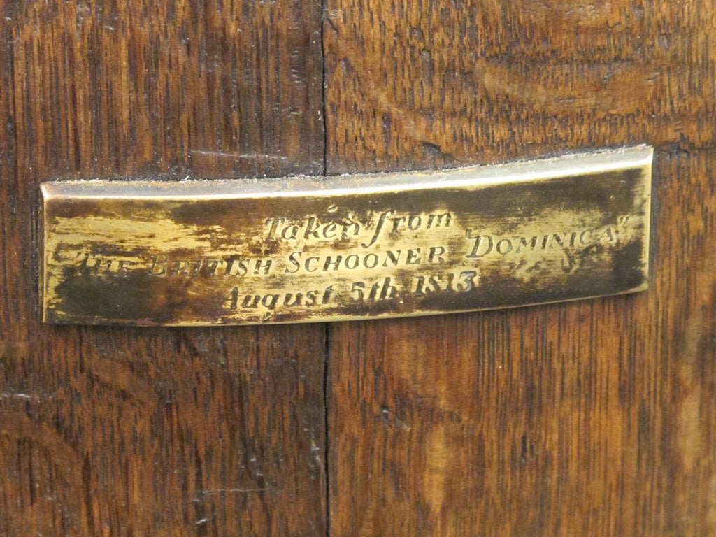 Research has shown that the British Schooner 'DOMINICA' was a captured French Ship 'DUC DE WAGRAM' taken in 1809 and pressed into British Service. It was 89.5' in length and was armed with twelve 12 Pounder Cannons and two 6 Pounder Cannons. It was captured by an American Privateer off Charlestown, part of Greater Boston, on August 5th 1813 but later recaptured by the British on 22nd May 1814. An American Sailor as a "Prize" or memento of the occasion presumably removed this "Swab Bucket".
