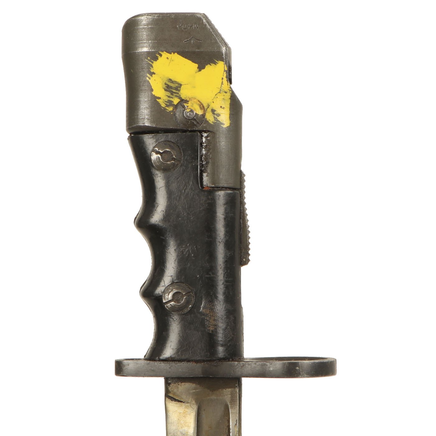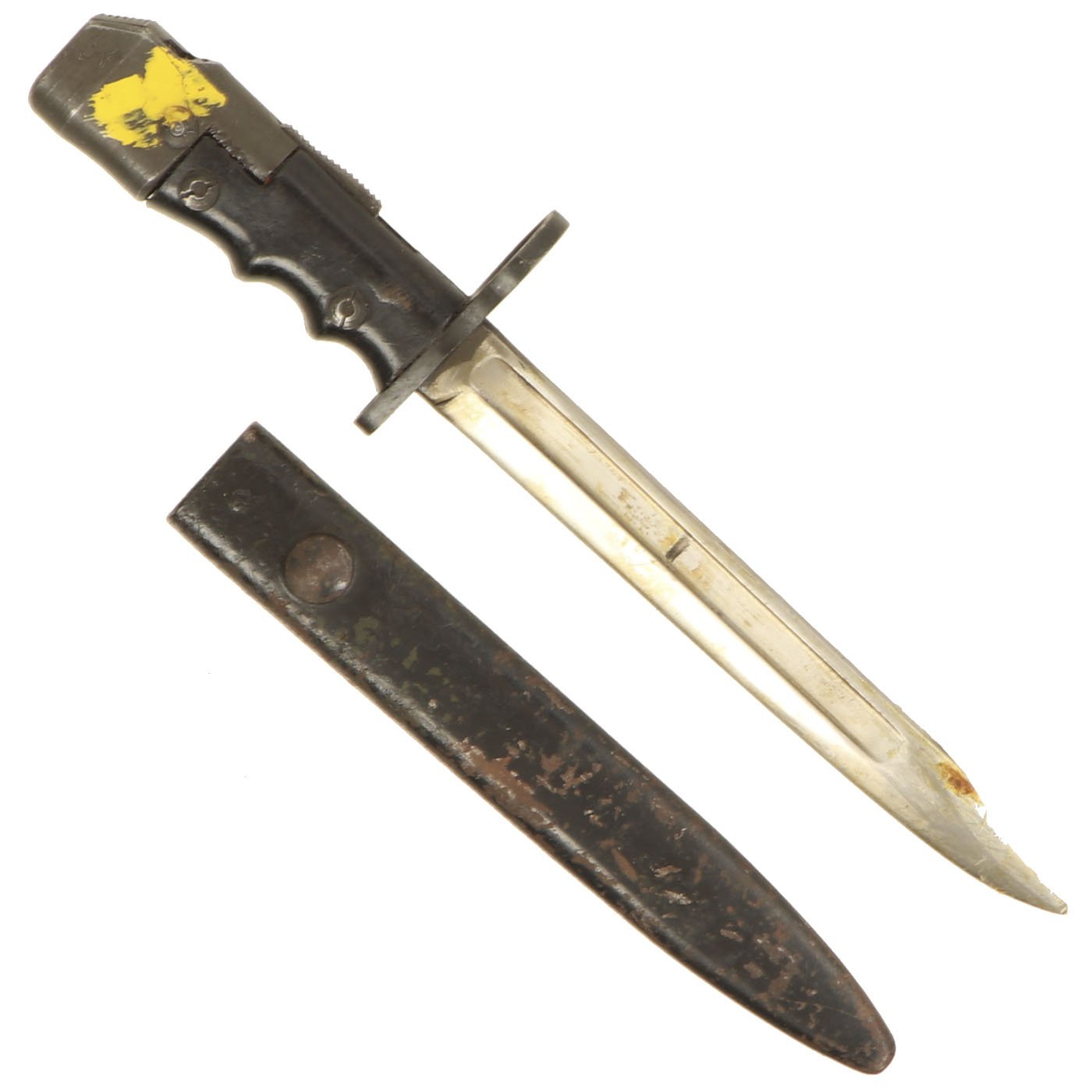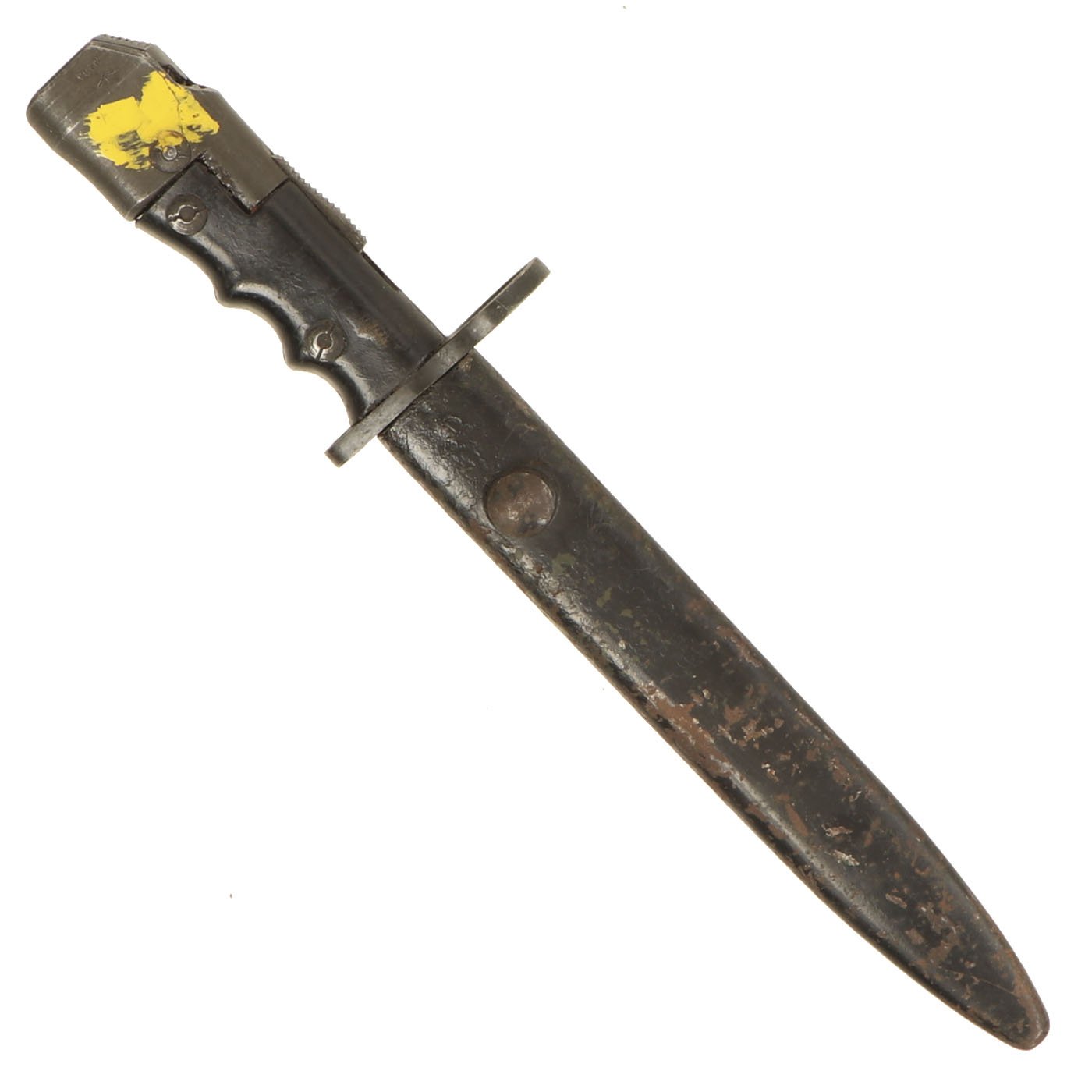 The bayonet itself has a 7 3/4 inch bright steel "bowie" style clip-point blade, with a wide fuller running down each side, as also seen on the No.5 and No.9 bayonets, with an overall length of 12 1/4 inches. It features grip scales made of a resin impregnated cloth composite, Paxolin, with deep finger grooves to make it function better as a fighting knife. However, unlike all of the other examples we have had, this has the very rare BLACK color grips. All the others are a reddish brown.