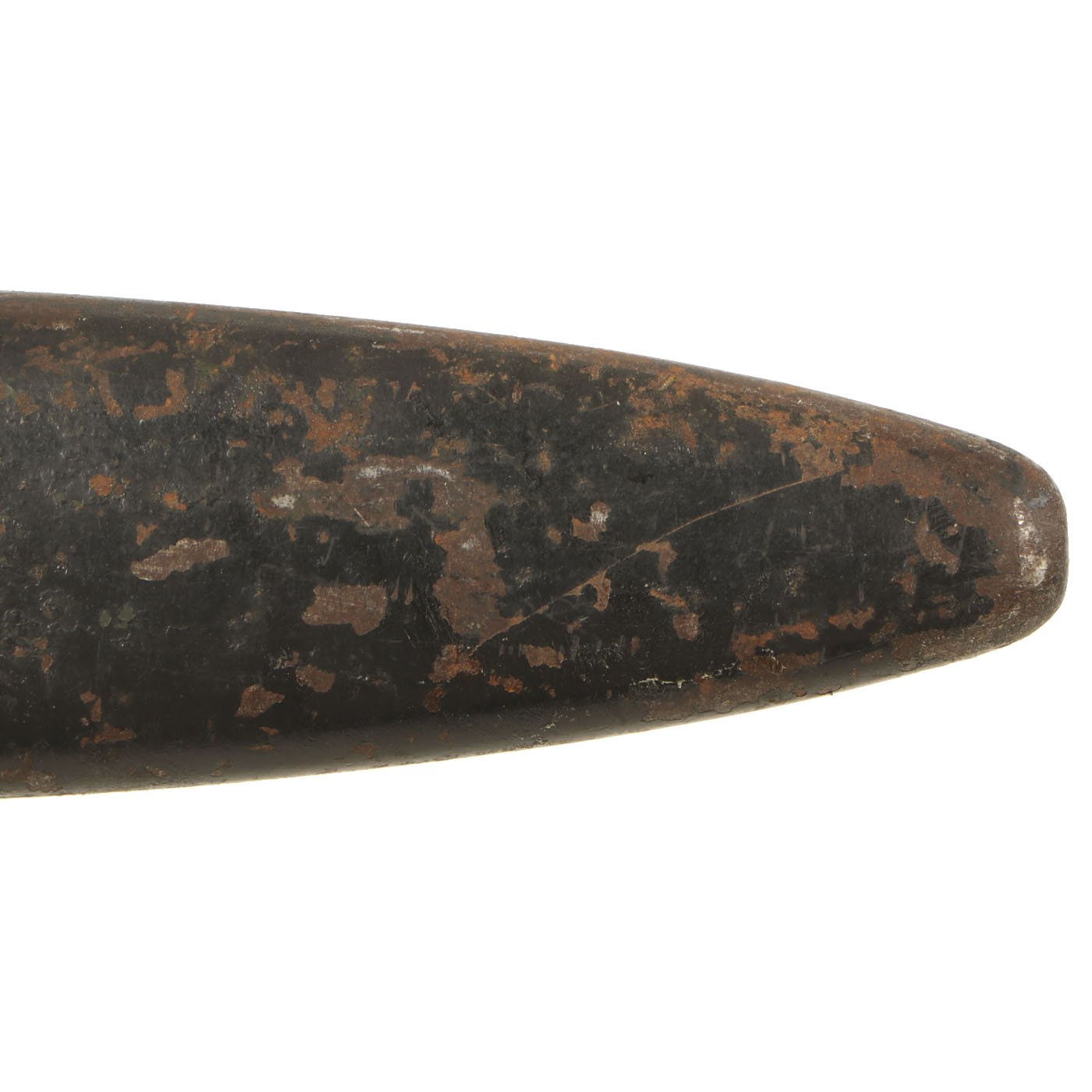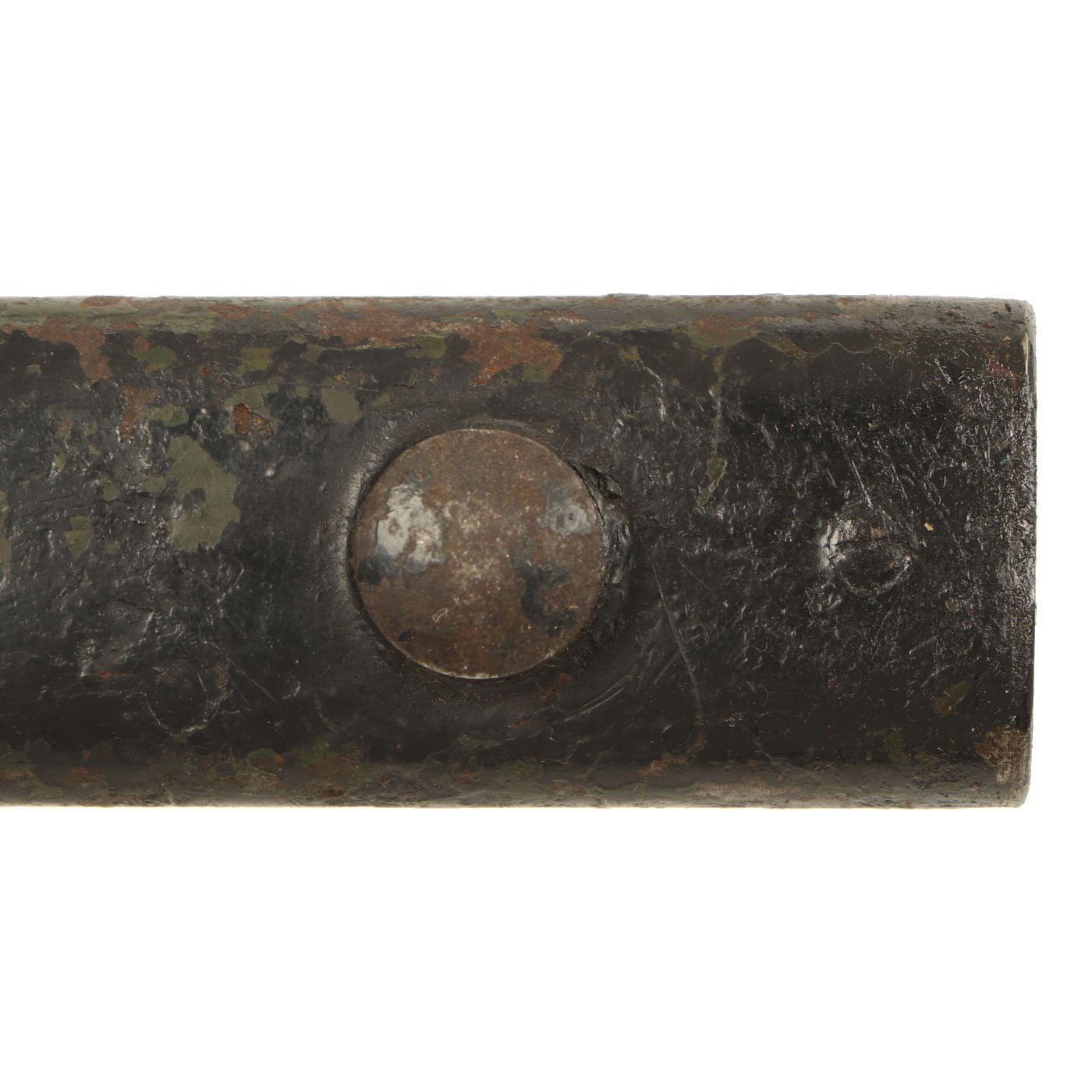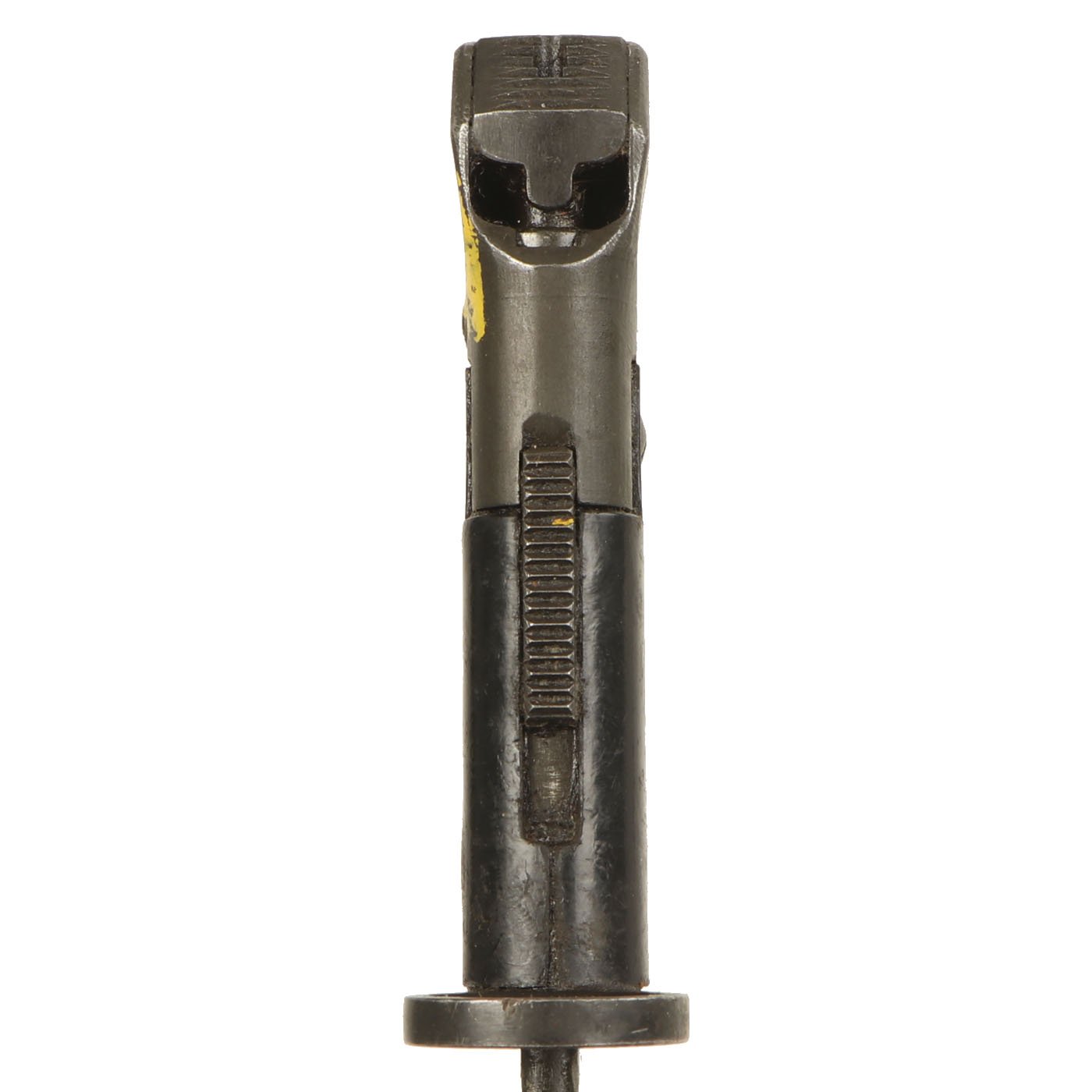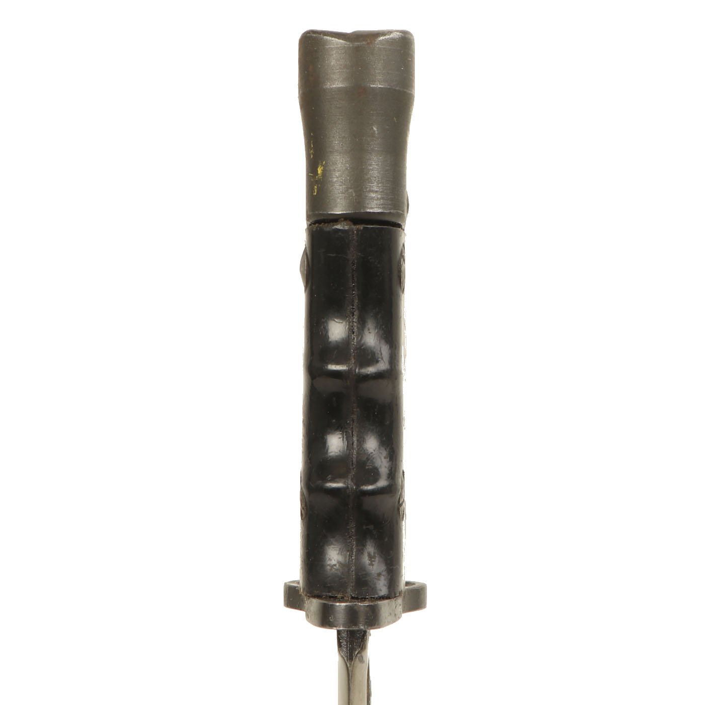 The bayonet itself has a 7 3/4 inch bright steel "bowie" style clip-point blade, with a wide fuller running down each side, as also seen on the No.5 and No.9 bayonets, with an overall length of 12 1/4 inches. It features grip scales made of a resin impregnated cloth composite, Paxolin, with deep finger grooves to make it function better as a fighting knife. However, unlike all of the other examples we have had, this has the very rare BLACK color grips. All the others are a reddish brown.