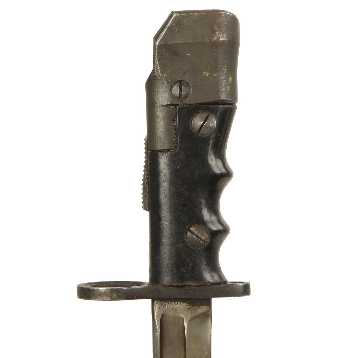 The No.7 is one of Company Director Christian Cranmer's favorite bayonets, both for it's attractive looks, and its embodiment of the adage "that a camel is a horse, as designed by committee." It was designed to replace the much maligned No.4 Spike bayonet with a new design that featured the popular "Bowie" blade of the No.5 Jungle Carbine bayonet. It would additionally also be able to function as a fighting knife. While it met those requirements in an ingenious way, it proved to be cumbersome in practice, and was only ever used for ceremonial purposes.