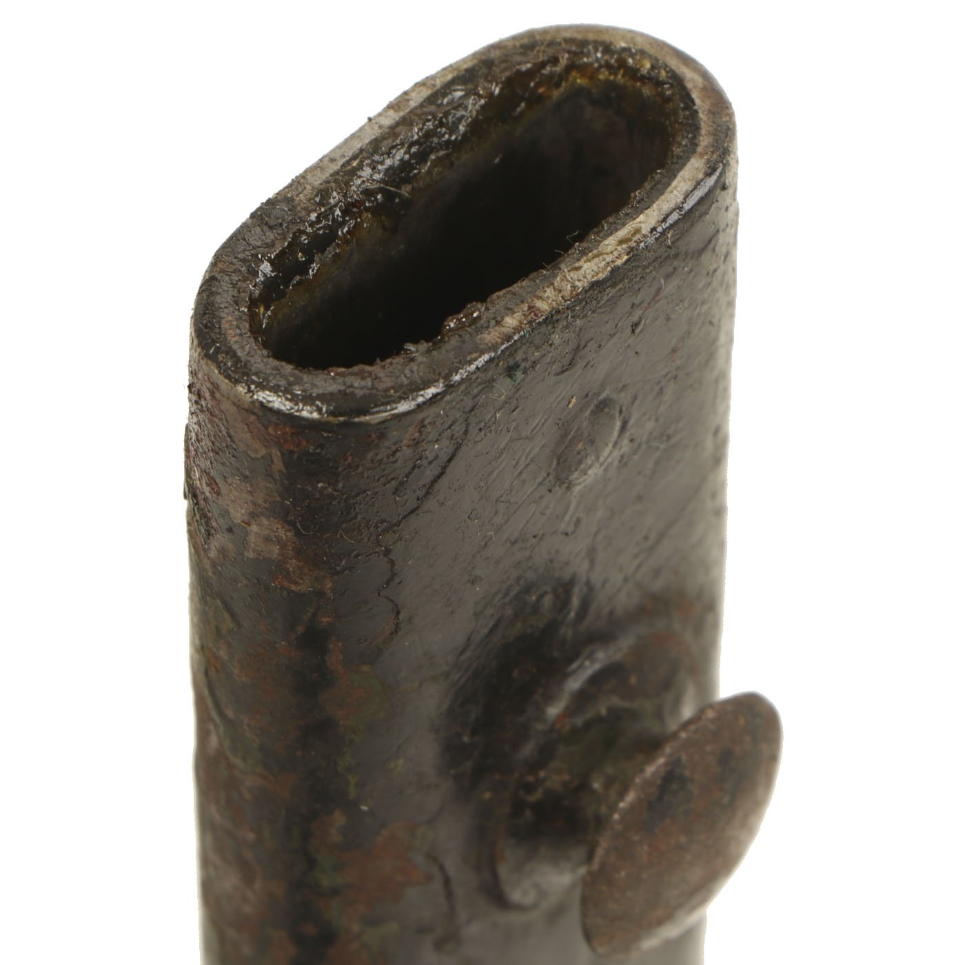 The bayonet is mounted on a rotating pommel, which enabled it to be mounted to the front of the gun. The large barrel ring did not actually fit over the barrel at all, and was intended as a cross guard, albeit one that would not impede firing. Comes complete with a correct steel-throated scabbard, which is painted, and looks to possibly pre-date the bayonet.