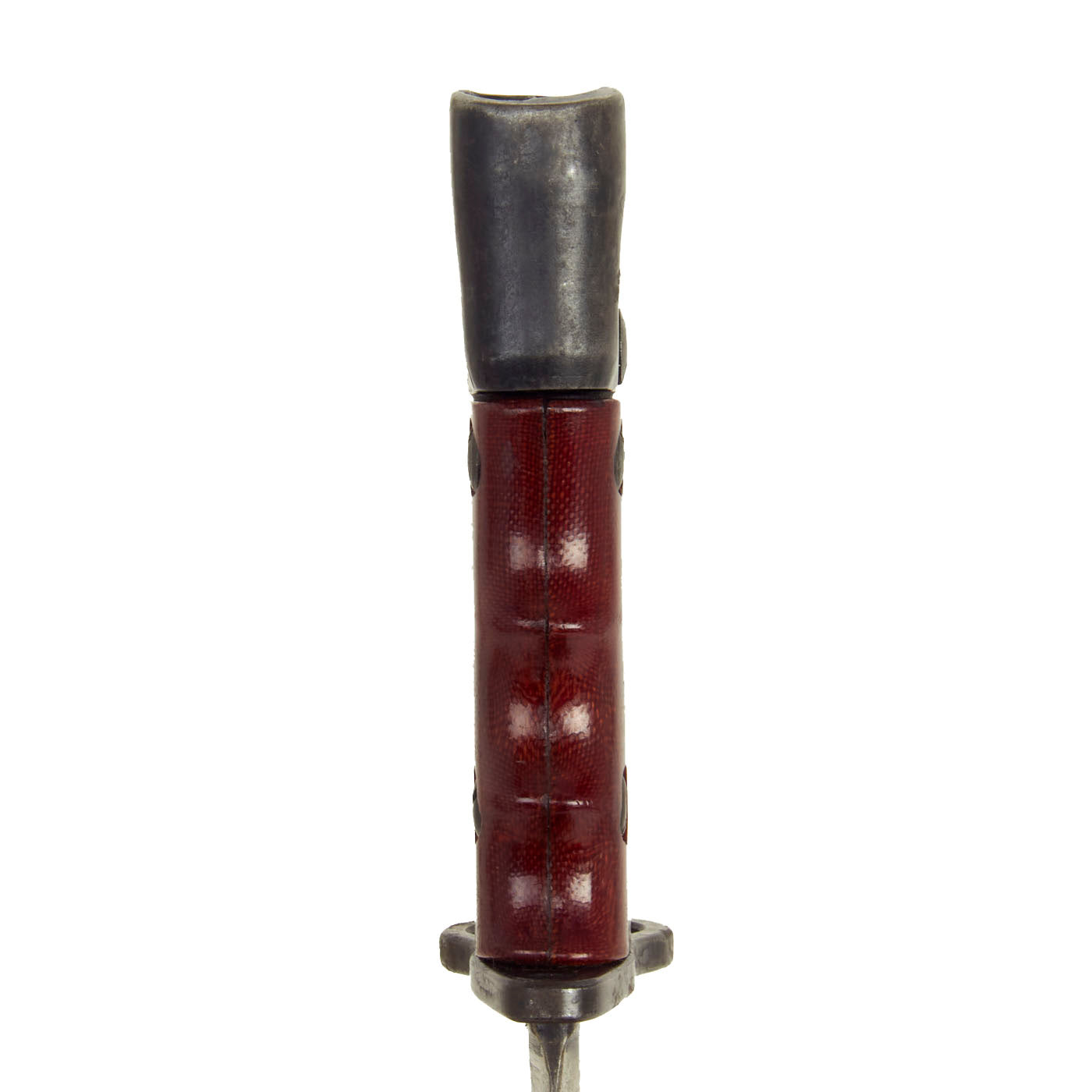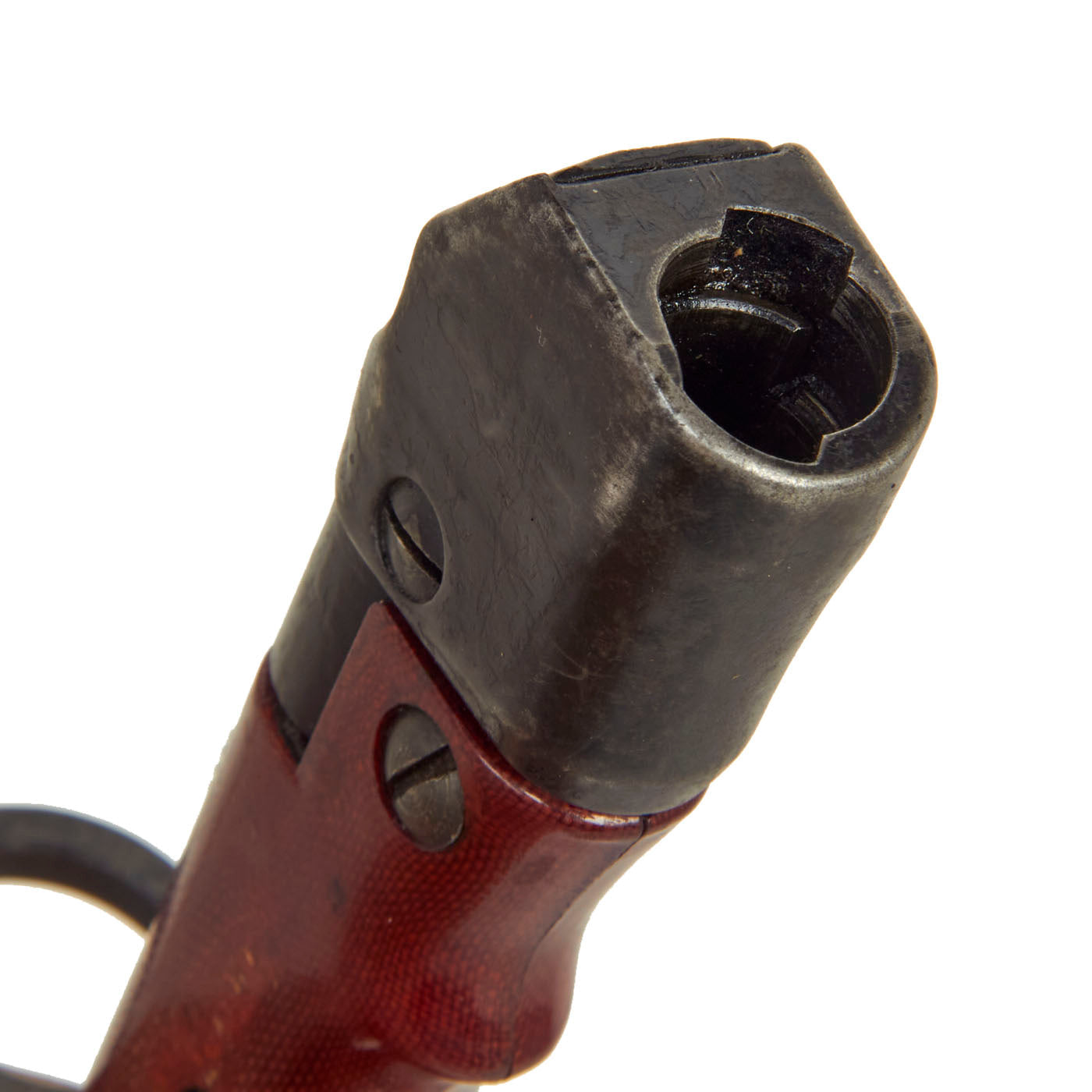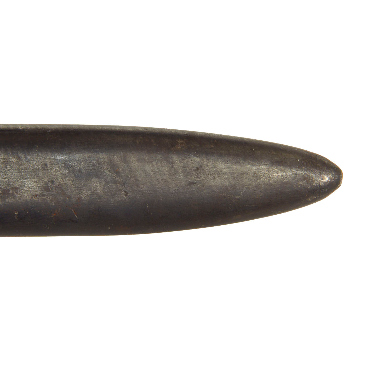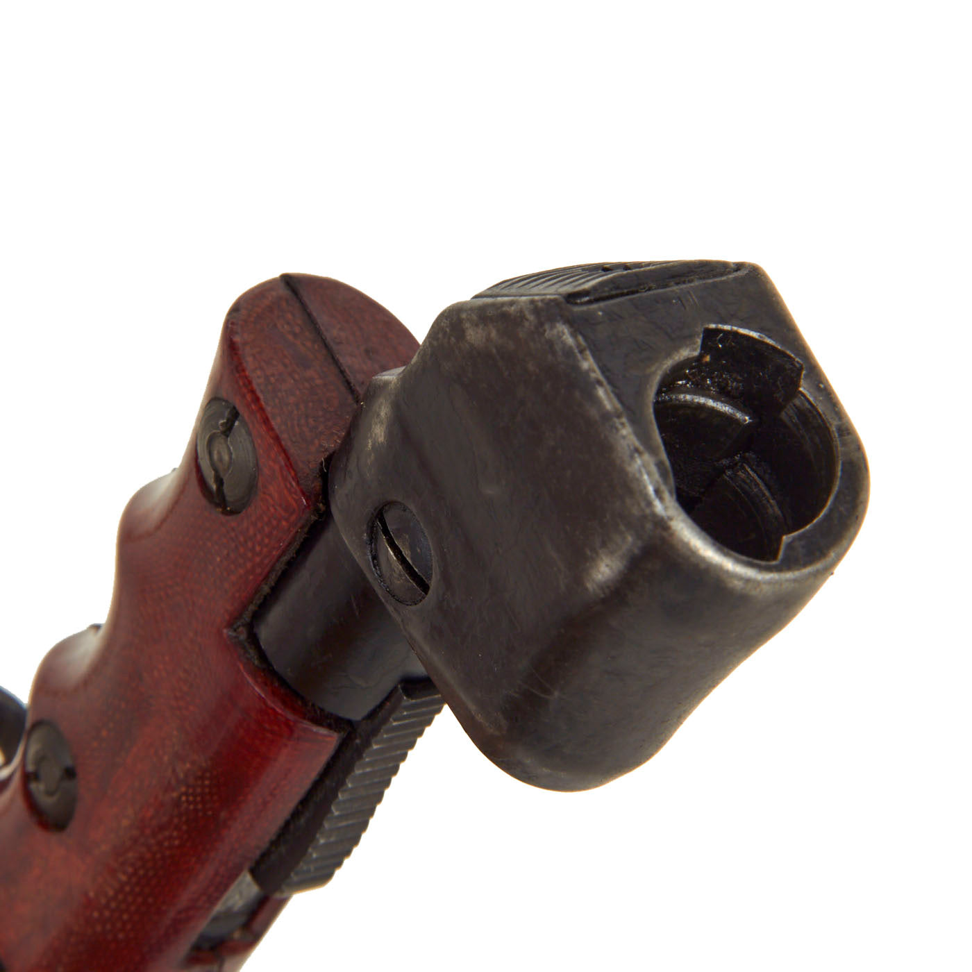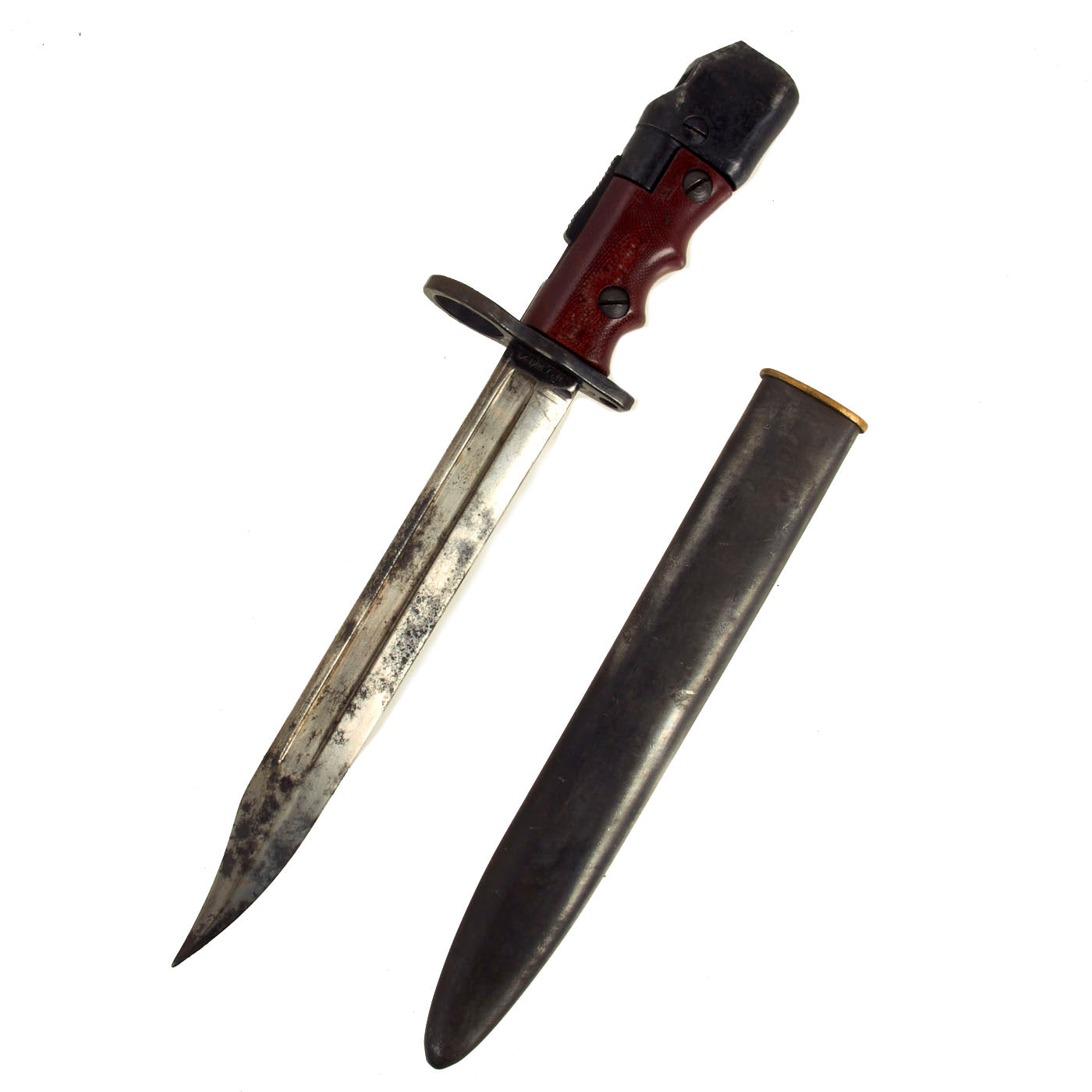 The bayonet itself has a 7 3/4 inch bright steel "bowie" style clip-point blade, with a wide fuller running down each side, as also seen on the No.5 and No.9 bayonets, with an overall length of 12 1/4 inches. It features grip scales made of a resin impregnated cloth composite, Paxolin, with deep finger grooves to make it function better as a fighting knife. Like most we have seen, this example has a reddish color to the grip.