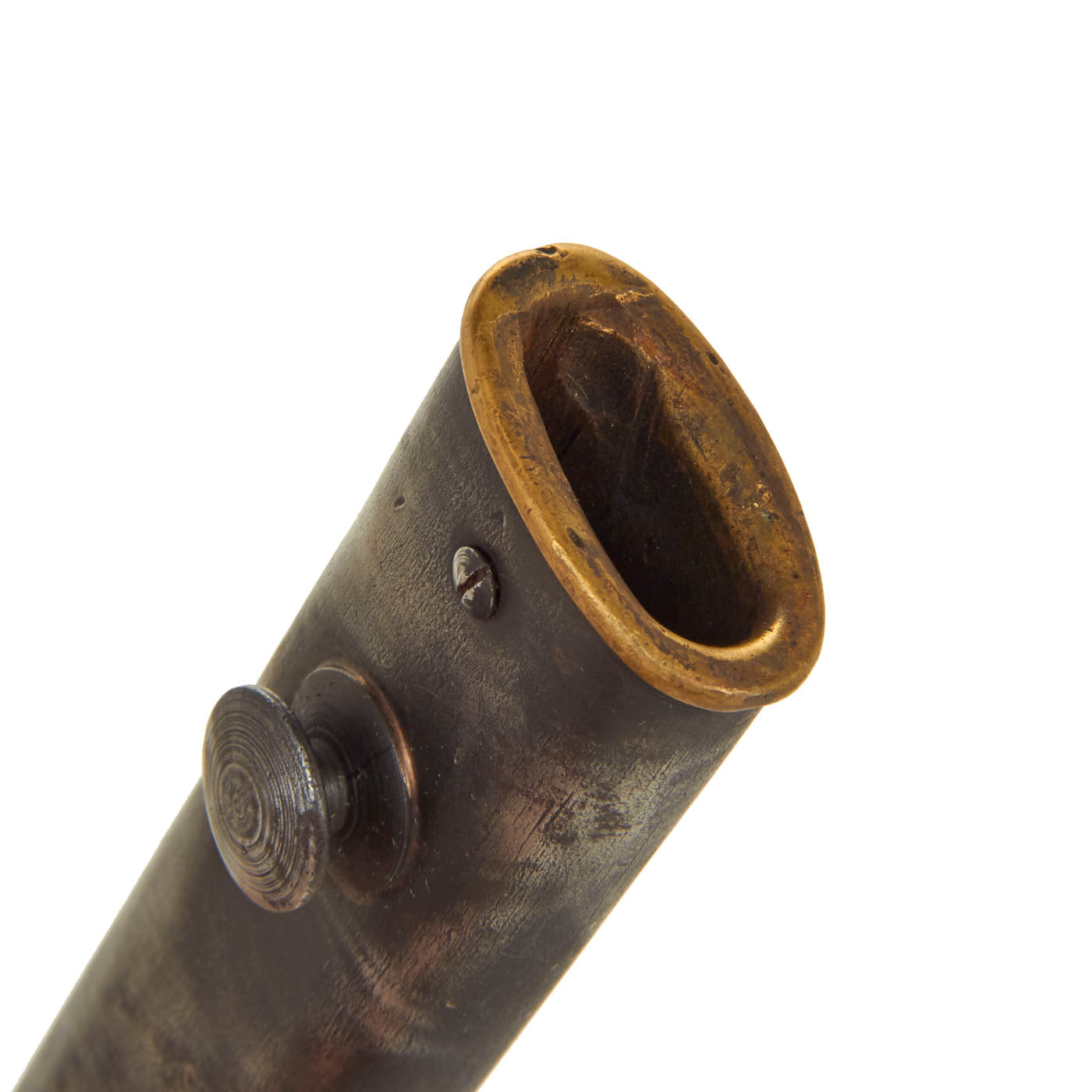 The bayonet is mounted on a rotating pommel, which enables it to be mounted to the front of the gun. The large barrel ring did not actually fit over the barrel at all, and was intended as a cross guard, albeit one that would not impede firing. Condition is very good, with an overall lightly stained patina on the steel blade.