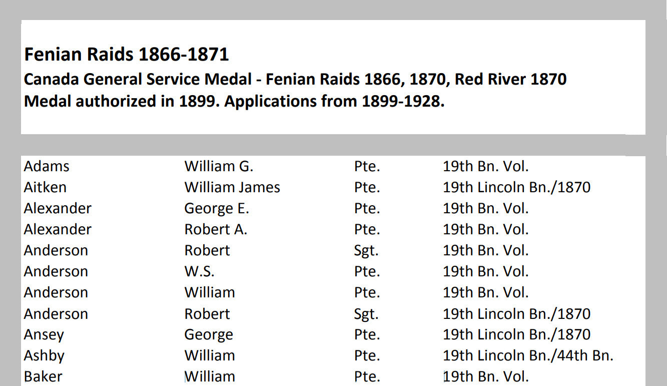 In response to the Fenian Raids, a temporary battalion-sized composite unit was formed in 1866 at Thorold, Ontario. It consisted of companies from Stratford, Chatham, Ingersoll, St. Thomas and Guelph.