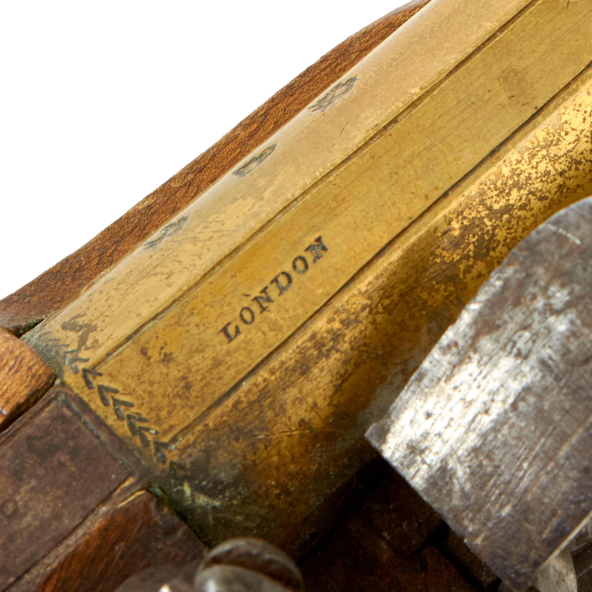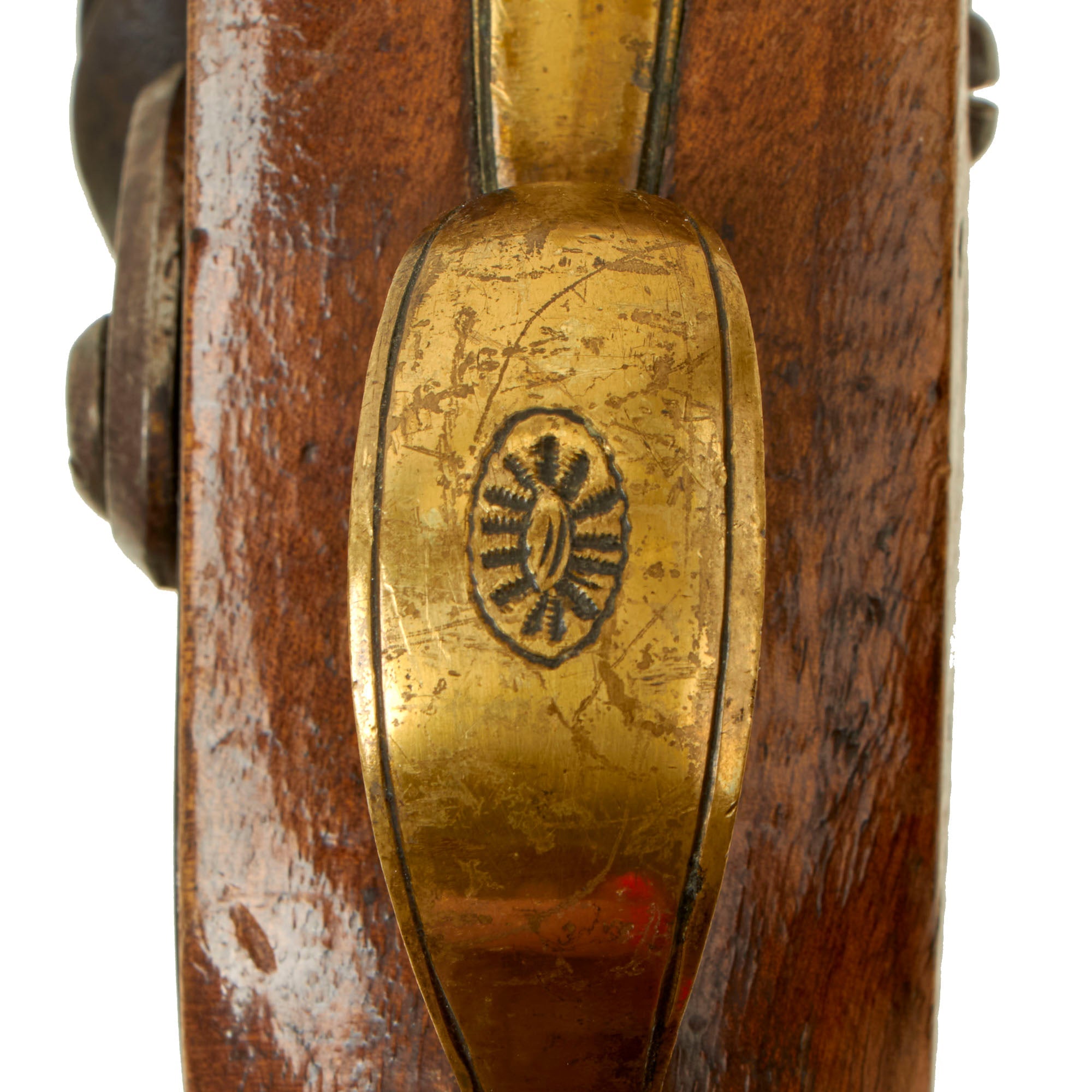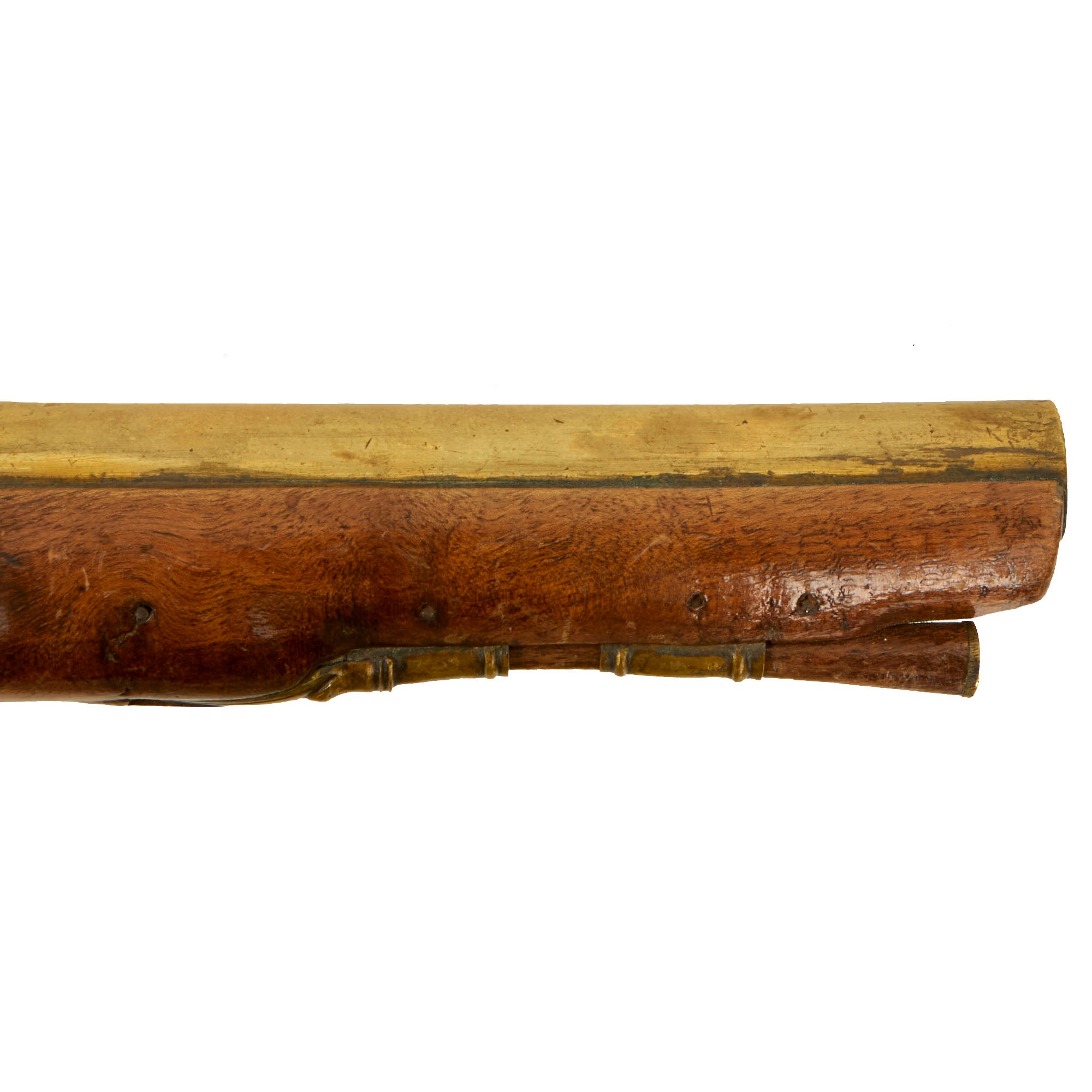The pistol is a very nice relatively plain brass mounted pistol fitted with a 8 ½ inch long heavy round brass barrel, and measuring 14 ½ inches in overall length. Unlike many that we see, it is still in the original flintlock configuration, though it is an early style lock, without a frizzen reinforcement bridle. The breech of the barrel bears the CROWN / CROSSED SCEPTERS / BPC "proof" and CROWN / CROSSED SCEPTERS / V "viewed" marks from the English city of Birmingham. These are the correct markings for 1813 and later manufacture, indicating this was made sometime during 1813-1821. There is an additional mark between the proofs that may be a maker mark.