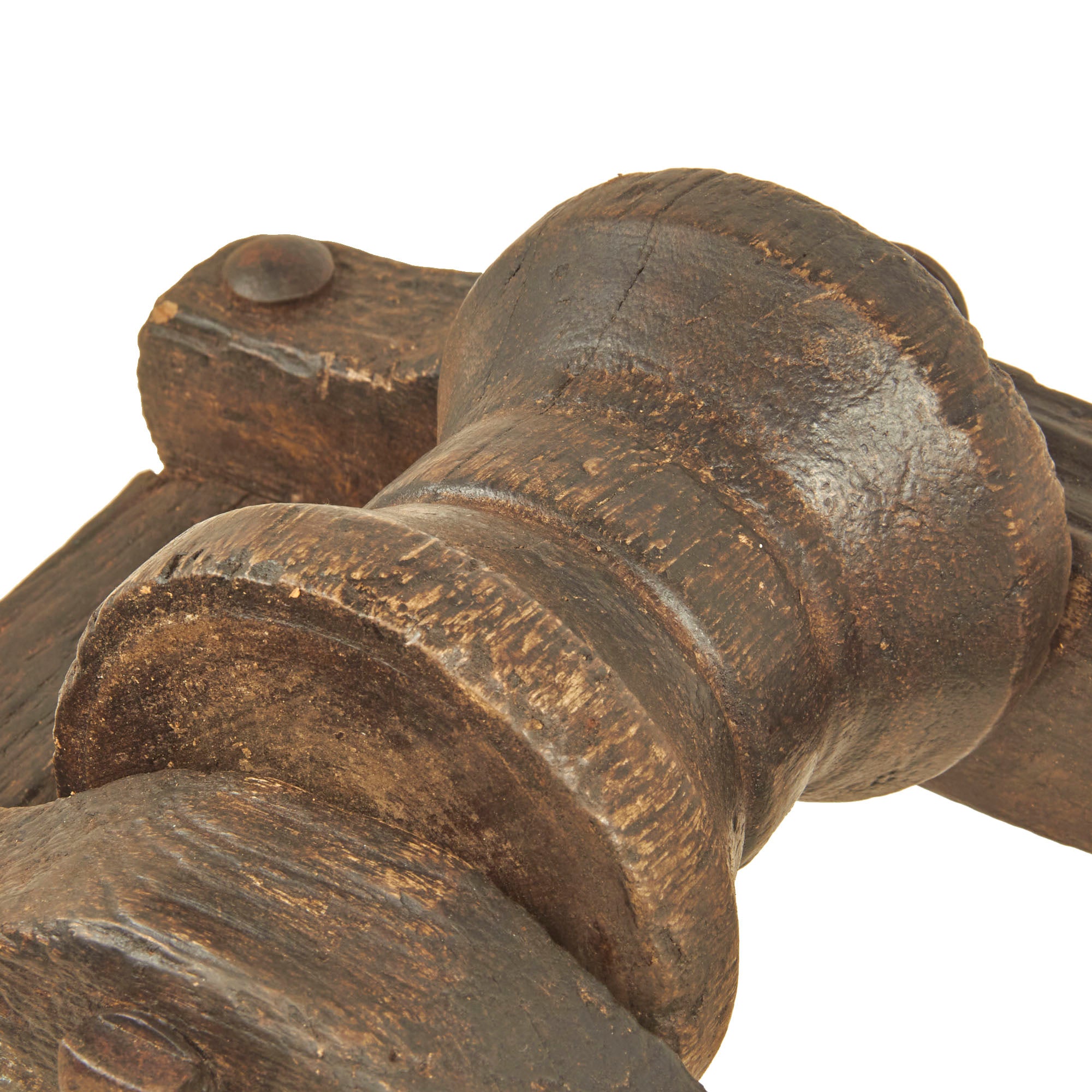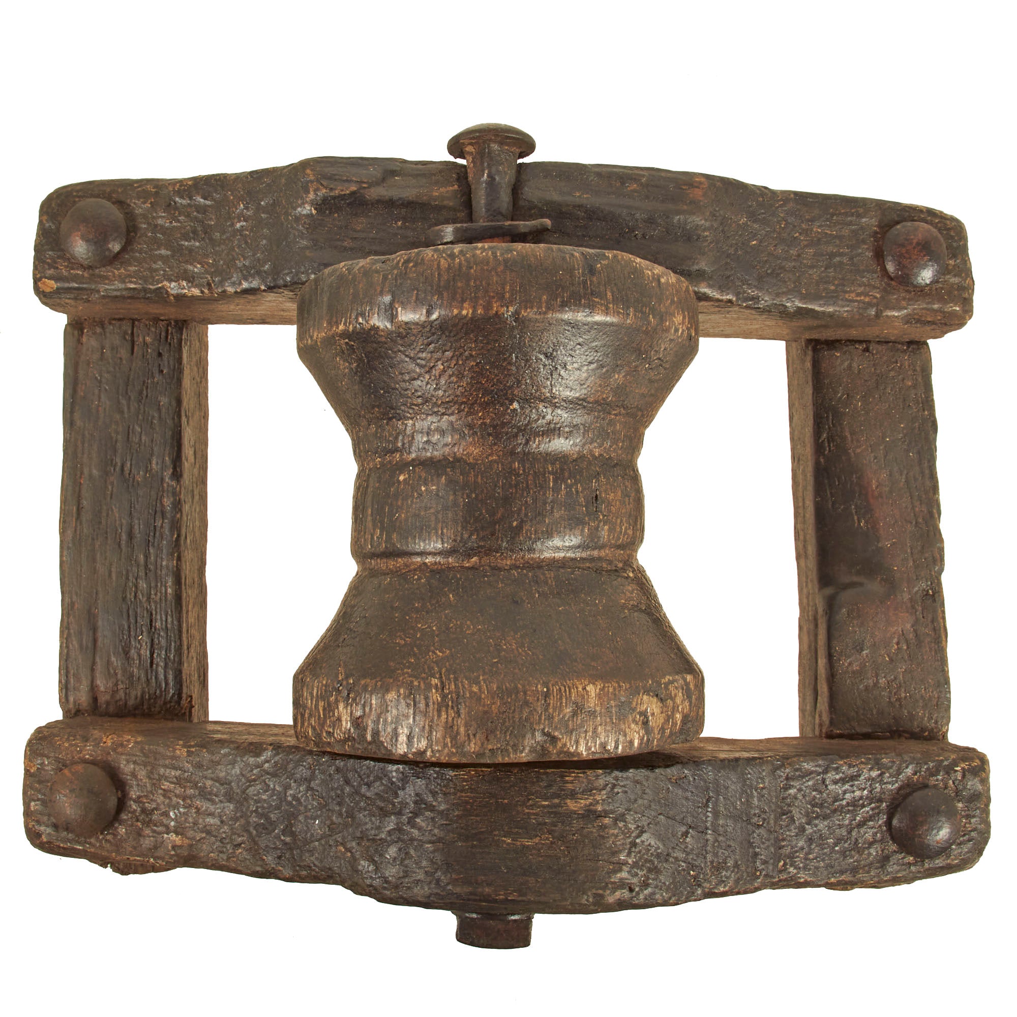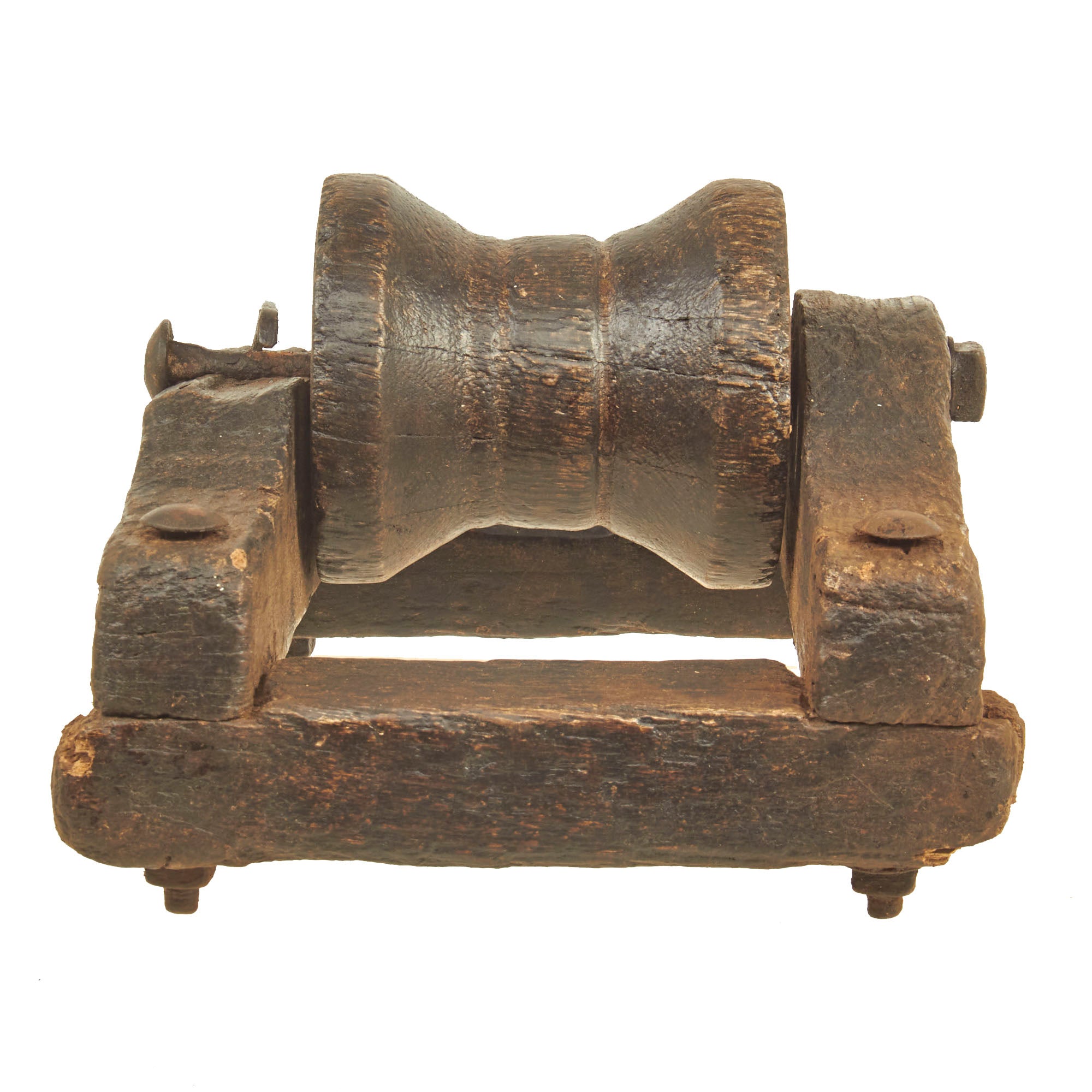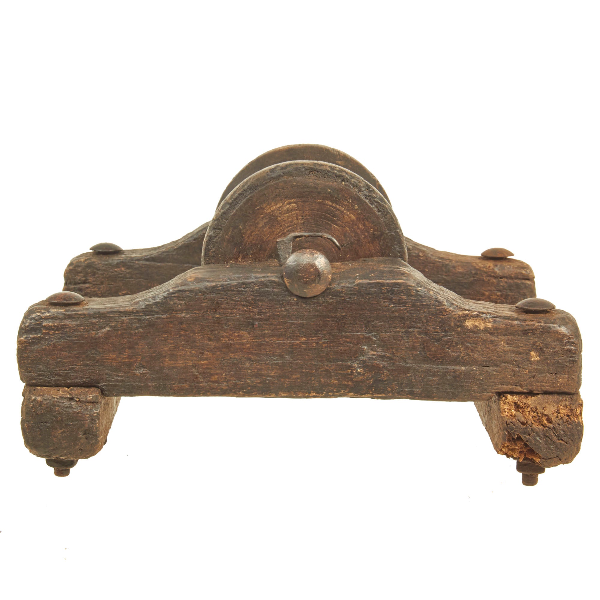 This is a lovely aged oak pulley wheel from the ship, still in what looks to be the original oak bracket with cross bolt that it was installed in. It shows wear consistent with ropes having been passed through it, and even has a broken off portion around the axis pin on one side, which was "repaired" with a piece of bent iron. The mount and pulley both show age, and there is some damage to one corner from wood deterioration. The iron nuts and bolts are rust frozen, and clearly very old. The mounting measures approximately 13" x 10", and the pulley wheel itself is 6" in diameter.
