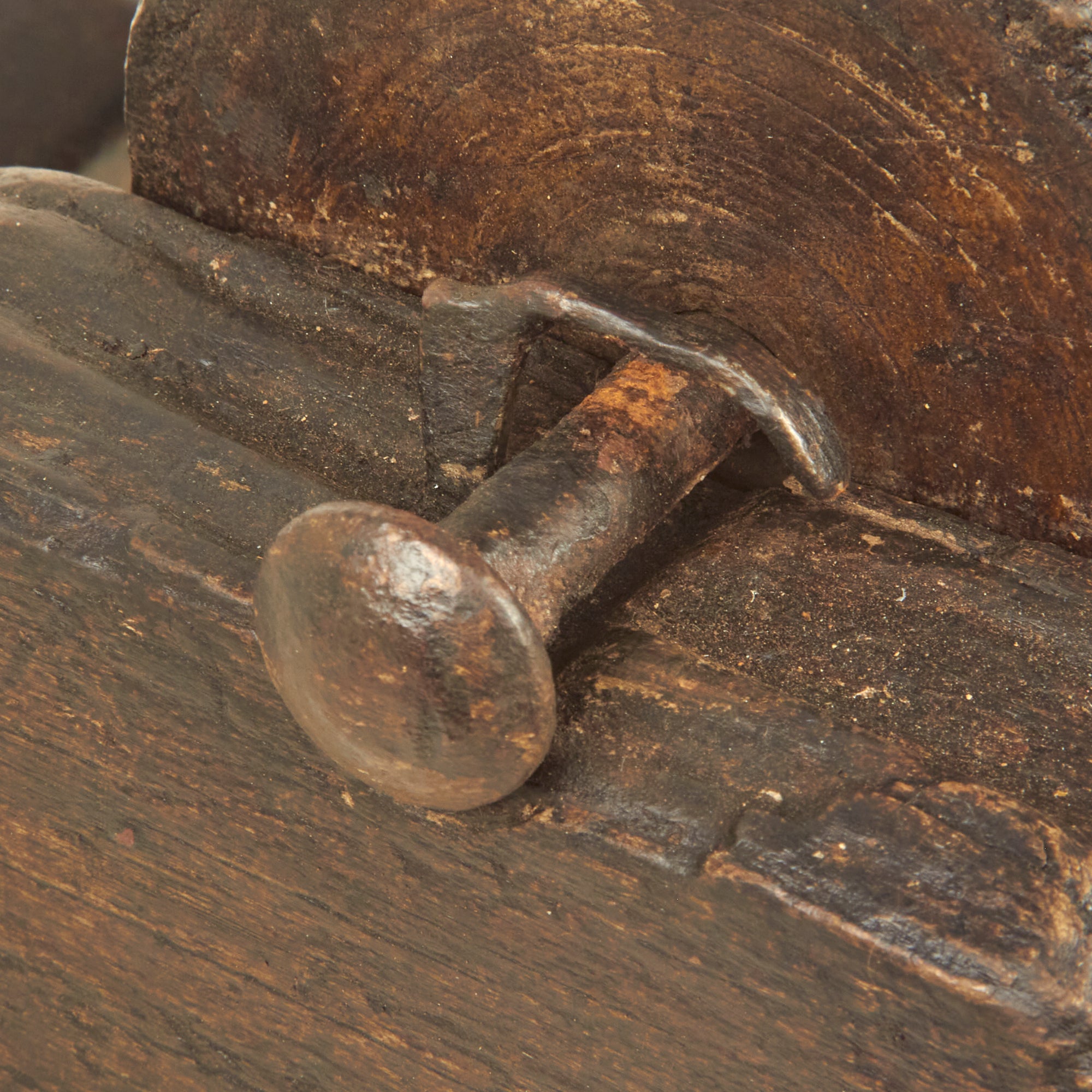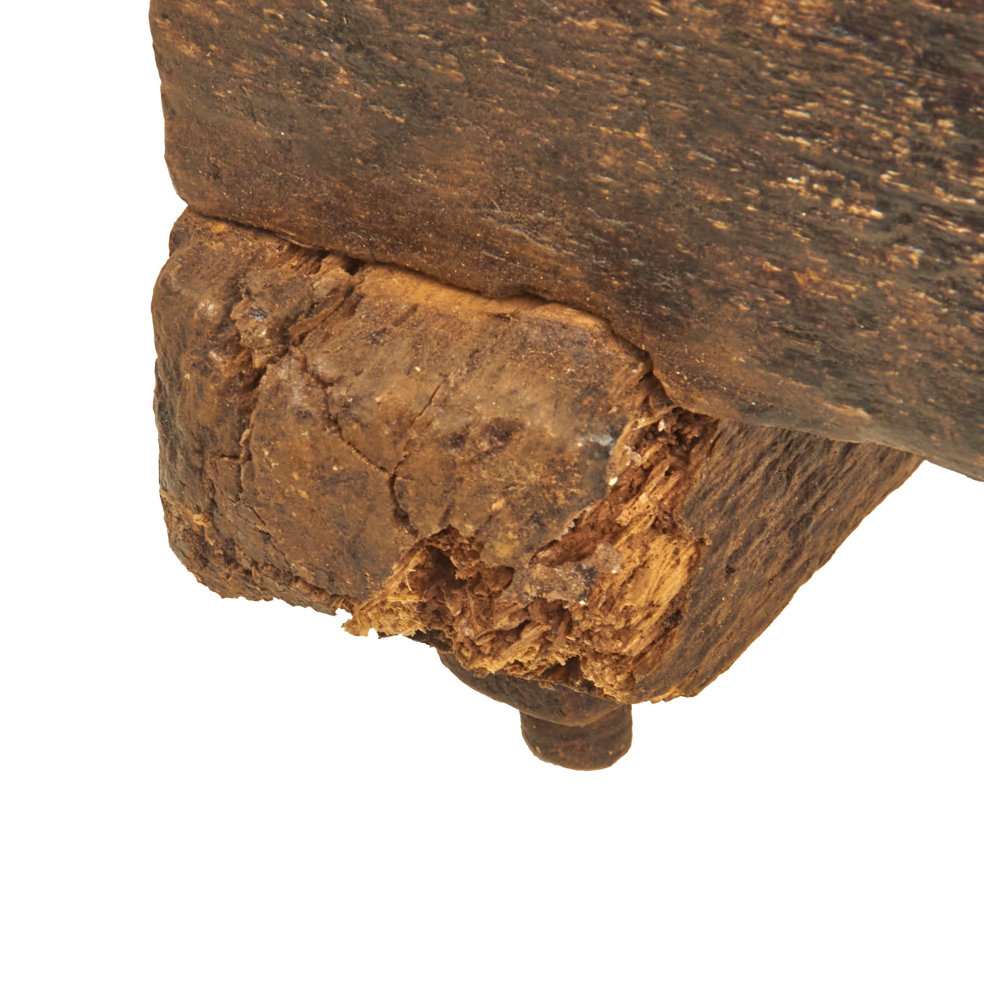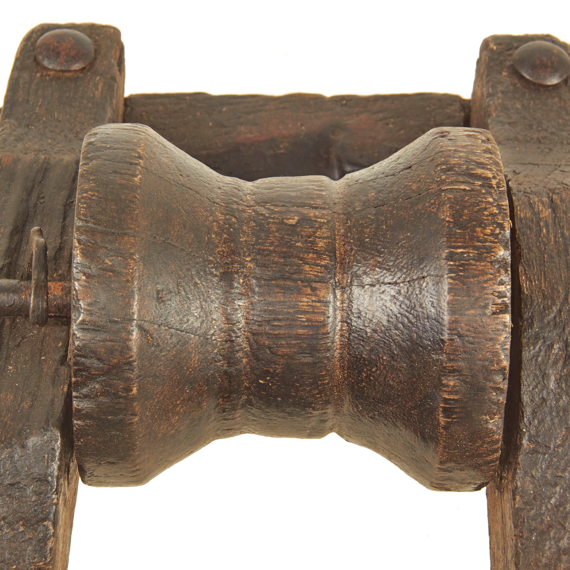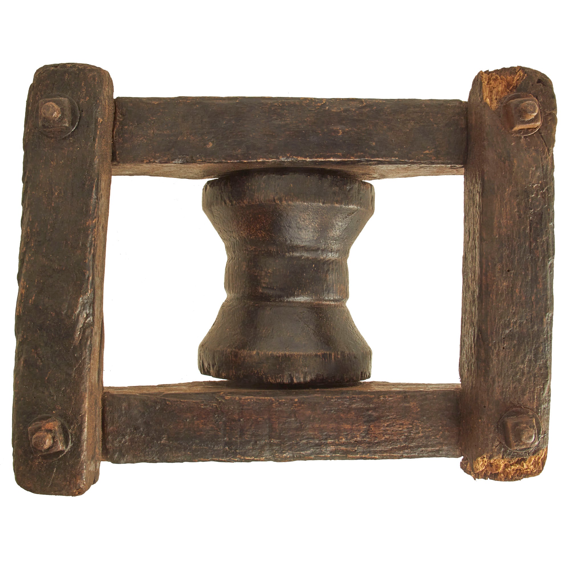 This is a lovely aged oak pulley wheel from the ship, still in what looks to be the original oak bracket with cross bolt that it was installed in. It shows wear consistent with ropes having been passed through it, and even has a broken off portion around the axis pin on one side, which was "repaired" with a piece of bent iron. The mount and pulley both show age, and there is some damage to one corner from wood deterioration. The iron nuts and bolts are rust frozen, and clearly very old. The mounting measures approximately 13" x 10", and the pulley wheel itself is 6" in diameter.