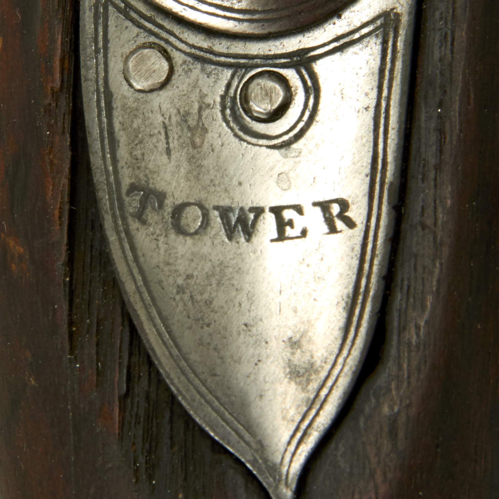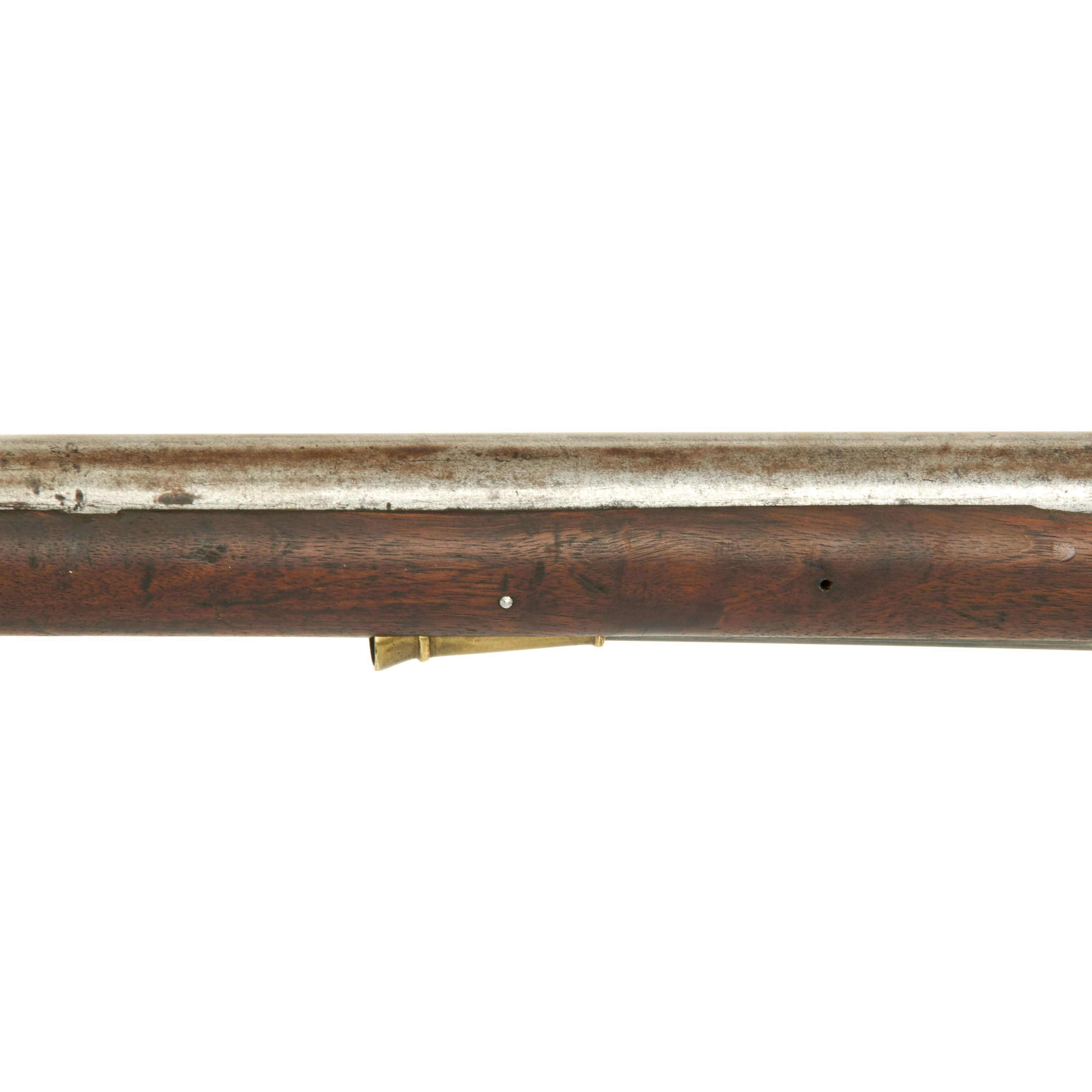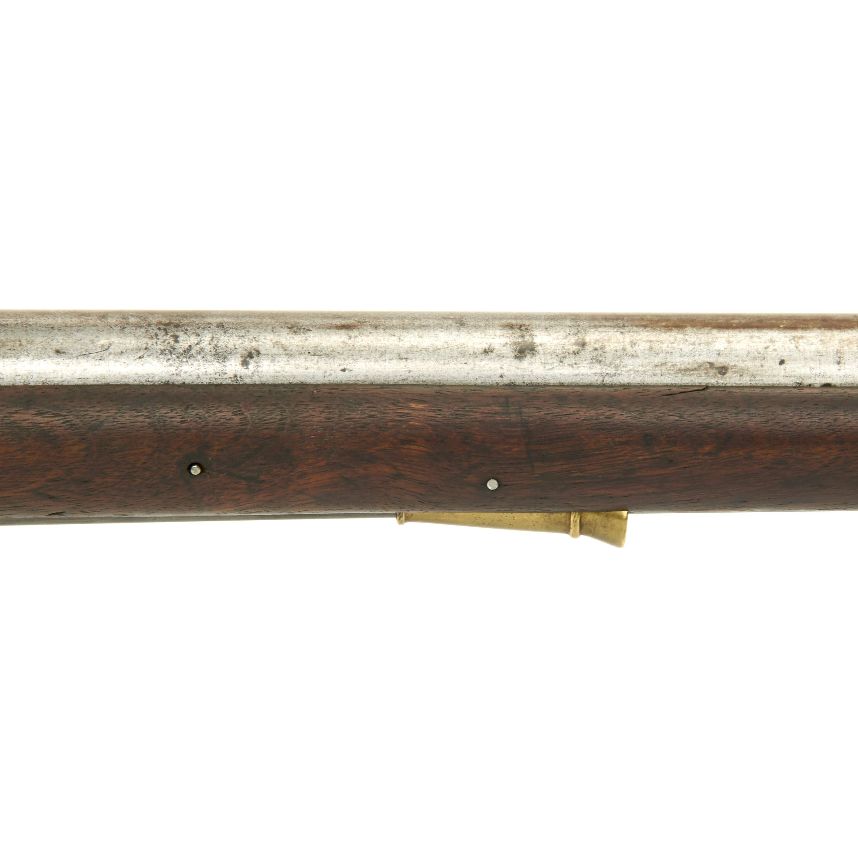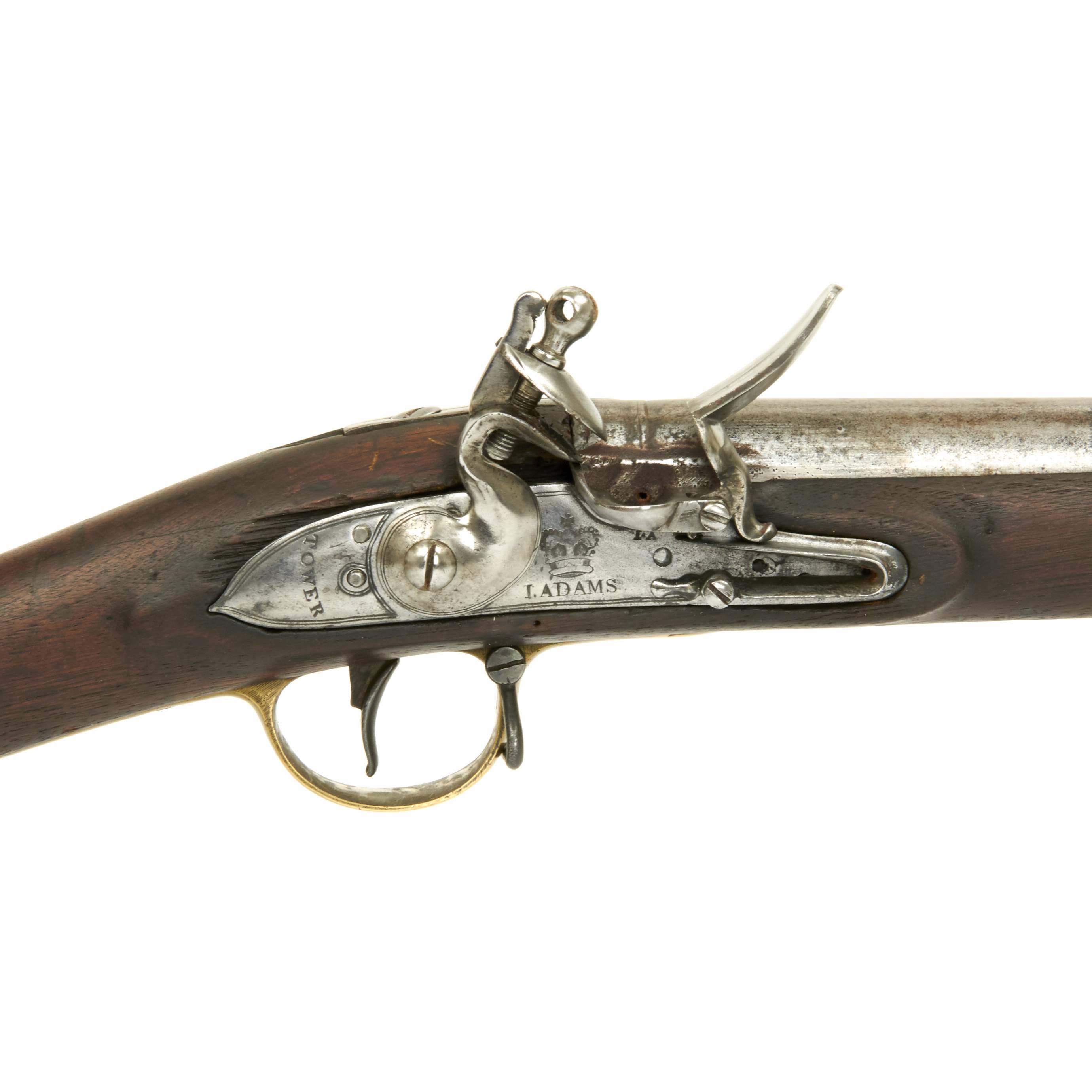 Cal. 65 Fine officer’s fusil with 40? round barrel. Barrel is marked with two British proofs. Top tang is flat with tapered edges and a square tail. Lockplate is marked in front of hammer I. ADAMS and TOWER and is 6? long, slightly curved with a pointed tail and a bridled frizzen. Mounted in a 1-pc walnut stock with brass furniture, three pipes and a button head ramrod. Sideplate is oval serpentine brass with a brass trigger guard and butt plate. Trigger guard has a simple, undecorated pineapple shaped finial. Across the lower tang of the brass butt plate is the numeral 50 for the 50th Regiment of Foot.