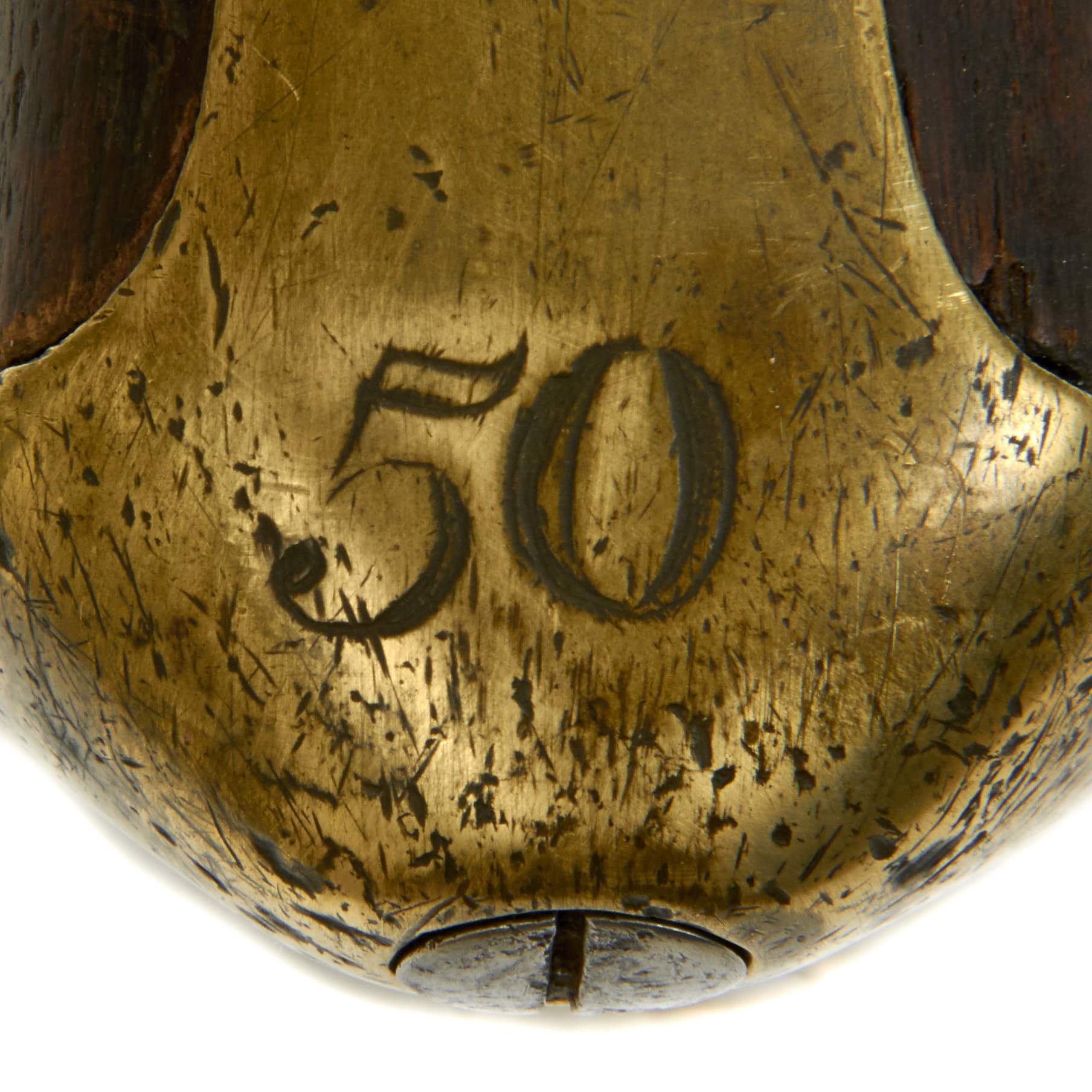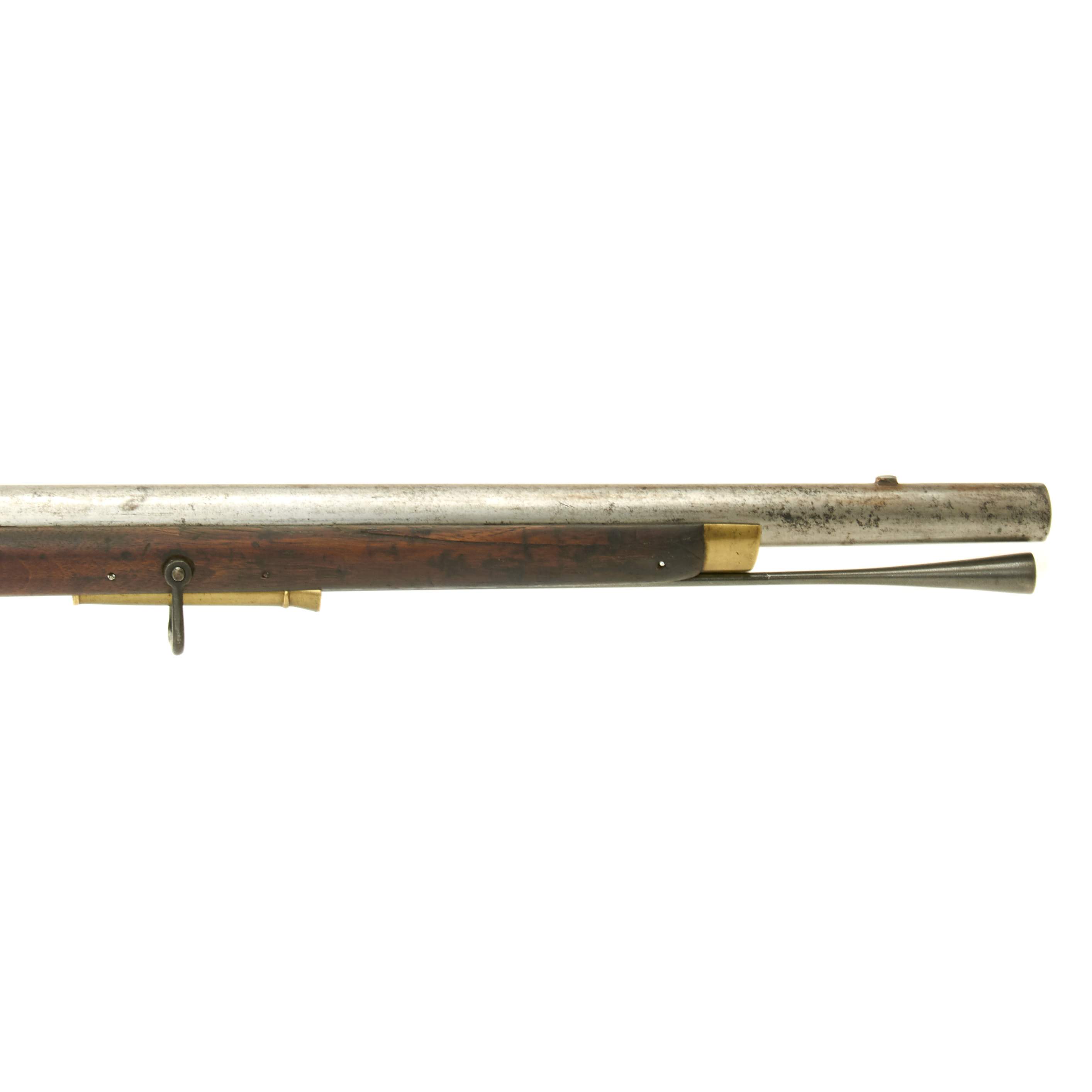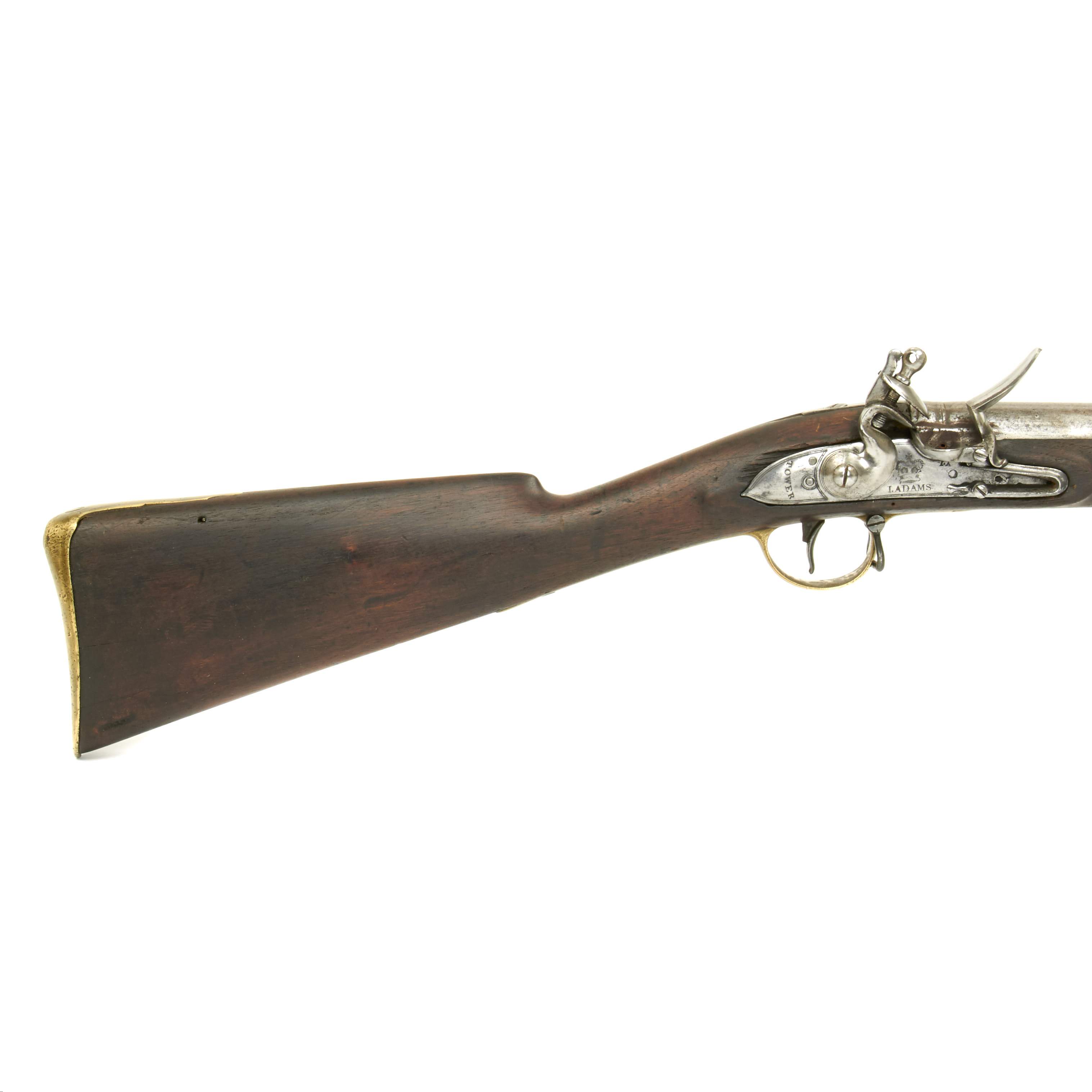 Cal. 65 Fine officer’s fusil with 40? round barrel. Barrel is marked with two British proofs. Top tang is flat with tapered edges and a square tail. Lockplate is marked in front of hammer I. ADAMS and TOWER and is 6? long, slightly curved with a pointed tail and a bridled frizzen. Mounted in a 1-pc walnut stock with brass furniture, three pipes and a button head ramrod. Sideplate is oval serpentine brass with a brass trigger guard and butt plate. Trigger guard has a simple, undecorated pineapple shaped finial. Across the lower tang of the brass butt plate is the numeral 50 for the 50th Regiment of Foot.