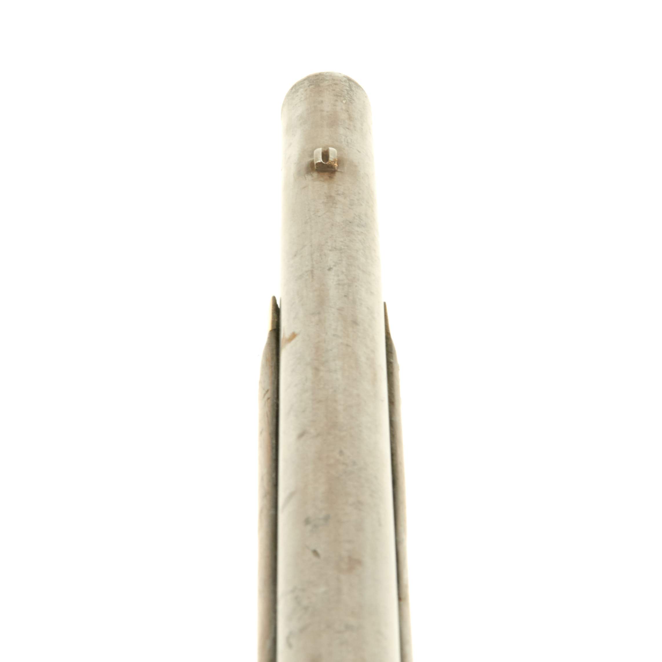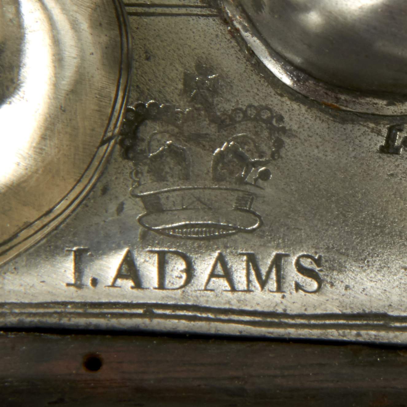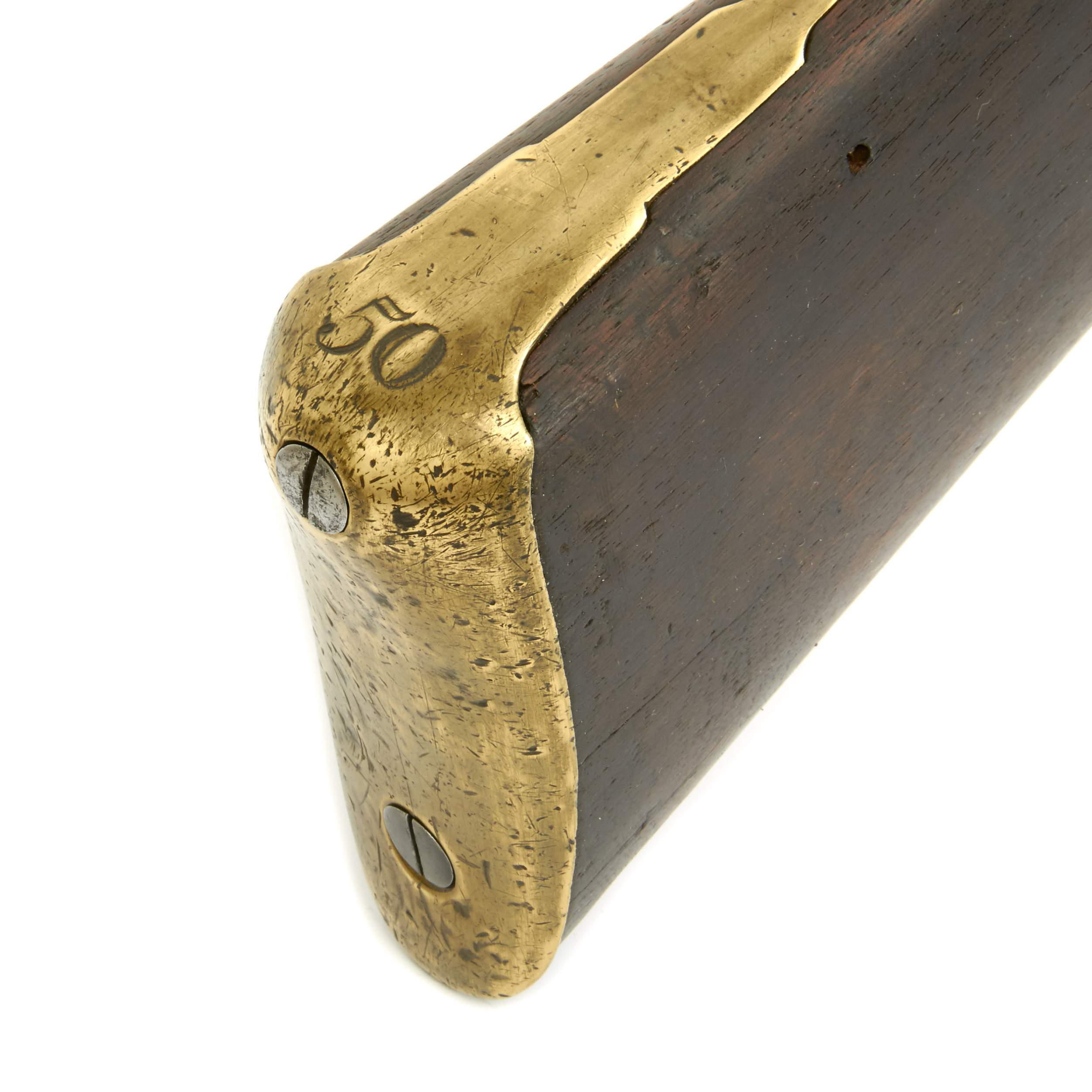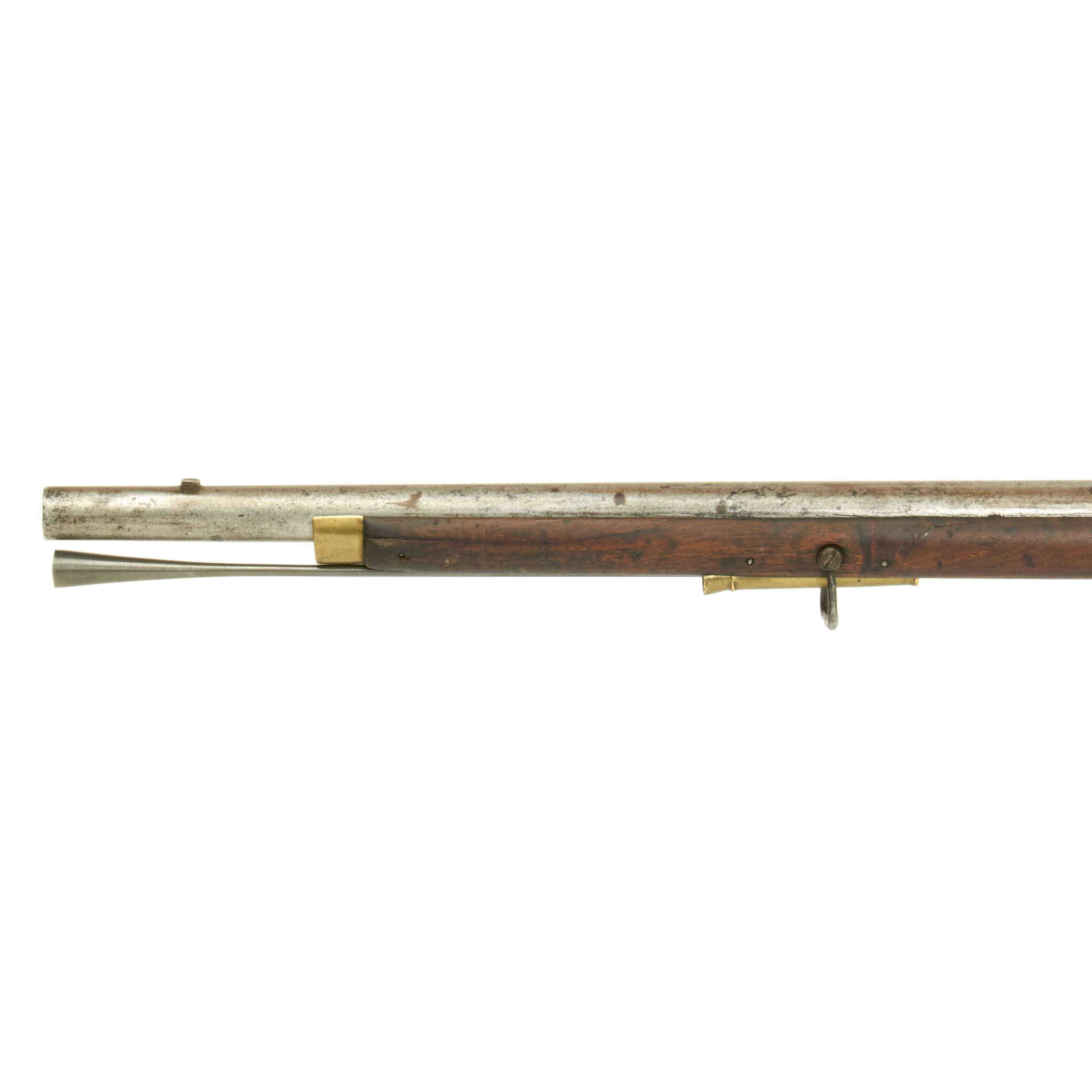Cal. 65 Fine officer’s fusil with 40? round barrel. Barrel is marked with two British proofs. Top tang is flat with tapered edges and a square tail. Lockplate is marked in front of hammer I. ADAMS and TOWER and is 6? long, slightly curved with a pointed tail and a bridled frizzen. Mounted in a 1-pc walnut stock with brass furniture, three pipes and a button head ramrod. Sideplate is oval serpentine brass with a brass trigger guard and butt plate. Trigger guard has a simple, undecorated pineapple shaped finial. Across the lower tang of the brass butt plate is the numeral 50 for the 50th Regiment of Foot.