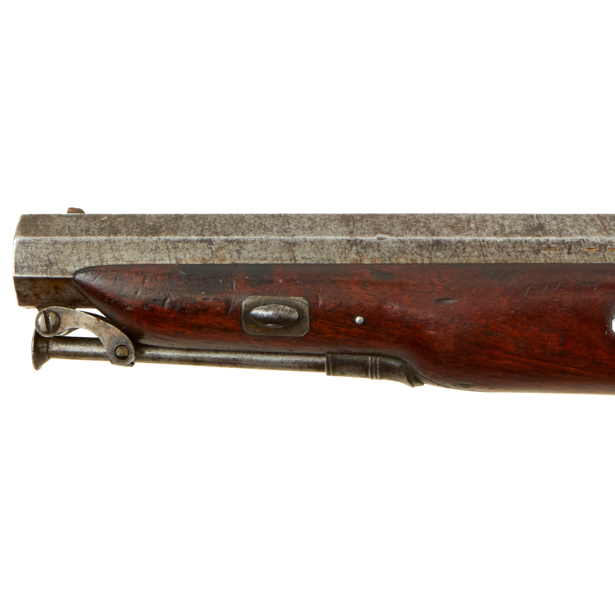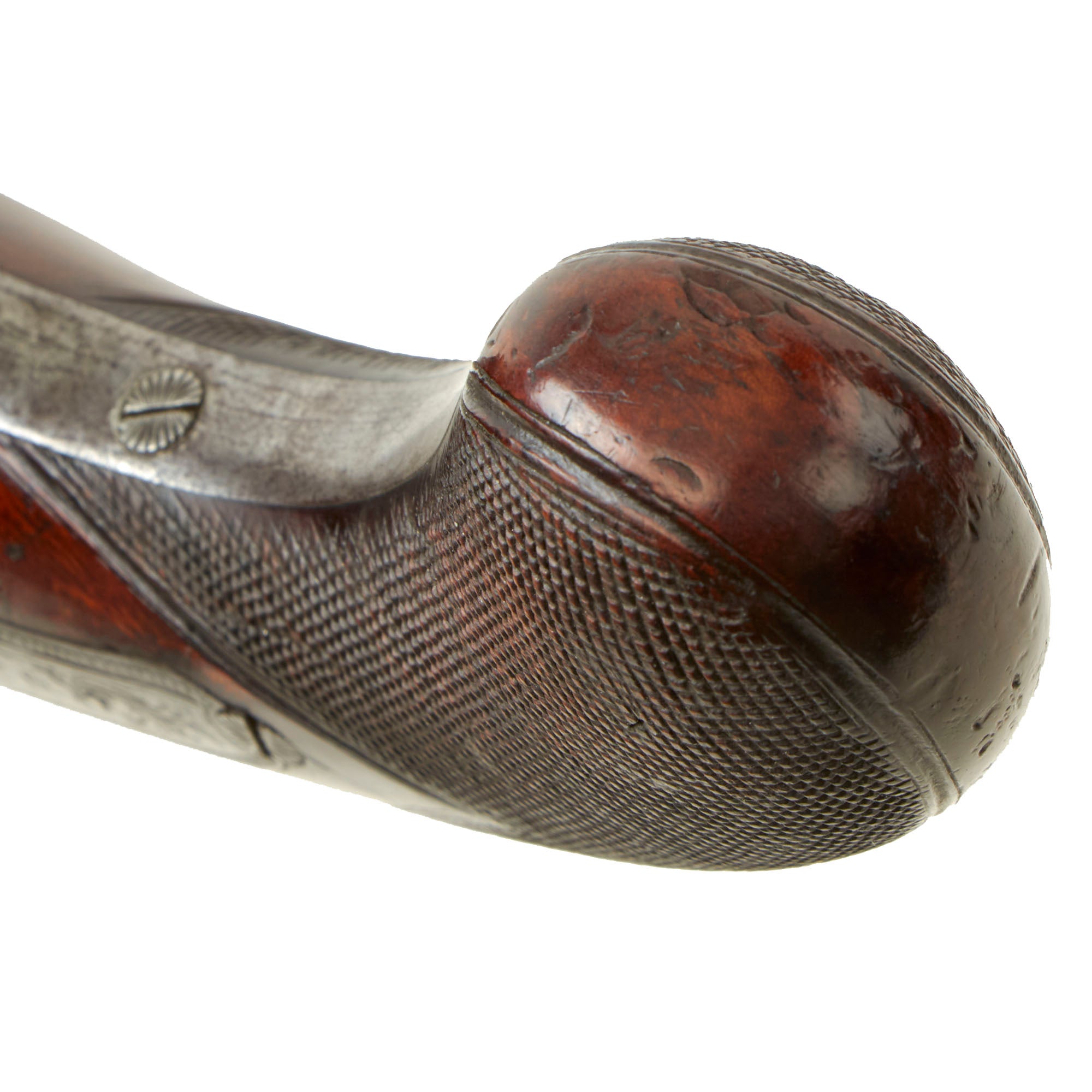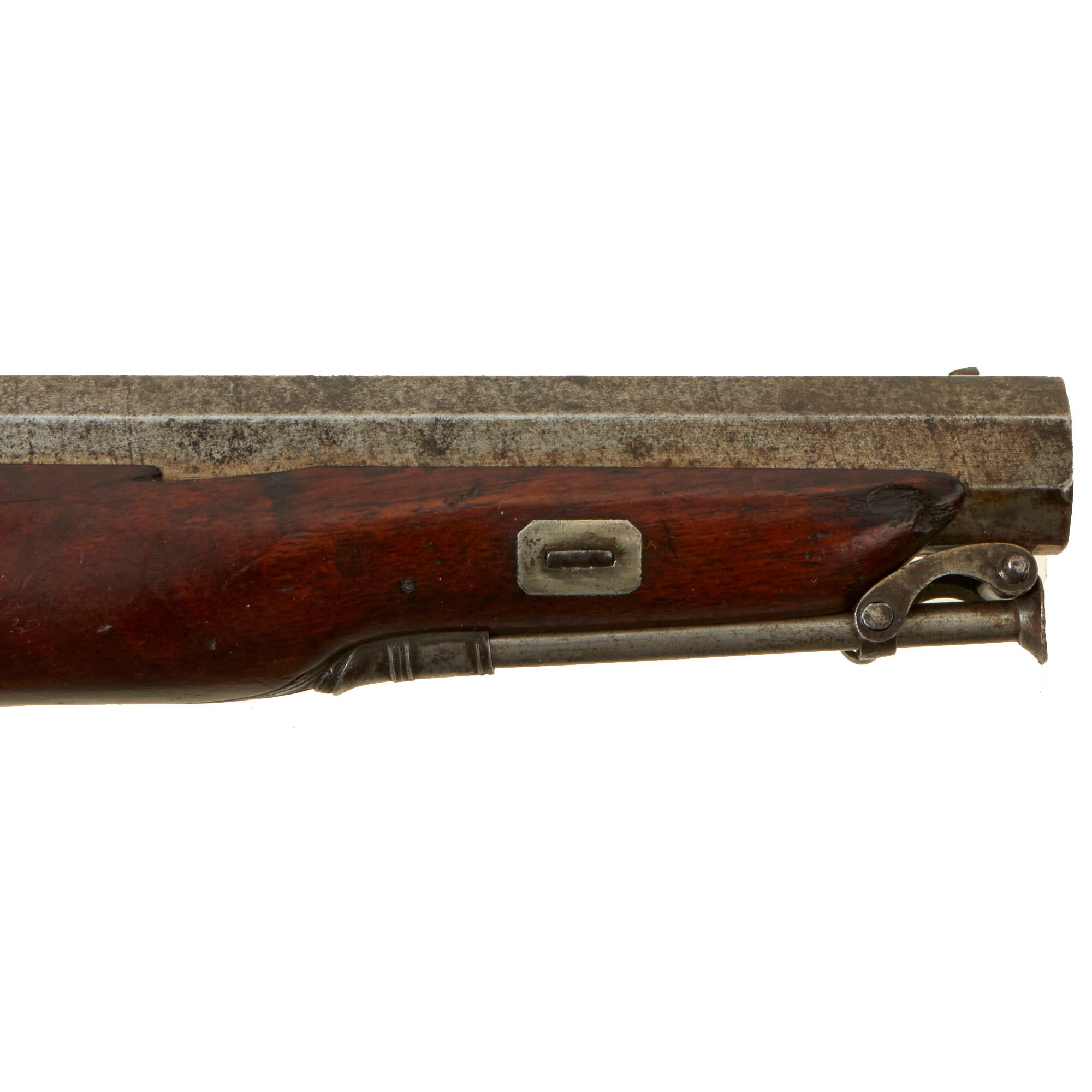 Condition is very good, and the pistol features a beautiful figured walnut stock with a checkered grip area. The color is beautiful, and aside from some cracking and a missing sliver of wood on the right side, there is no real damage we can see. The metalwork shows a lovely matured patina, with no major oxidation, and the spiral forging lines in the barrel are still easily apparent. We checked the lock, and it is fully functional, holding at half cock when the safety is used. Please note that the tumbler will not hold at half cock unless the safety is set.