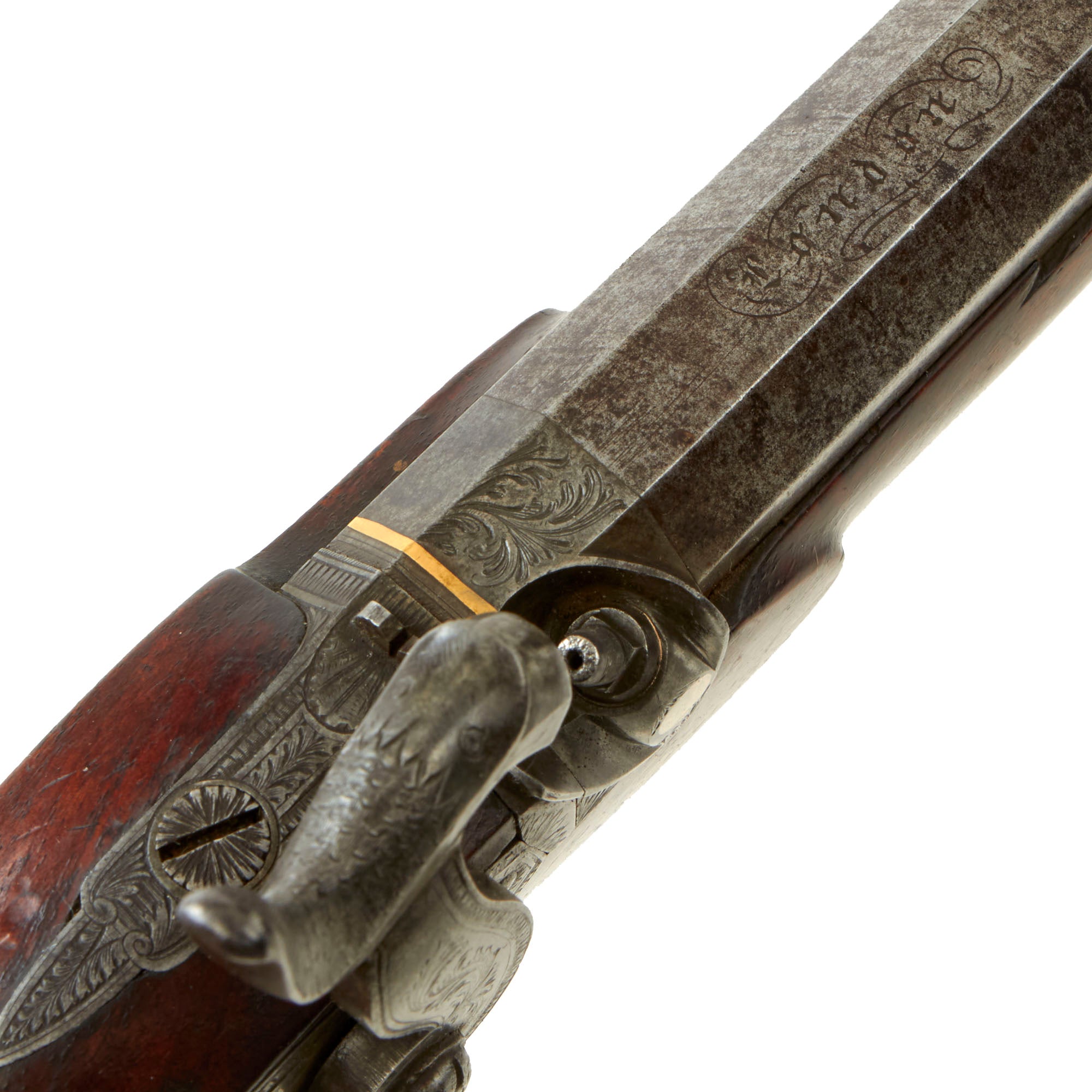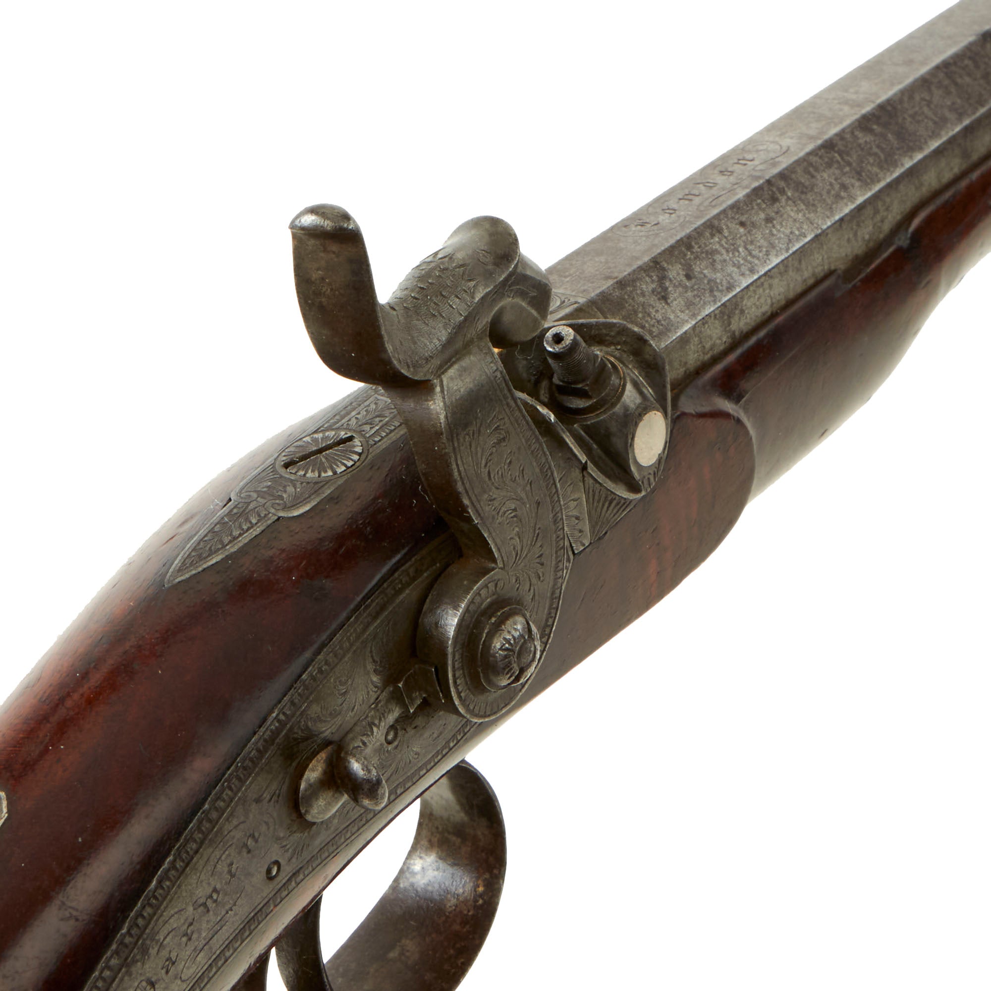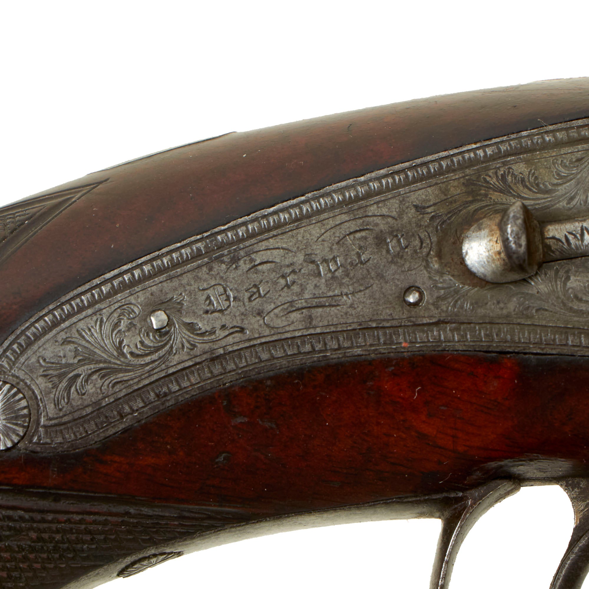 Original Item: Only One Available. This is a lovely British Officer's private purchase percussion pistol, from just before the start of Queen Victoria's long reign. It is marked on the lock plate with the name Darmen, which we were unfortunately not able to find much information on. We have seen a few other examples of their work, but have not been able to find out much else. This is the first firearm of any type that we have had by this maker, and we estimate it was made circa 1830.