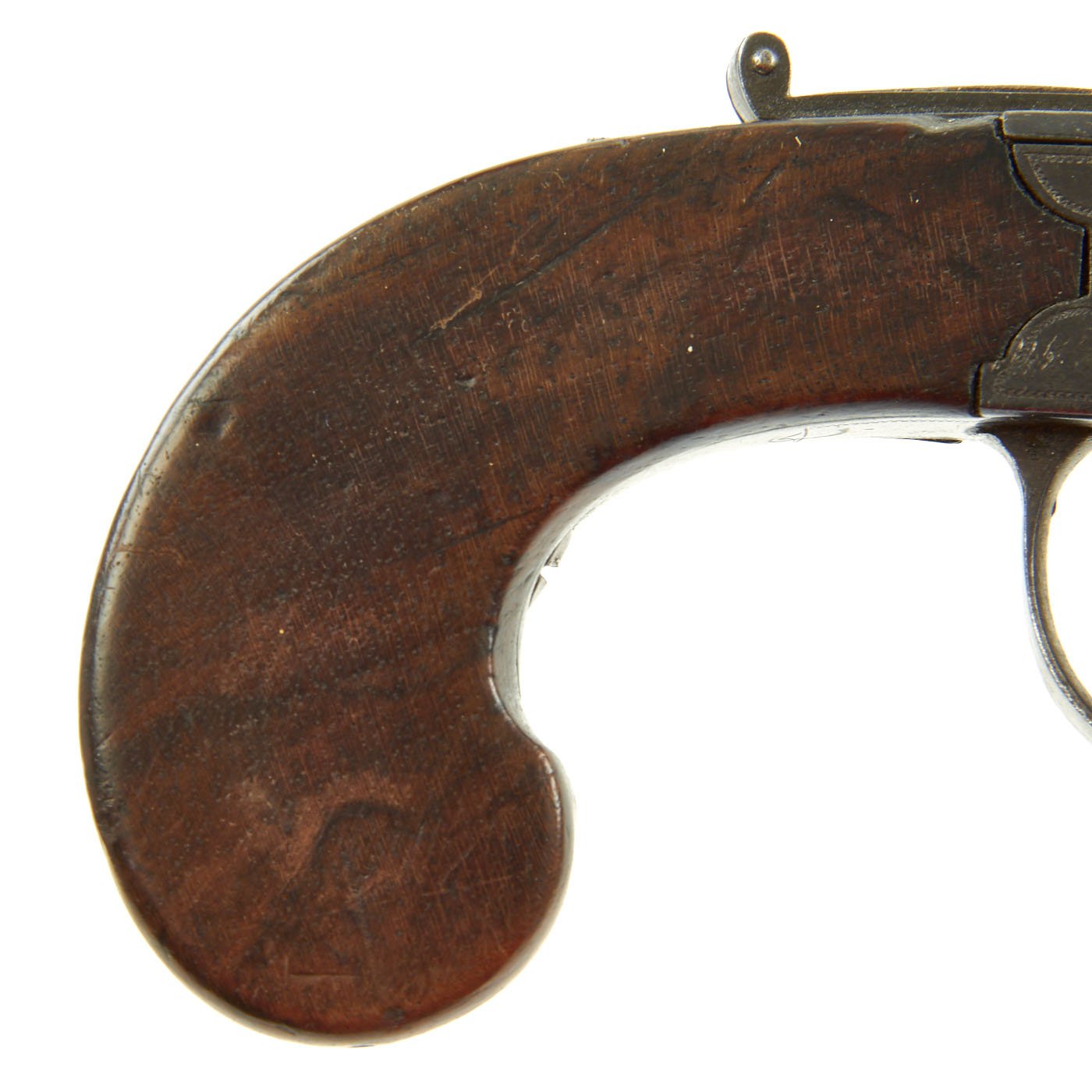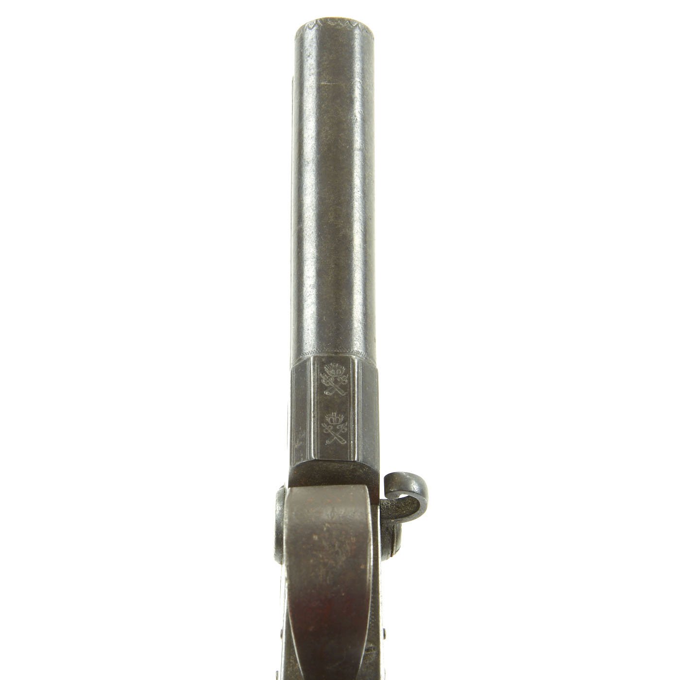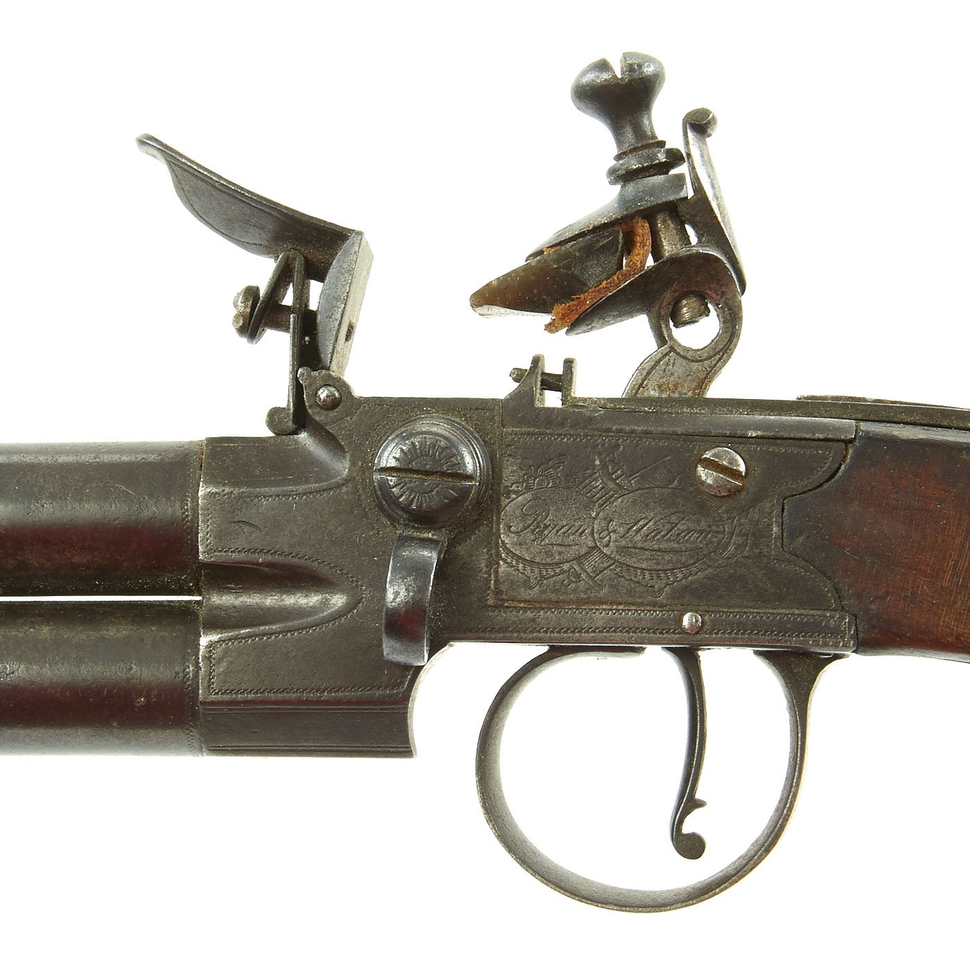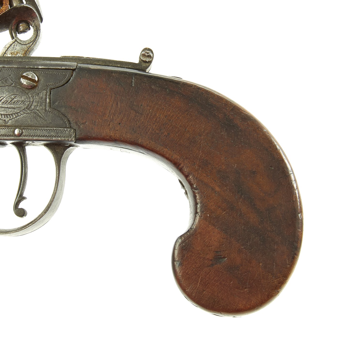 The action and barrels are made of iron fitted with a plain slab sided Walnut grip. The left side is marked Ryan & Watson and the other side is marked LONDON. This firm worked from 1765 until the business was closed by their descendants in 1835 when they maintained Shops in both LONDON and BIRMINGHAM. It also has pre-1813 Birmingham Proofs on the bottom of the frame. This pistol was made between 1770 and 1795 and was perfect for an overcoat pocket for self defense or for a serving Officer to carry concealed in case of emergency.