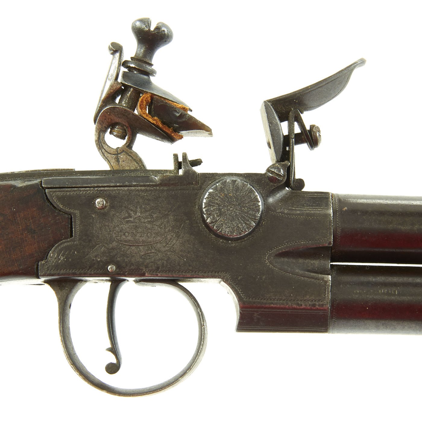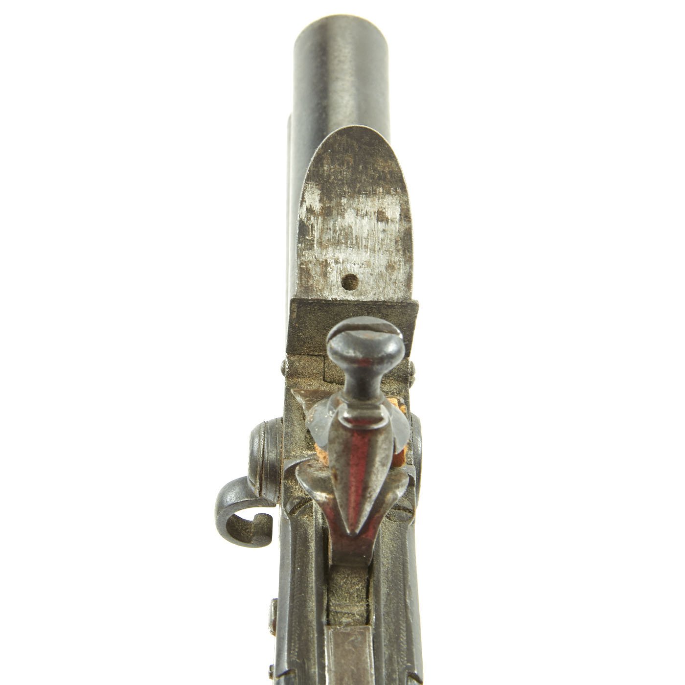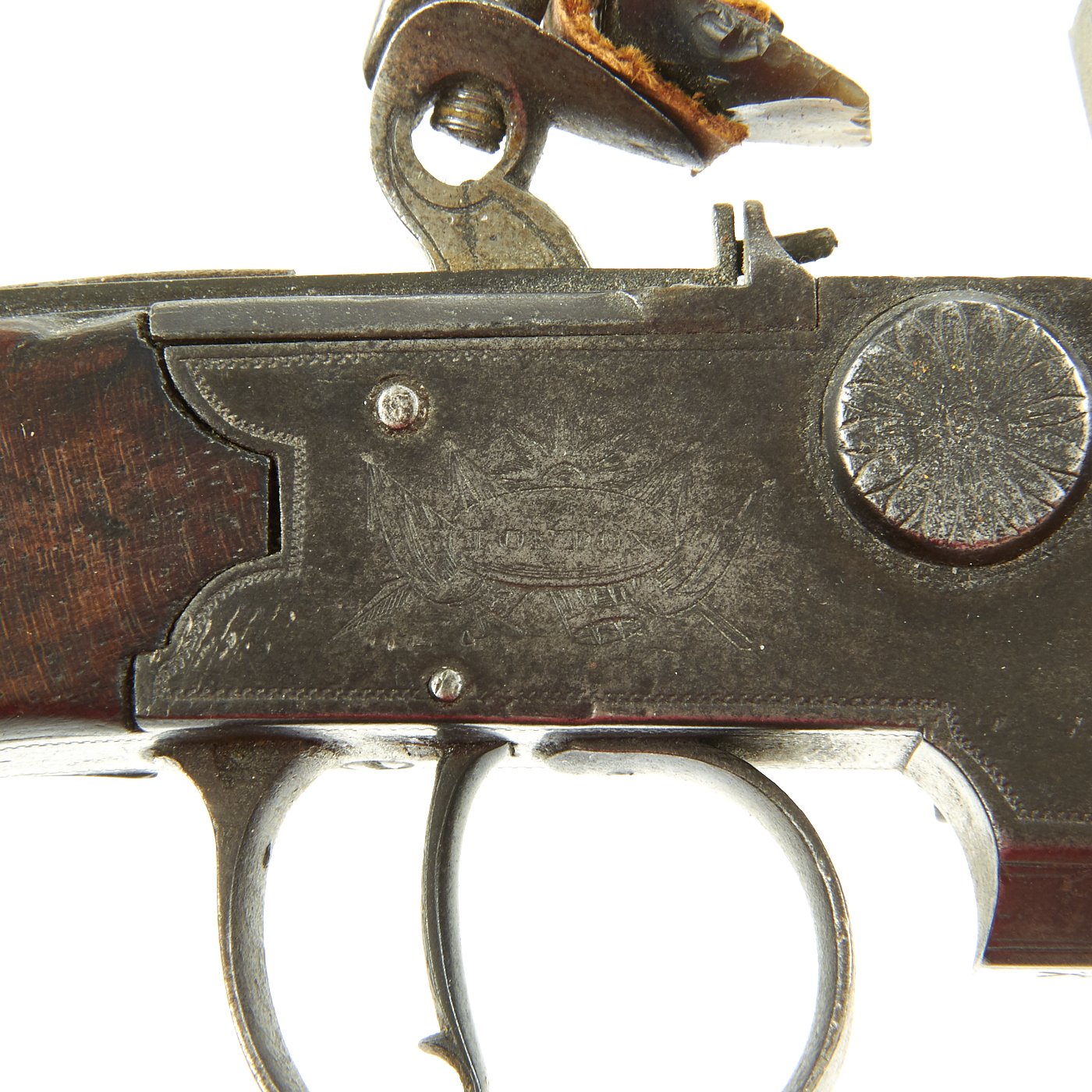 Original Item: One of a Kind. Just received included in a marvelous private collection of Flintlock Pistols. This is an over and under pistol with 3" turn off barrels for loading. On the left side there is a switch so one can decide which barrel will discharge. The pan has a rolling compartment each to serve one of the barrels so effectively the shooter has a second shot at his disposal directly after the first barrel has been fired. They would also choose to fire both at the same time. This type of mechanism is known as a "tap action," and while most were 2 barrel, there were even examples made with 3 or 4 barrels. There is also a pan safety mechanism rear of the hammer.