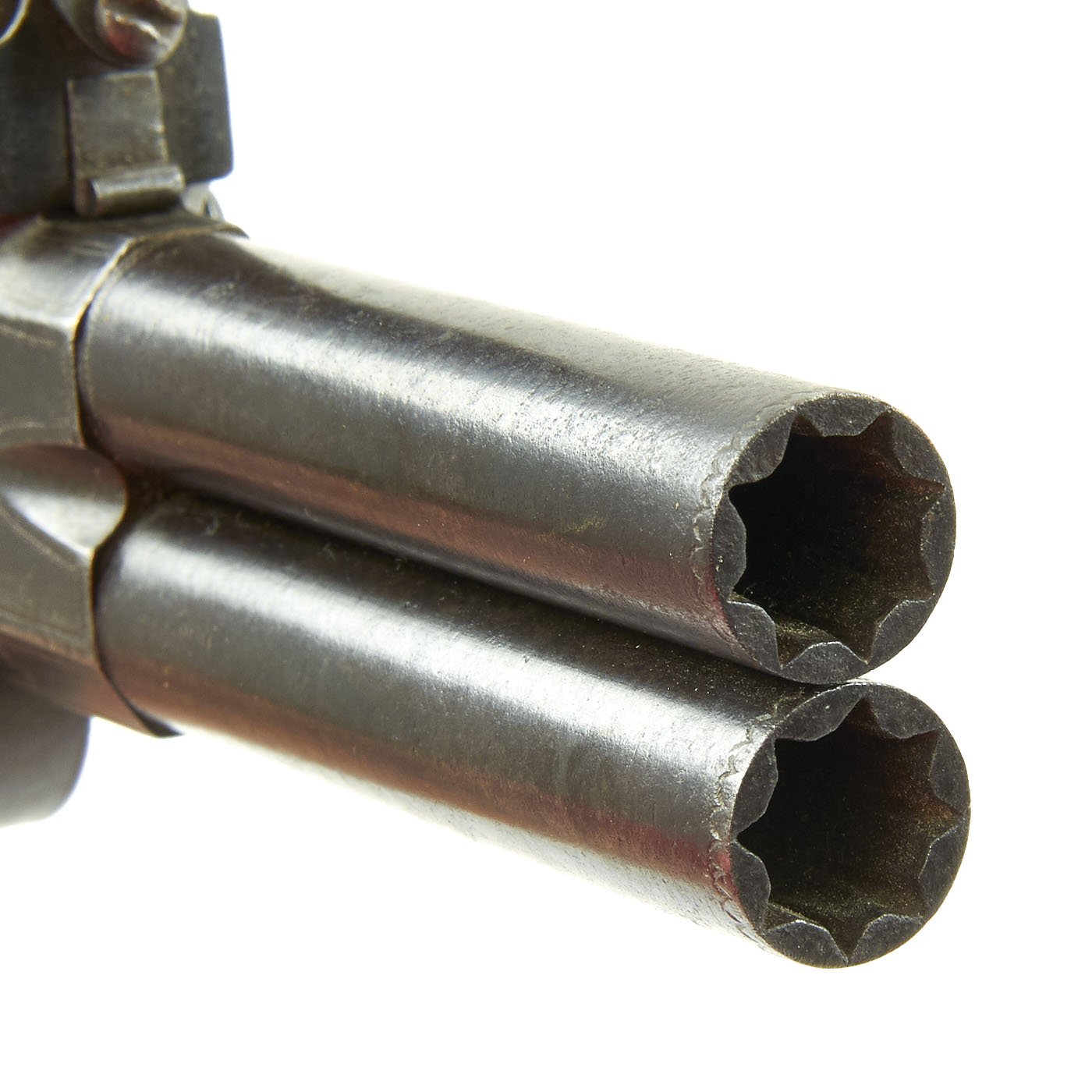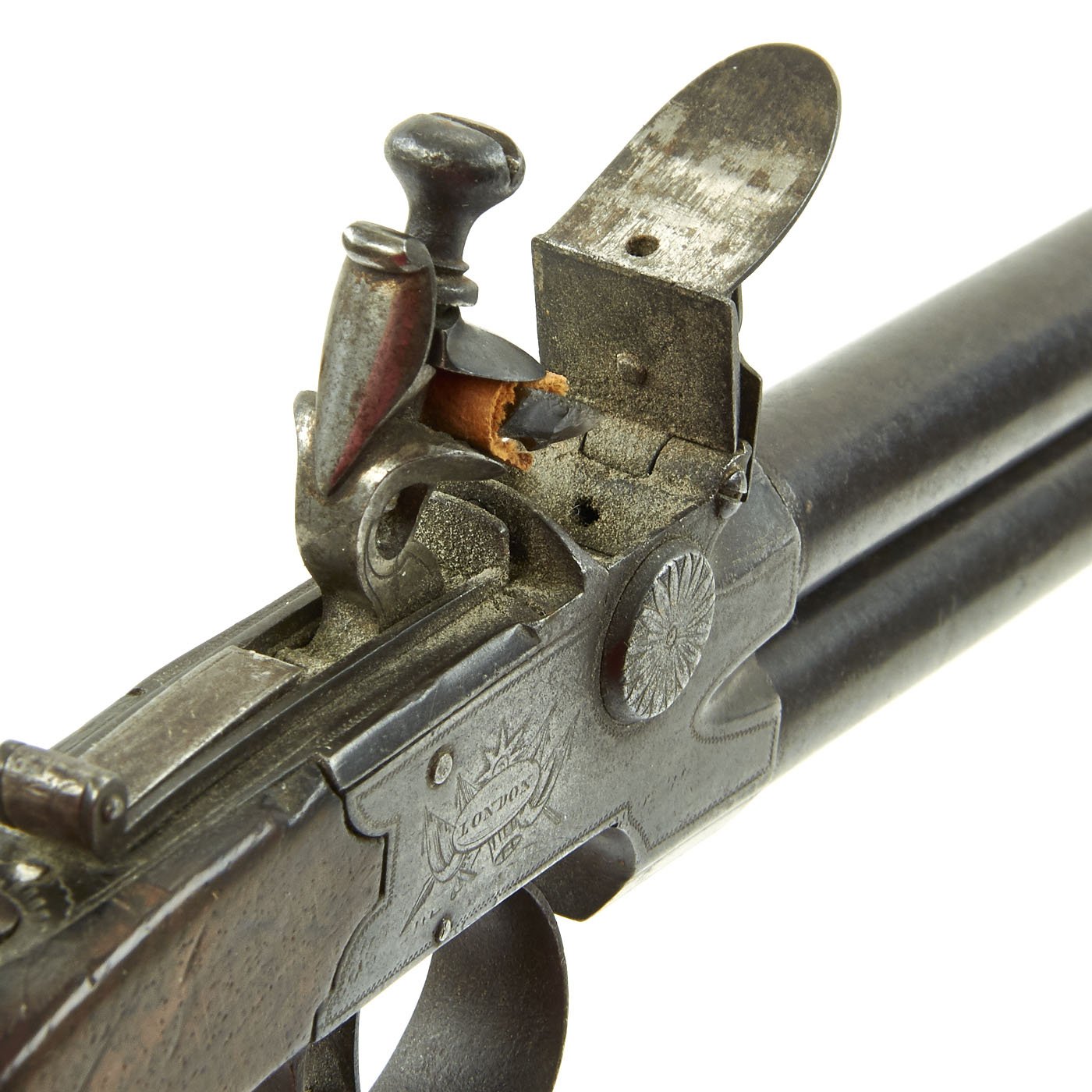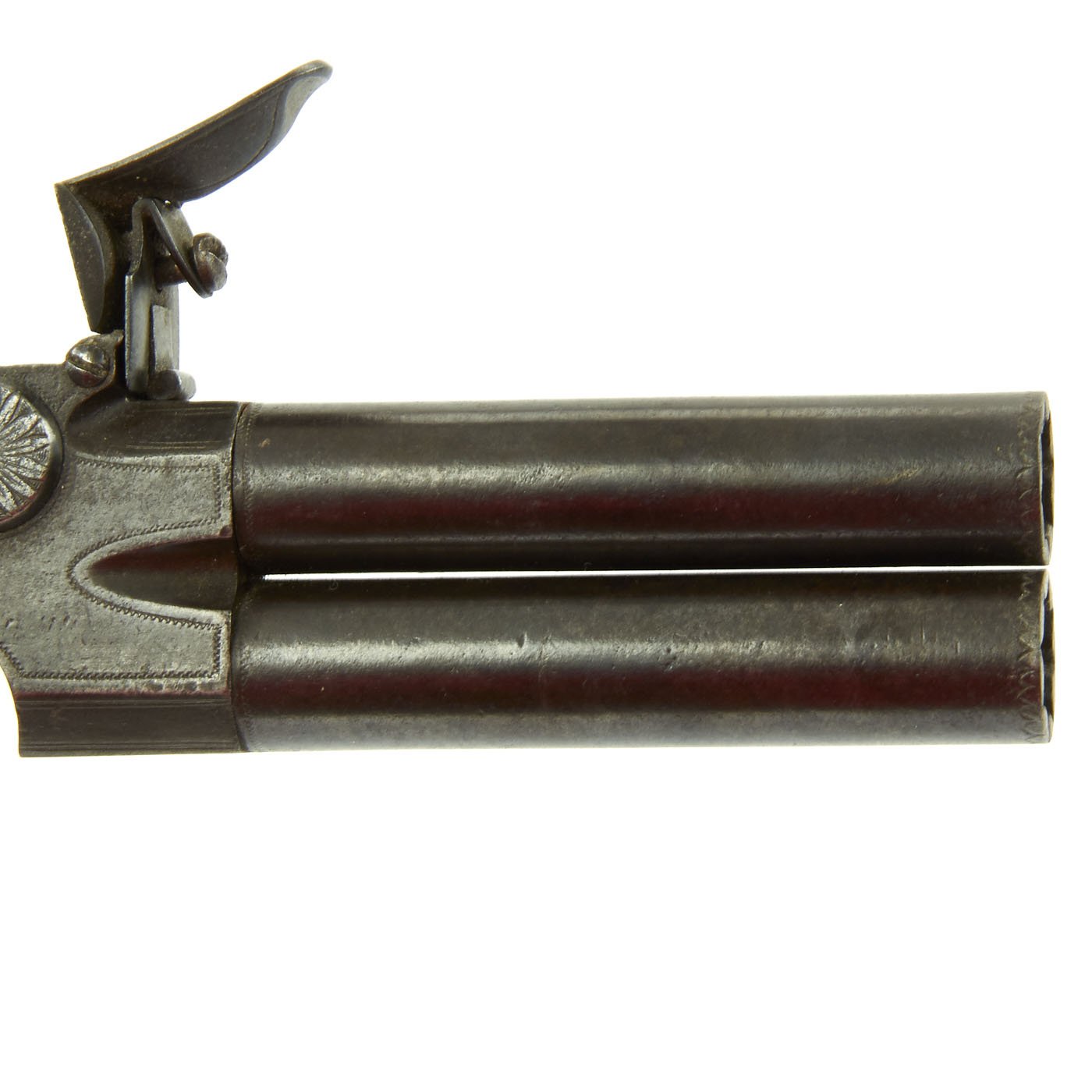 Original Item: One of a Kind. Just received included in a marvelous private collection of Flintlock Pistols. This is an over and under pistol with 3" turn off barrels for loading. On the left side there is a switch so one can decide which barrel will discharge. The pan has a rolling compartment each to serve one of the barrels so effectively the shooter has a second shot at his disposal directly after the first barrel has been fired. They would also choose to fire both at the same time. This type of mechanism is known as a "tap action," and while most were 2 barrel, there were even examples made with 3 or 4 barrels. There is also a pan safety mechanism rear of the hammer.