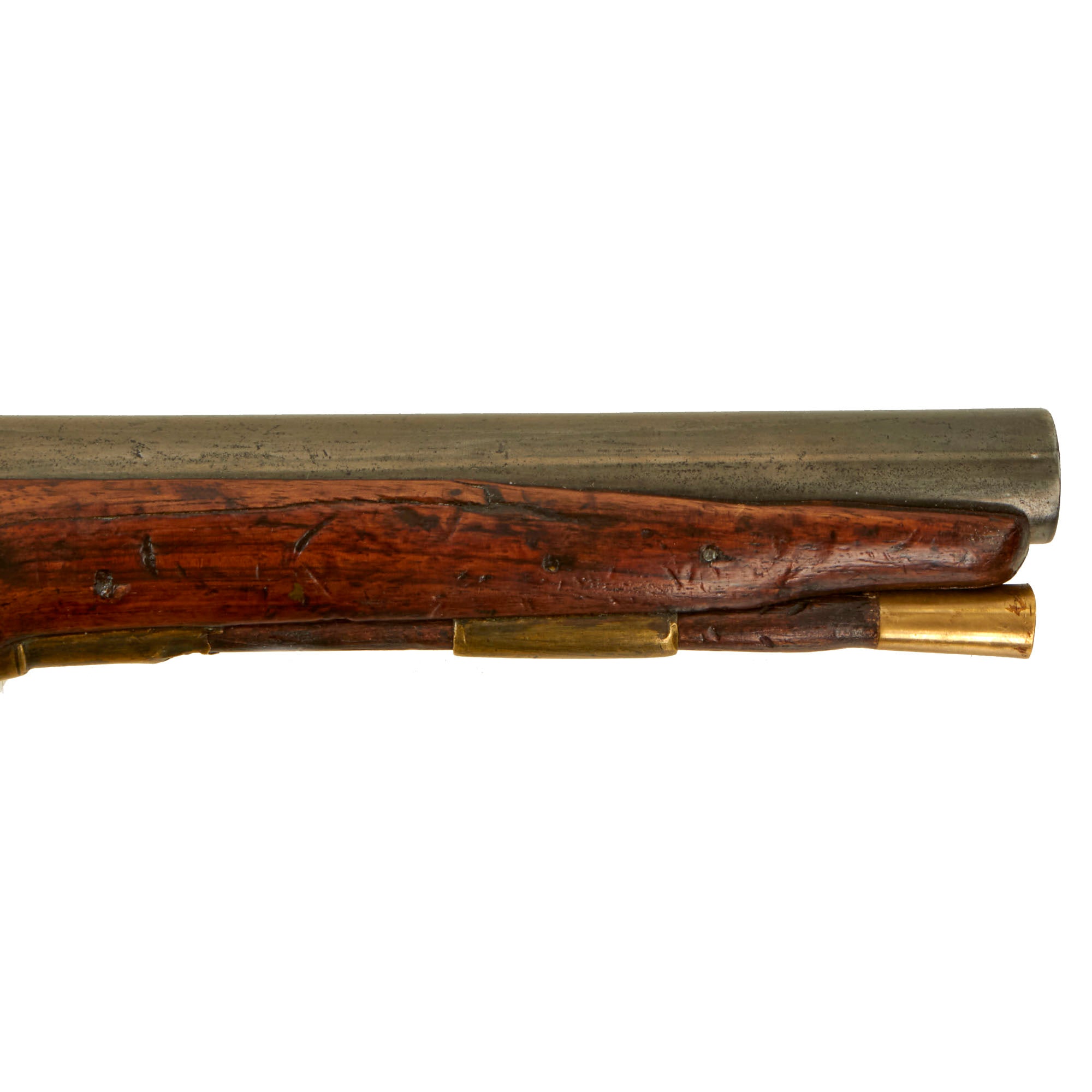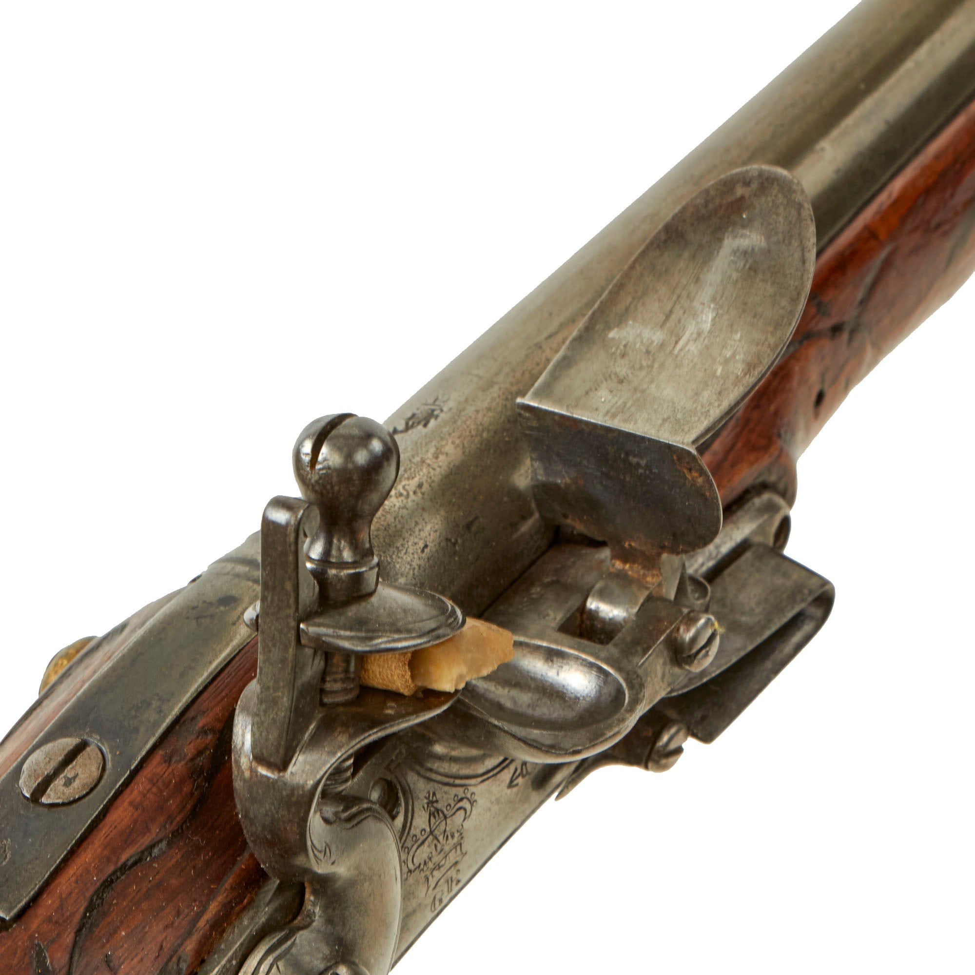Original Item: Only One Available. Here we have a lovely example of the Pattern of 1756 heavy dragoon pistol, one of a series of pistols released over the decades, replacing the P-1742. These are extremely scarce on the market, and are rarely seen outside of Museum collections. As best we can tell this is the first example of this particular variant that we have had! It has the characteristic "long-eared" butt cap and sturdy rounded lock side plate. The stock has a lovely swell around the skirted ramrod pipe where the ramrod enters the stock, and there are lovely raised carved areas around the lock and side plate.