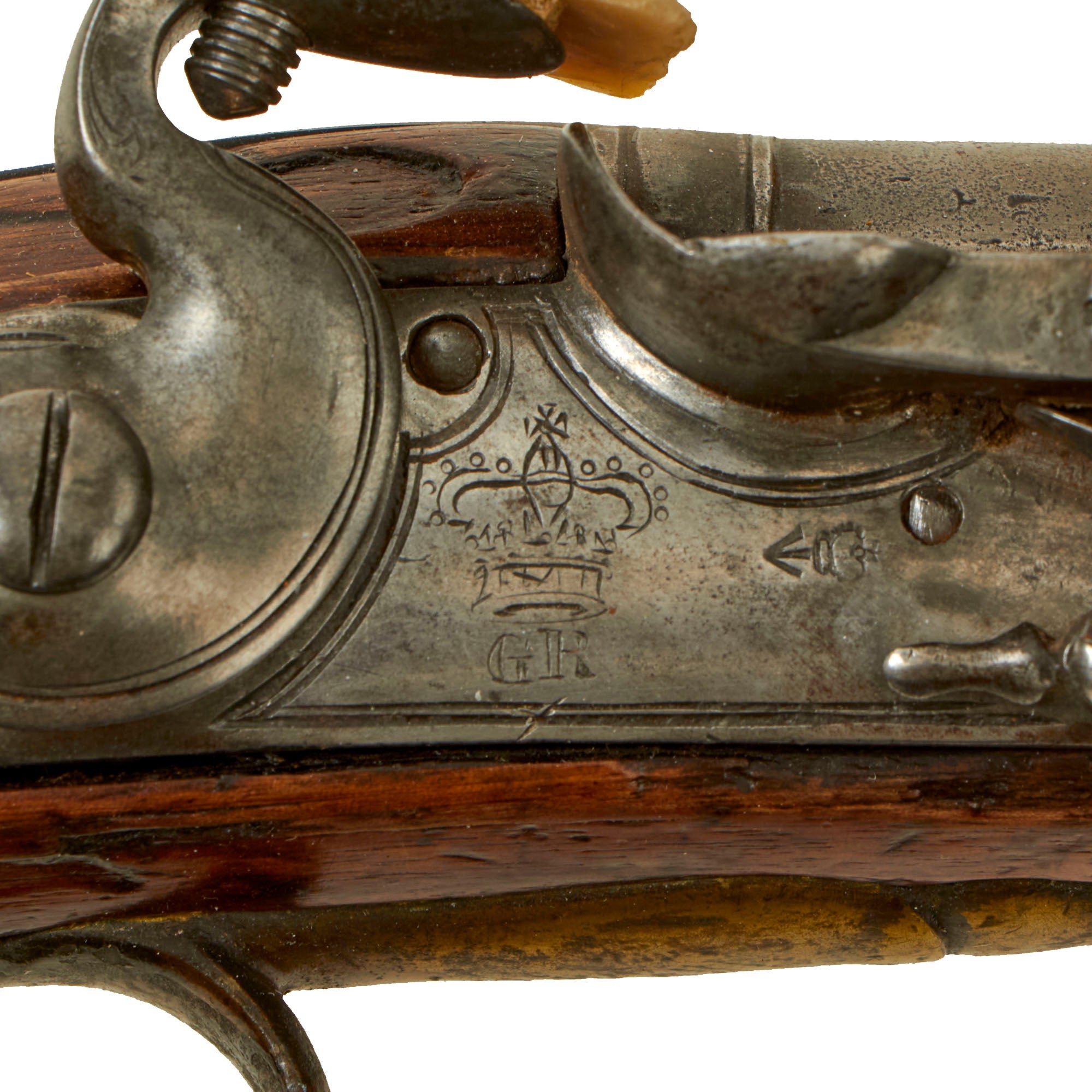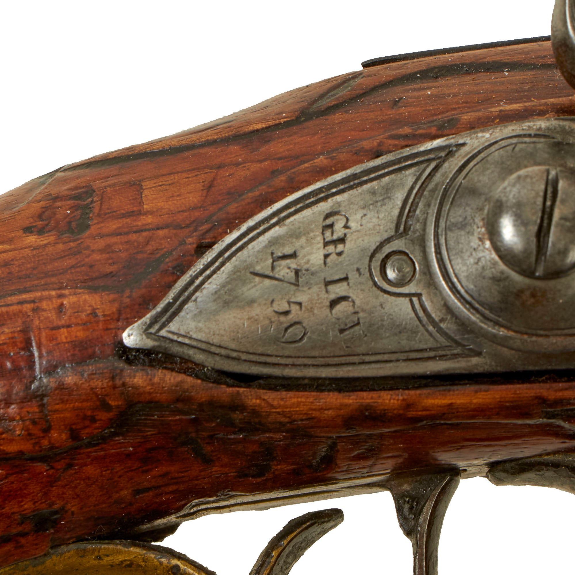 The pistol is marked on the lock plate with CROWN over G.R. under the hammer, and is maker marked GRICE on the lock plate tail, over a date of 1759. This is almost certainly for WILLIAM GRICE, who worked in London from 1740 to 1780. We have seen another example by Grice with the same date, so most likely he had a small contract for these during that year. Under the pan is the usual "Lock Viewer's" mark. The barrel is marked with CROWN / GR / BROAD ARROW over CROWN / CROSSED SCEPTERS markings, indicating Pre-1813 military inspection at the Ordnance Proof house on Tower Wharf close to the Tower of London.
