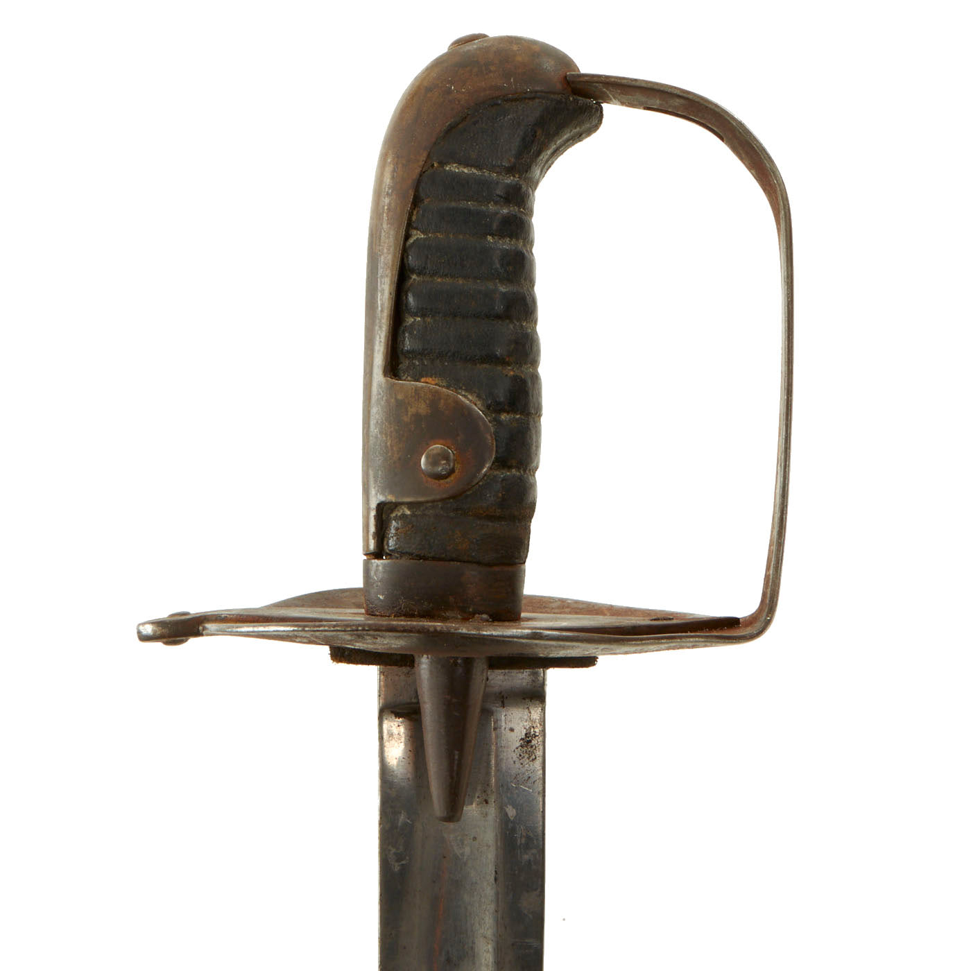 Here is a real and genuine example of the huge pattern of 1796 Heavy Cavalry Sword, complete with its iron scabbard. The spear pointed 35" single edged blade with a very slight curve bears the Maker's name of DAWES / BIRM’M on the rear spine, for maker Samuel Dawes of Birmingham, England, a known maker of swords during the 19th century. There are also the remains of various Inspector's and Proof Marks on the blade ricasso near the guard.