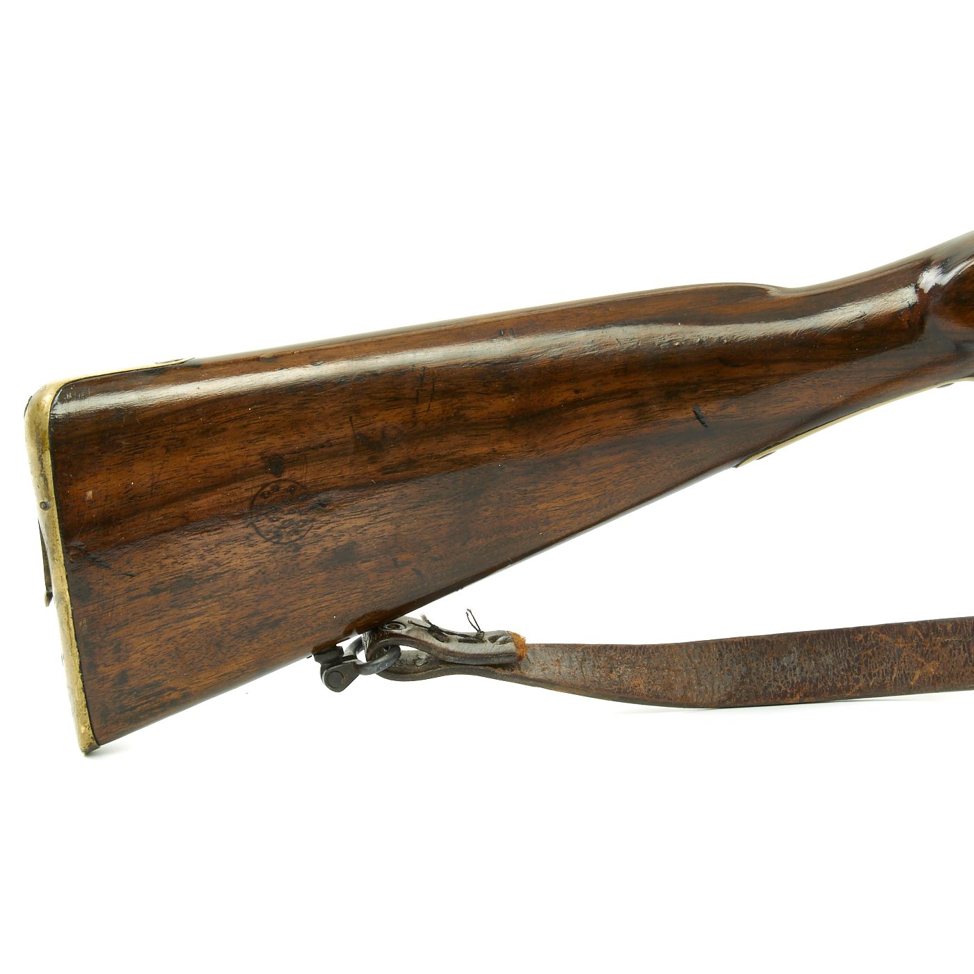 There are however some rather interesting aspects to this converted carbine. It has a butt trap, which looks to be for a two part cleaning rod. It also has a sling seivel on the butt, which looks almost like it came from a Martini-henry. there is a short leather sling permanently attached to the sling swivels. The front of the stock looks to have some type of resin nose cap.