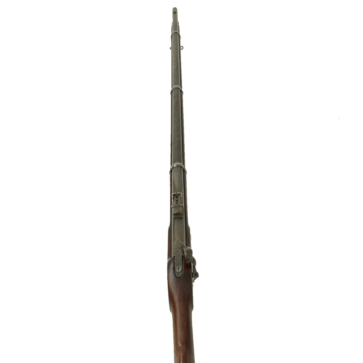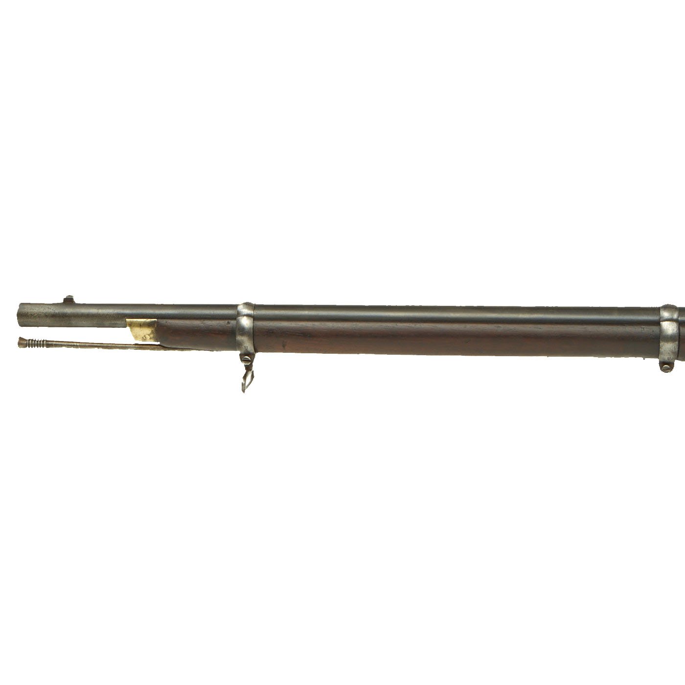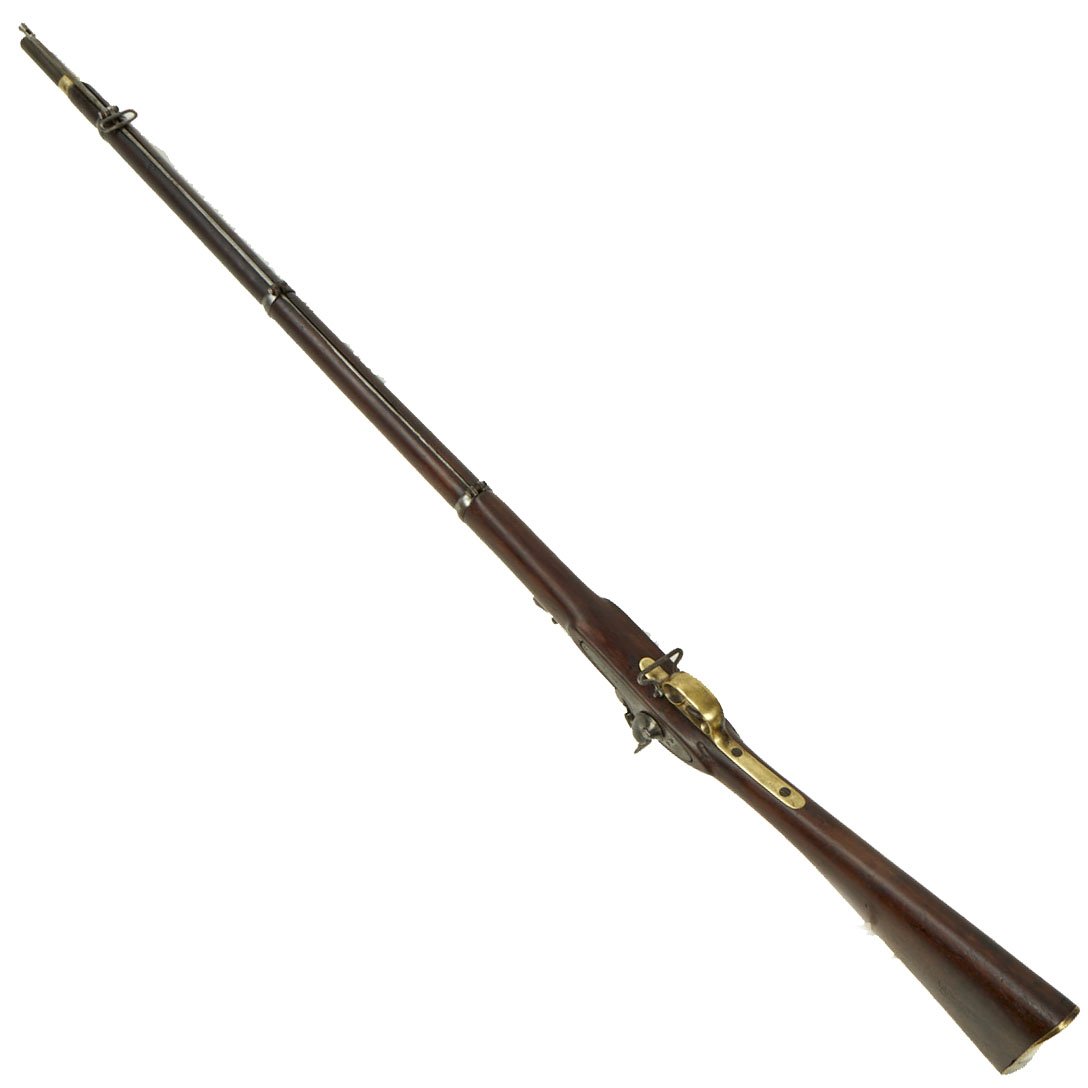 Original Item: Only One Available. Offered here is a very nice example of the 3rd Model Pattern 1853 Enfield Rifle Musket, produced in London, England, with brass butt plate, trigger guard and nose cap. The three steel barrel bands are held on with screw pressure, as typical of the 3rd model, and all bear British Proof marks. The lock is marked 1855 / TOWER below the cap bolster, and it is marked with a QUEEN'S CROWN / V. R. (faint) to the rear of the hammer. This indicates military production for the British empire. There is also the correct "lock viewer's mark" to the right of the date.