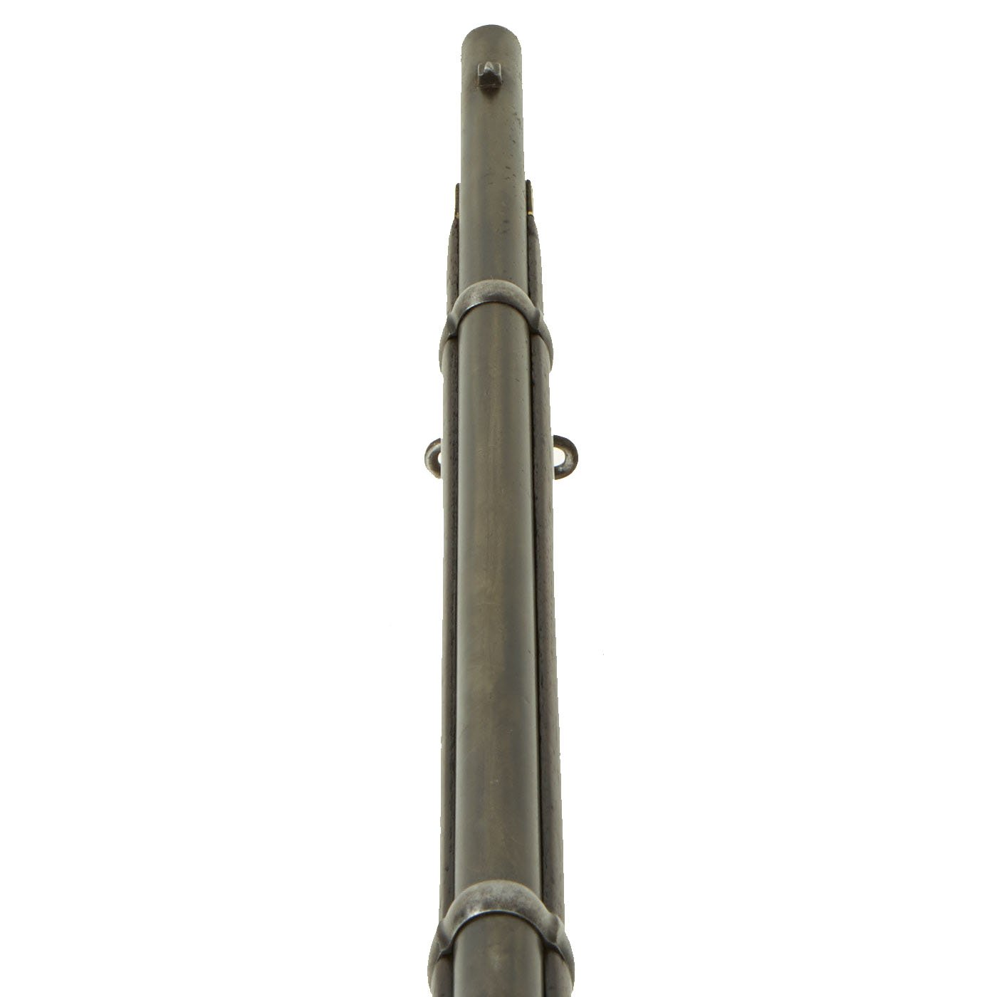 The wood is complete and in very good shape, with no structural issues and a lovely aged patina. There are some dents and small chips, but nothing out of line for a rifle that was in service. The sight slide is present, and the bands tighten properly. The the bore still shows clear three-groove rifling, though it has some oxidation and dirt. Lock is functional, holding at half cock and firing at full. Both sling swivels are present and in good shape.