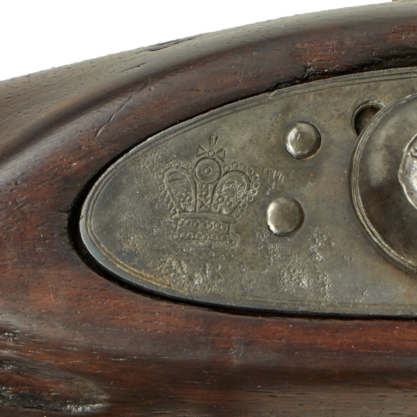 The barrel bears various British proof marks in two lines, some of which we do not recognize, so this example looks like it was probably serviced at arsenal during its working life. There is definitely a "viewed" marking, as well as the correct CROWN / T P / (ARROW) "Tower Proof", only seen on tower produced examples. There are traces of the original stock rondel stamping on the right side of the butt stock, as well as an (ARROW) / B O board of ordnance marking. There are also some rack numbers stamped into the butt plate tang.