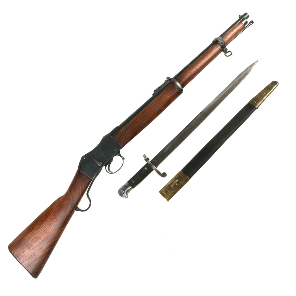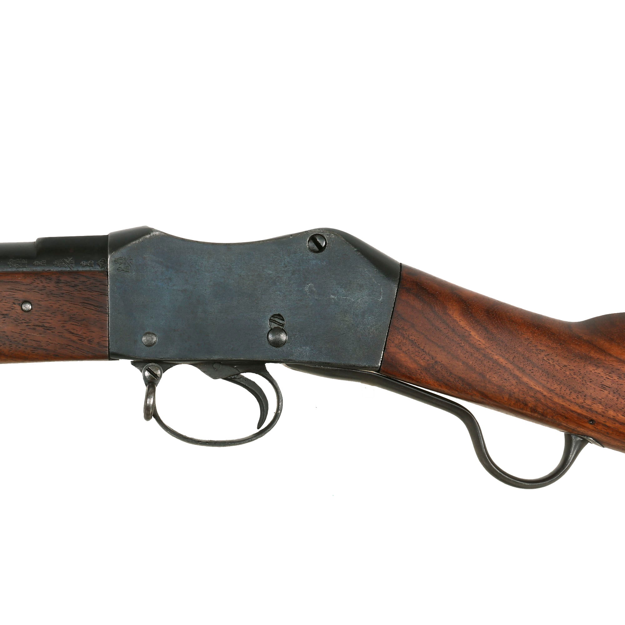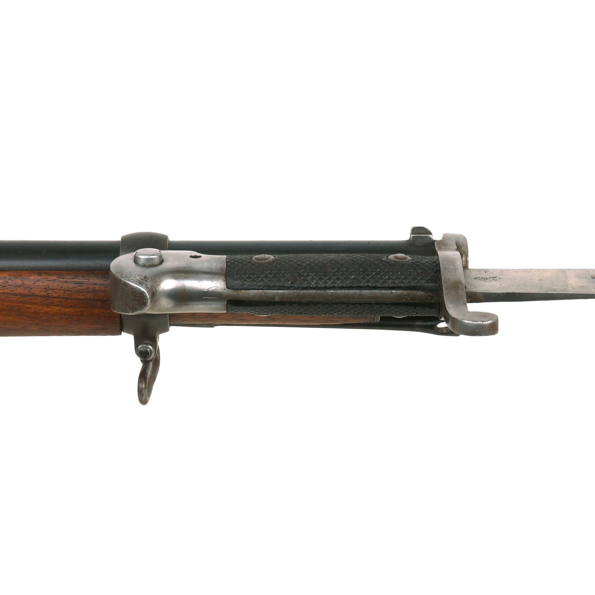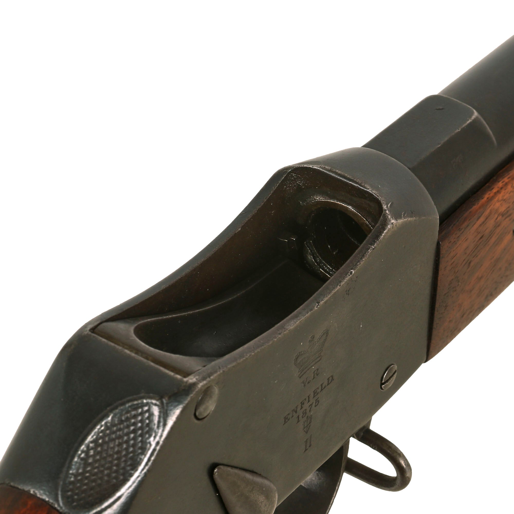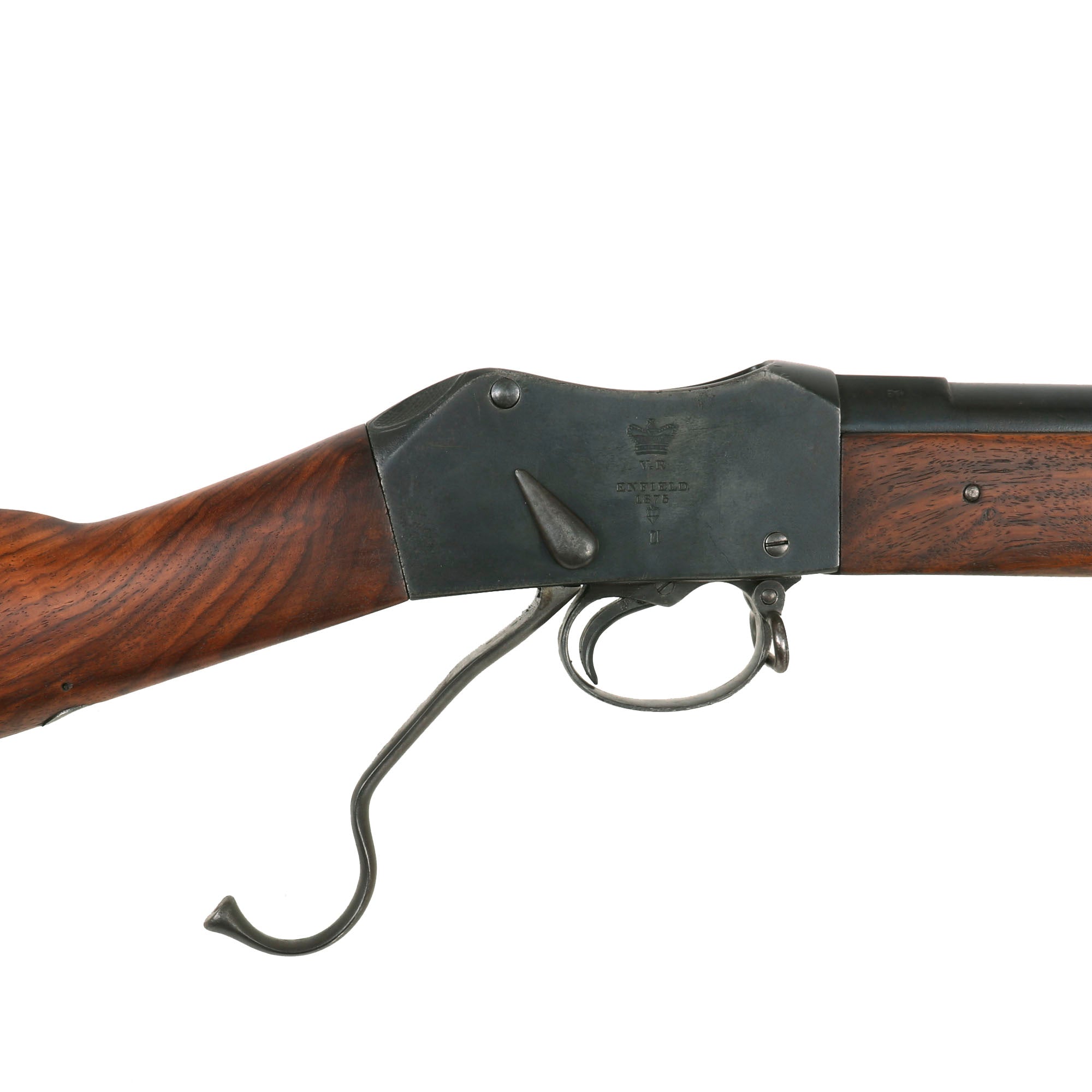 The Martini-Henry is probably the most famous military rifle of the Victorian era incorporating the early short lever with 33" barrel in the new .45 caliber. This was the first manufactured breech loader to be adopted for general issue by the British Army. Internationally known for its role in the movies "Zulu" and "Zulu Dawn" it should be noted that at the Battle of Isandlwana in January 1879 where the British lost its entire command of 1300 men, the Zulu's suffered in excess of 2000 casualties. Followed by the memorable action at Rorke's Drift, the Martini Henry Rifle more than any other represents British Colonial rule during the Victorian era.