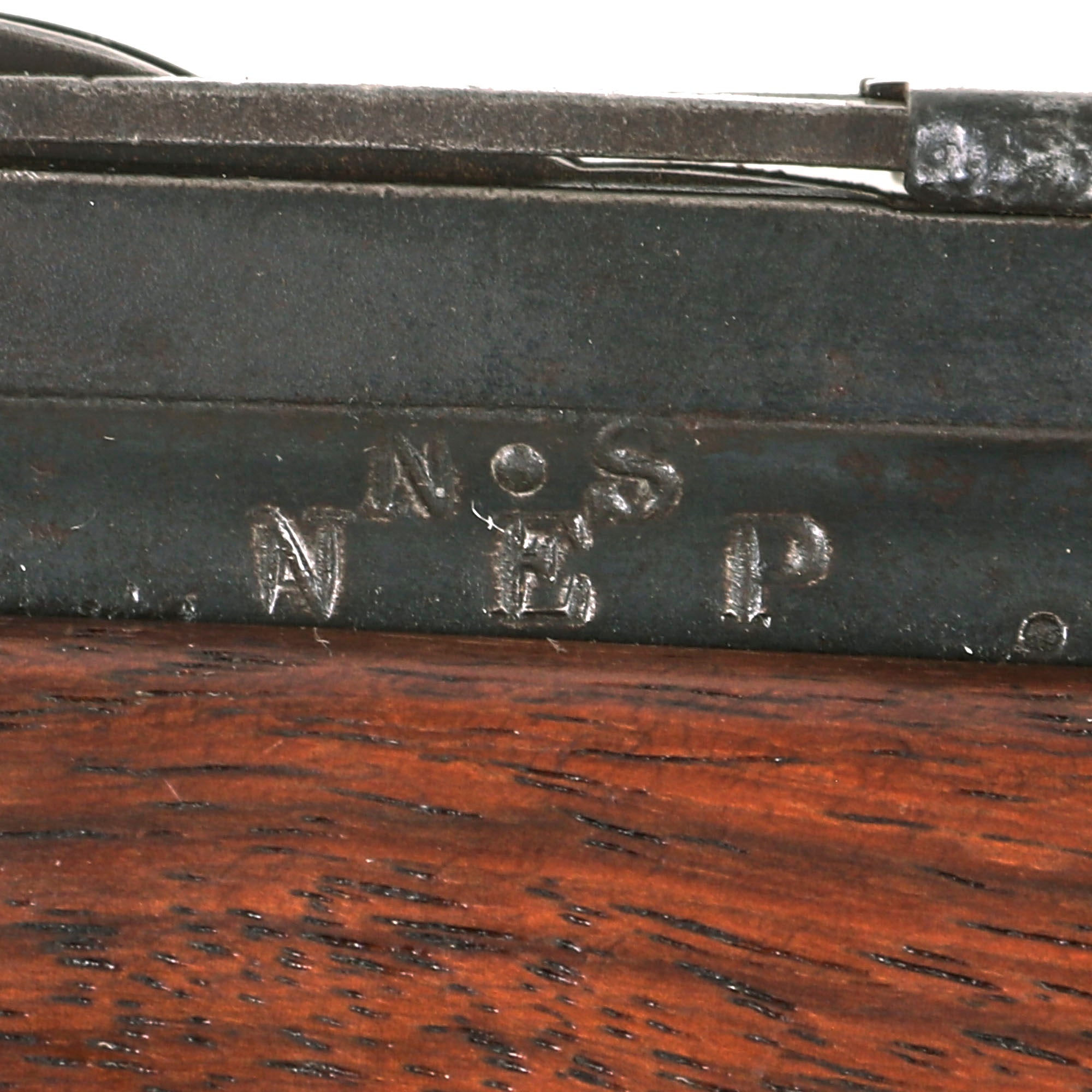 The "II" mark of arm is off center, indicating this was originally a MkI Martini-Henry, which like almost all was upgraded to MkII early in its service life. There are additional proof marks on the barrel, and the correct N · S / N E P marking on the left side of the barrel under the sight, indicating issue to Nepal. The condition is lovely, having been restored by our antique gun smiths. As we usually see, there is some past pitting along the barrel woodline, and in a few other places. We checked the action, and it functions correctly, with a nice dry fire. The bore also shows the Henry rifling clearly, though there is some past oxidation and fouling, as to be expected. Really a lovely converted carbine.