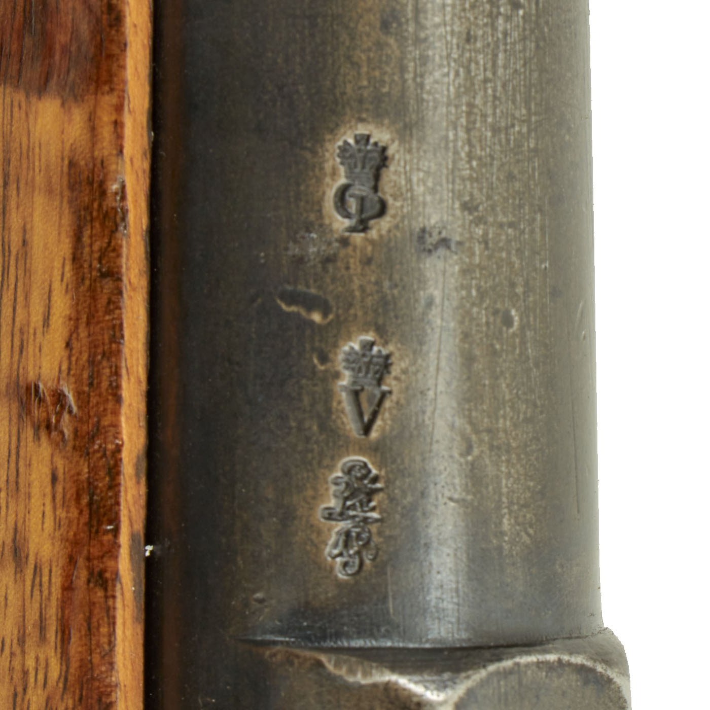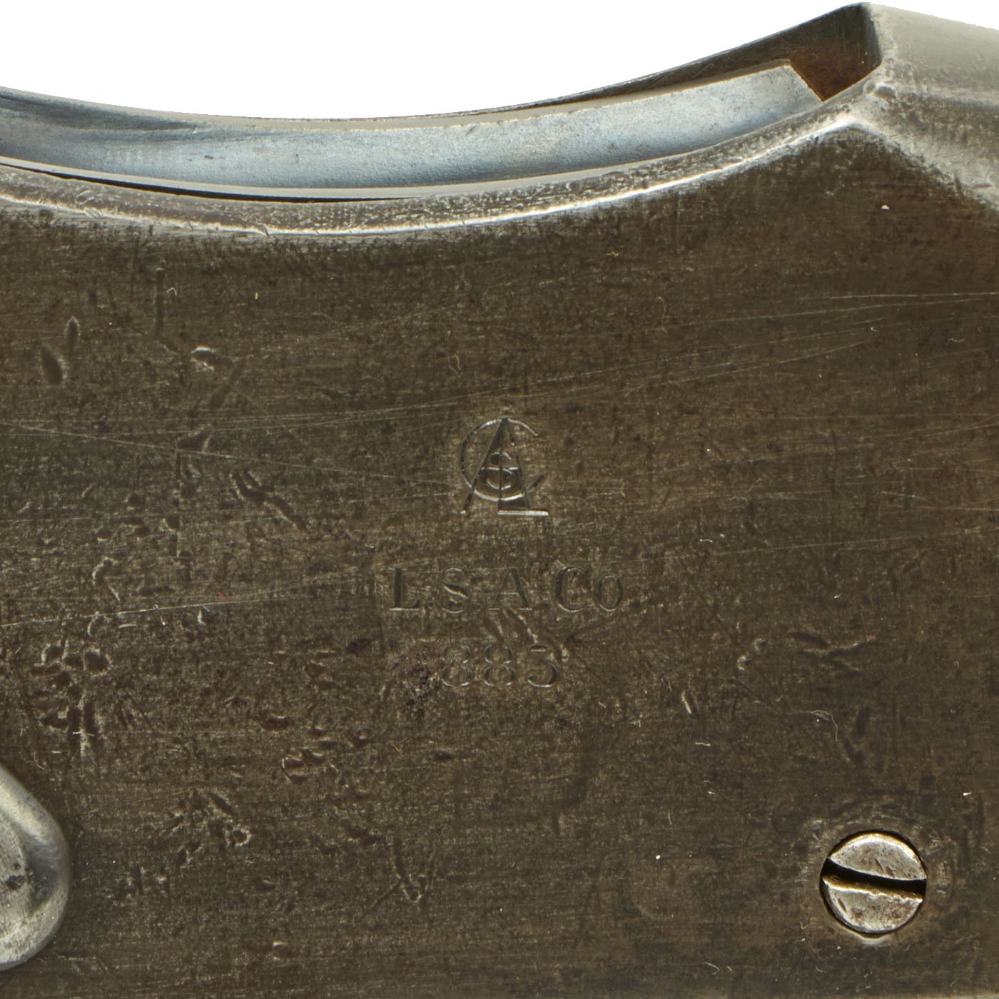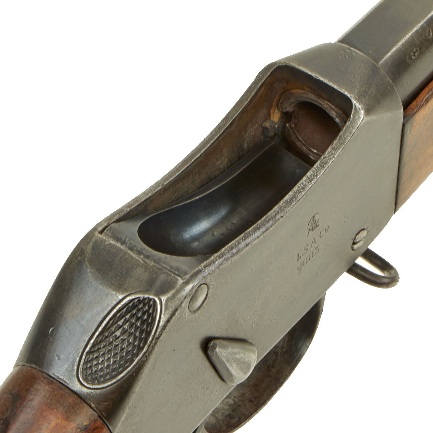 Many of the components of the rifle have the stylized "L" marking for LSA as well. The barrel nocks form bears the correct London Proof House markings for the period: CROWN / V "Viewed", CROWN / GP "Definitive Gunmakers Proof", and the RAMPANT LION / G "Provisional Proof". The left side of the receiver also has an additional "Viewed" marking on it. The right side of the butt stock shows a BSA & M Co rondel, possibly indicating the stock was supplied from there.
