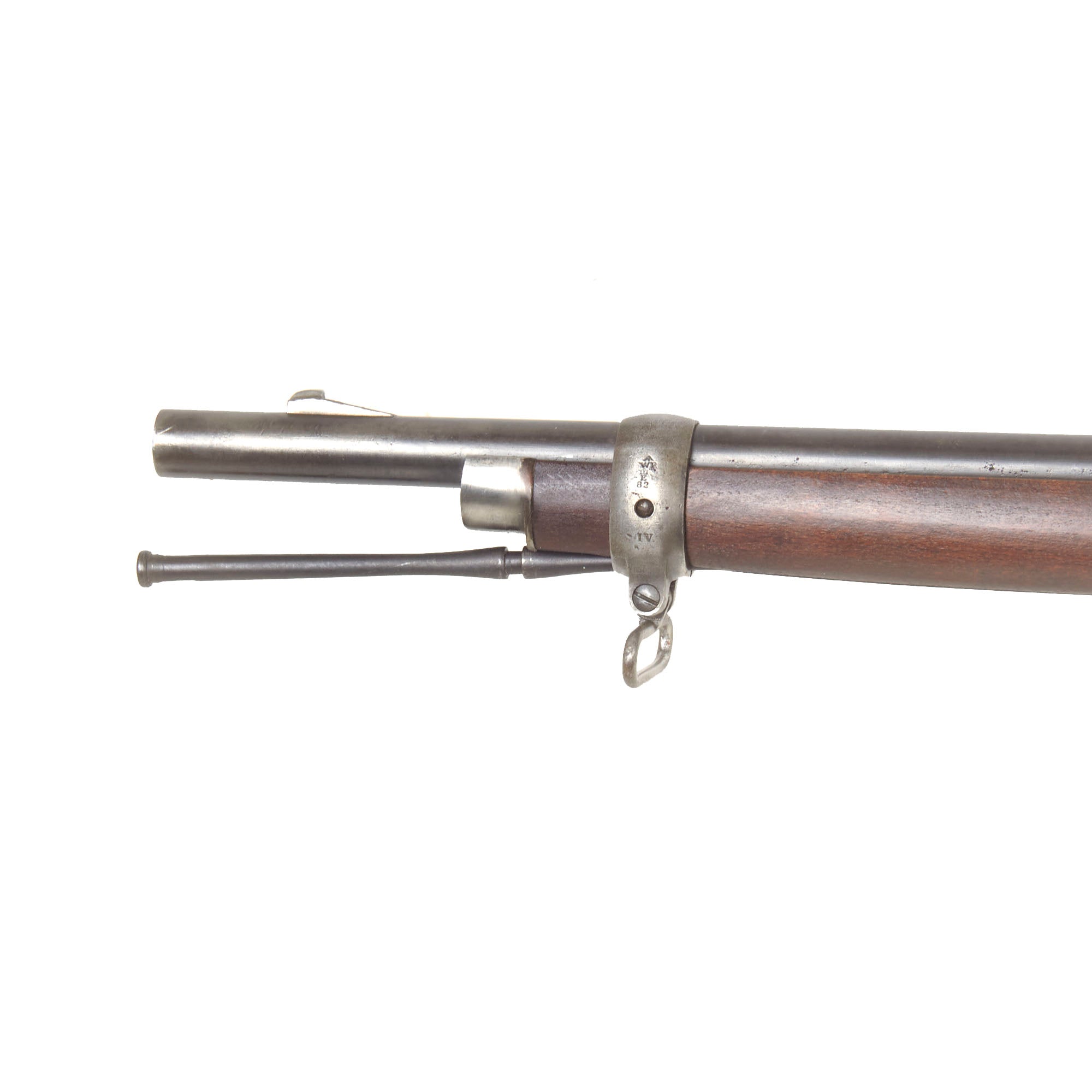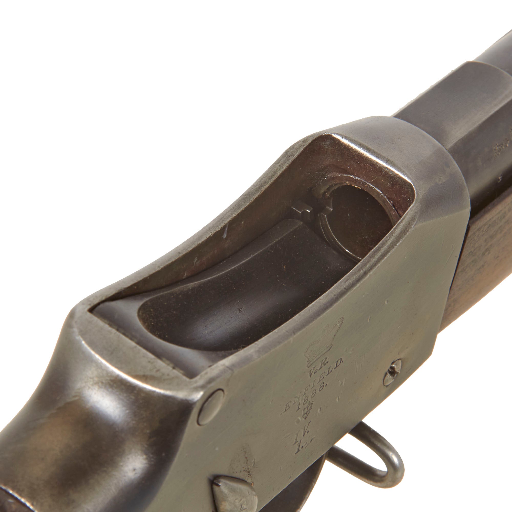 The success of enhanced extraction of the longer lever of the Enfield-Martini Pattern B rifle was readily adopted for all MkIV patterns, those existing Enfield-Martini A pattern walnut stocks required the brass stock cup re-siting to correspond with the long levers' tip. The process required a fresh recess hole to be drilled and the cup re-set. A purpose made wooden plug was glued into the hole completing the process. As the stocks were all removed there is no consistency as which stock was fitted to A or B pattern, so they will be found on any pattern. Wherever possible the old components were re-used, and the "E-M" designation originally marked on many of the parts betrays today its original pedigree often scored through thus: E-M. The A pattern trigger assembly, designed to accept the E-M"s safety was reamed to remove the original configuration, whilst Receivers and butt stocks of the old pattern had an extra Roman numeral "V" stamped alongside the original "I", whilst newly made but un-used components have a distinctive "IV" classification. A new pattern clearing rod, designed to spring into place and to be suitable with use of the new steel jag was installed and the nosecap was redesigned, however it was decided to retain to old pattern Barleycorn on Block foresight on the pattern "A".