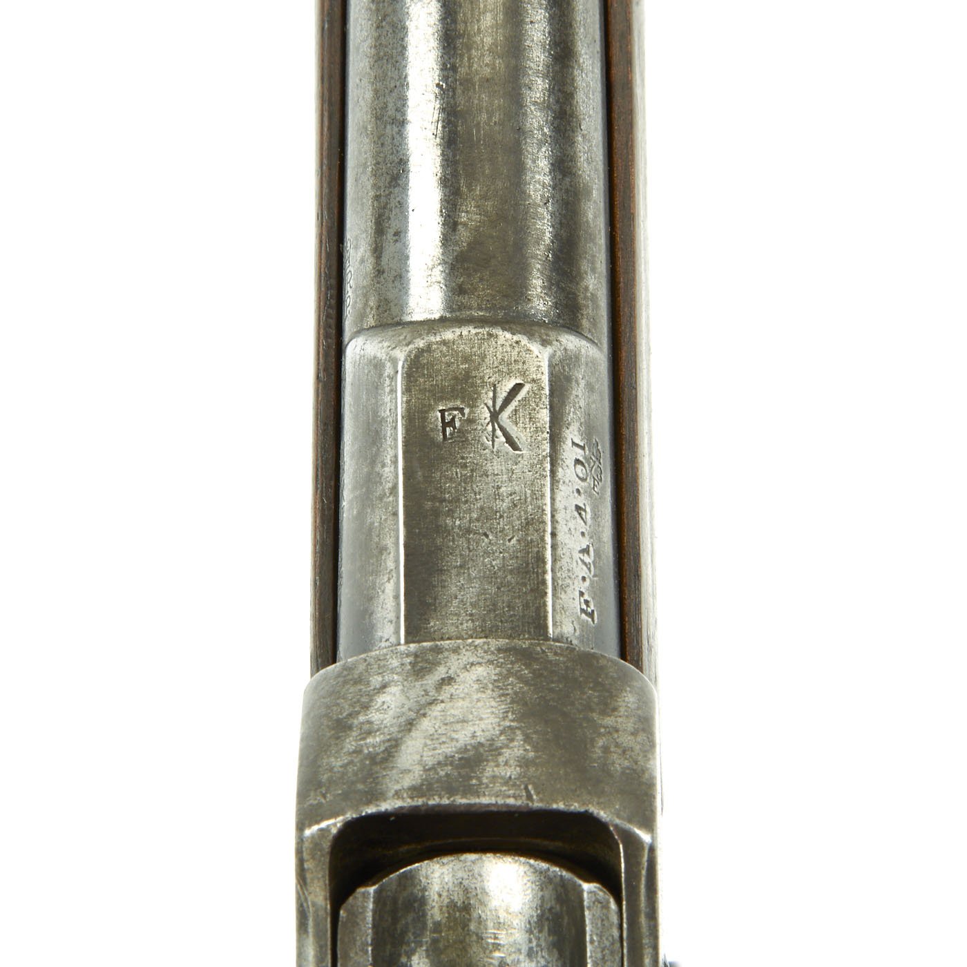 There is no "Lock Viewer's Mark" on this example, which is correct, as the marking was deemed superfluous in 1897, so any made after that did not have the marking. Below this are the "Opposed Cross Arrows" for being sold out of service. The barrel nocks form also has an interesting marking: F.A. 4.01, which would mean that this rifle was inspected and put into service at Firozpur Arsenal. Firozpur is located in the south-west portion of Punjab in India. After service there, it was then sent to Nepal a decade or so later.