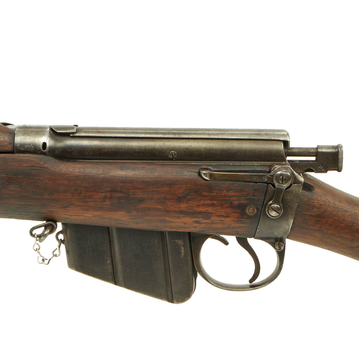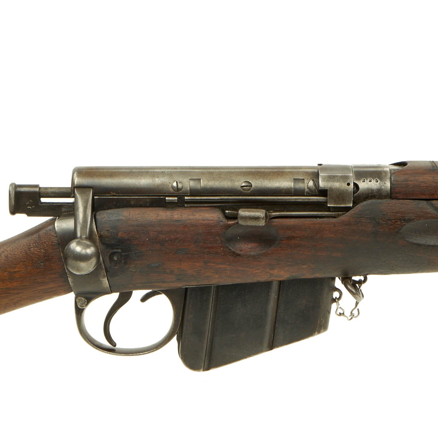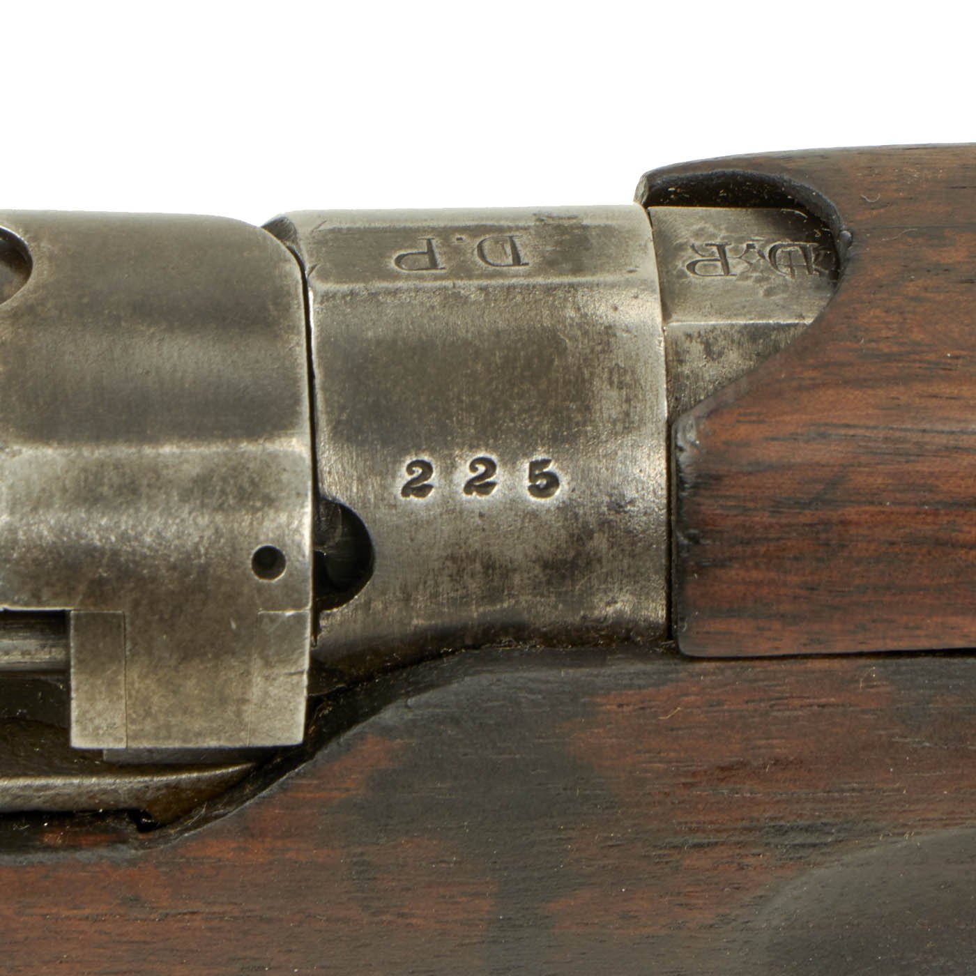 This example was made at the Royal Small Arms Factory at Enfield Lock, a storied production factory in operation since 1816 as one of the major manufactures of arms for the Great Britain. There does not look to be any star / asterisk marking next to the mark of arm, so this did not have any updates after production. It also is marked with serial number 225 on the front of the receiver. This example comes complete with dust cover to the bolt, which is often absent. The long distance volley sights are still present and functional, and many components are proof marked.