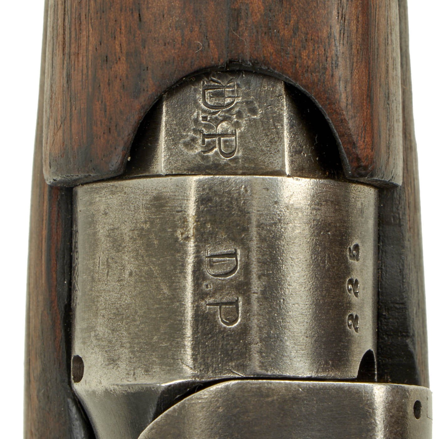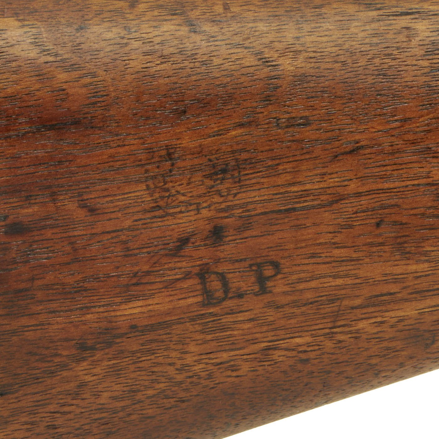Overall solid condition, though the rifle shows some light pitting from long storage. The stock is still in great shape, with a dark brown color from years of oiling and cleaning. The rifle still has a cleaning rod, but it appears to be a service live replacement. It cycles well, with a crisp dry fire. The bore shows a bright finish, but now has very faint rifling, as was common with the shallow Metford rifling. This is most likely why the rifle has been stamped D.P. ("Drill Purpose") in many locations, indicating that it is no longer suitable for front line service. There is also a marking of 12/01 on the butt stock disk, possibly when it was designated drill purpose.