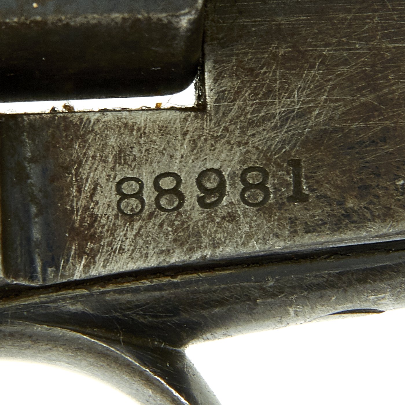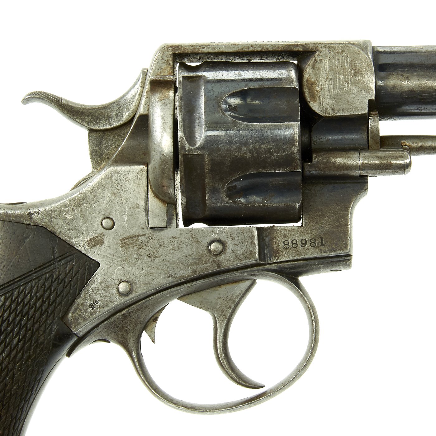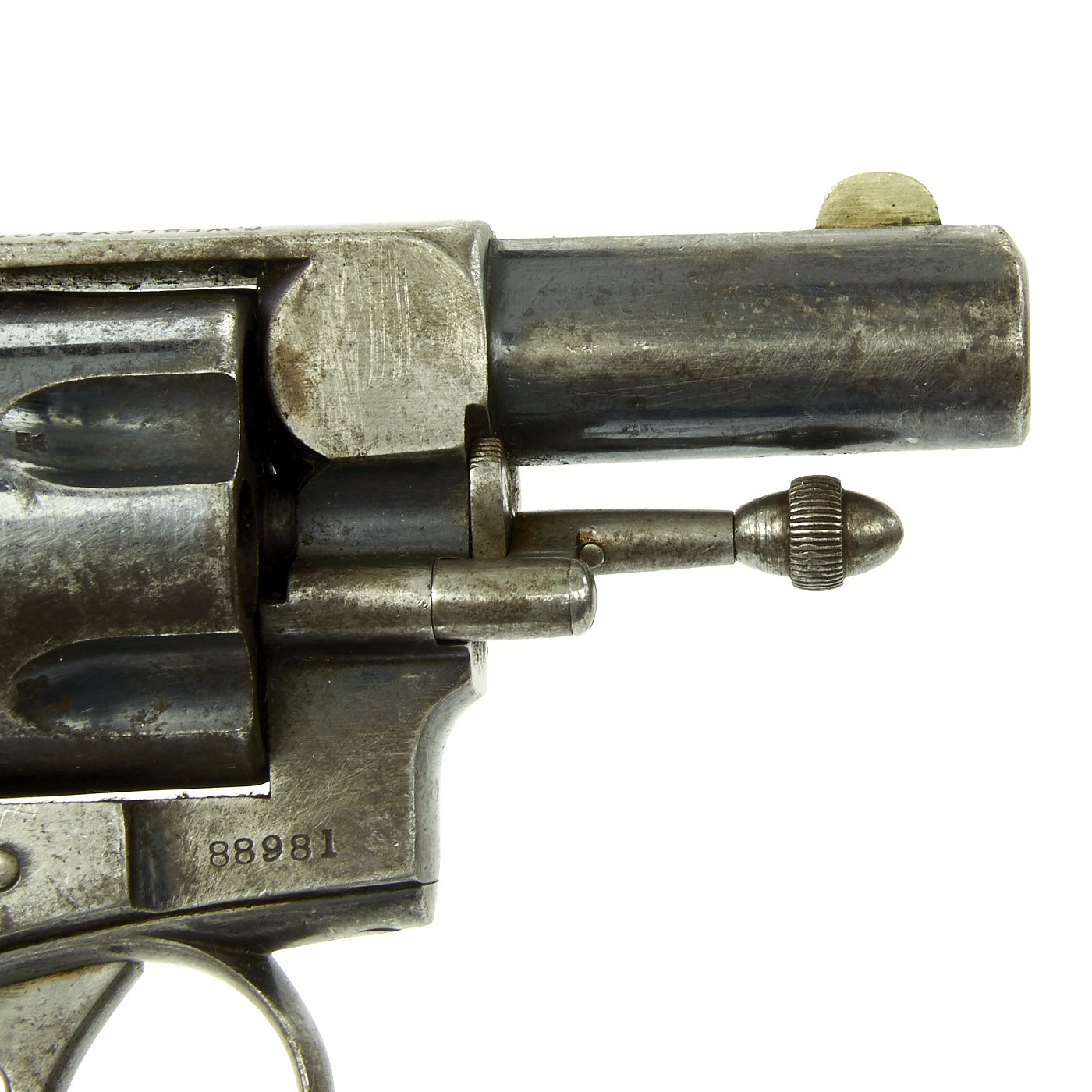 The revolver is fitted with a very short 2 1/2 inch snub barrel, which is marked with caliber of .450. The right side of the frame is marked under the cylinder with serial number 88981, and there are various proofs on the gun. The cylinder takes 6 cartridges, and is marked on the rear with caliber 450 and shortened serial number 981. The revolver operates in both Double Action and Single Action, and the wood grip is fully checkered. Folding side gate on the right hand side provides access to the chambers for ejection and reloading using the attached ejection rod. Action works well, though can be a bit finicky due to age and wear. The revolver breaks down correctly, with the only issue being that the retaining pin for the ejector rod is worn, so the rod can be removed.