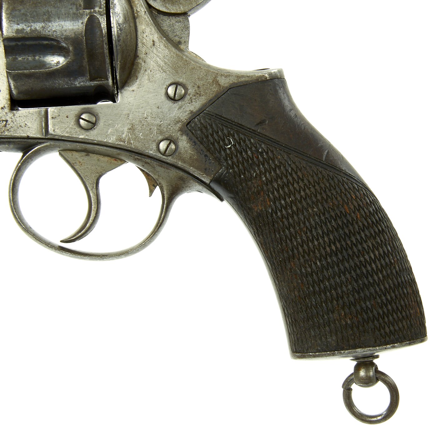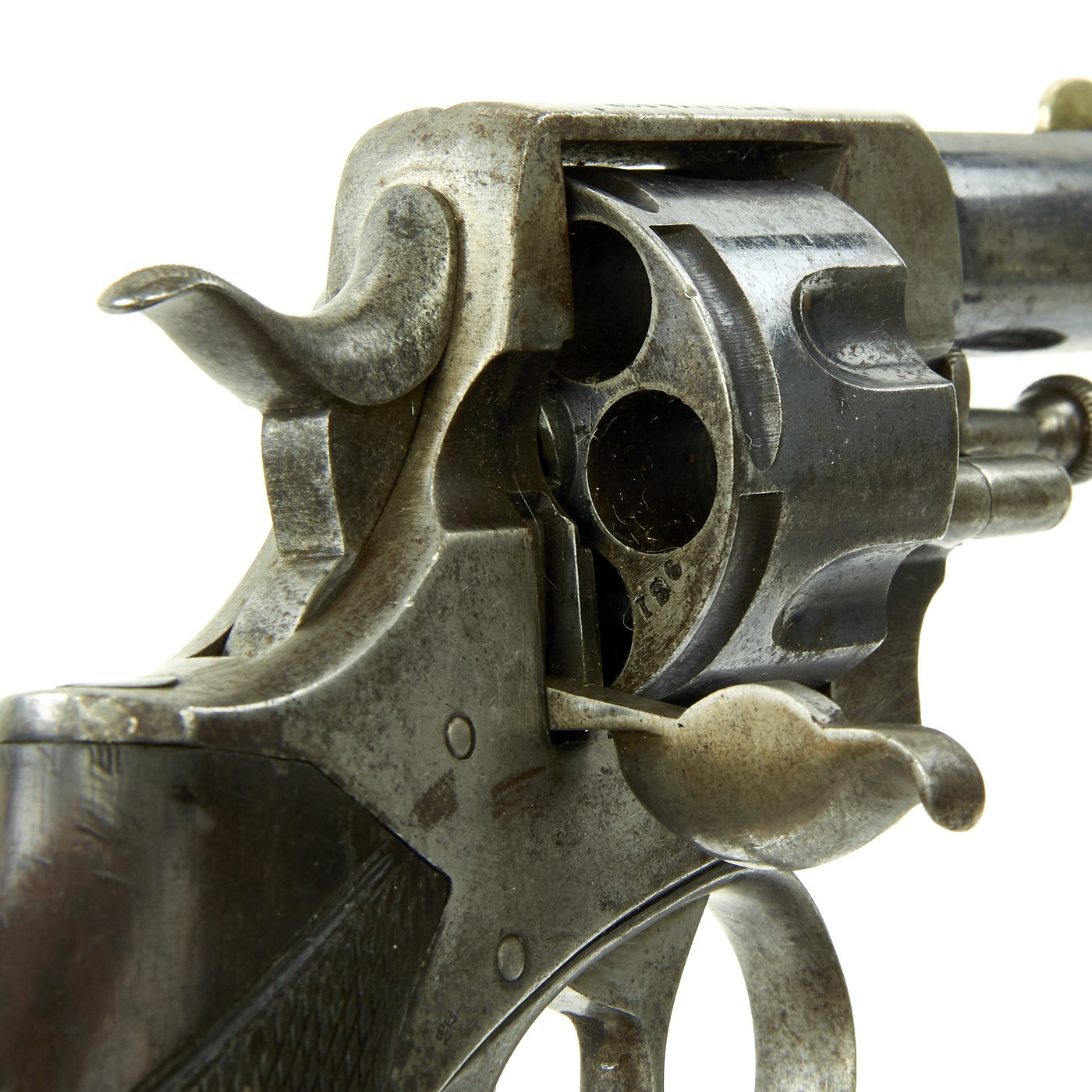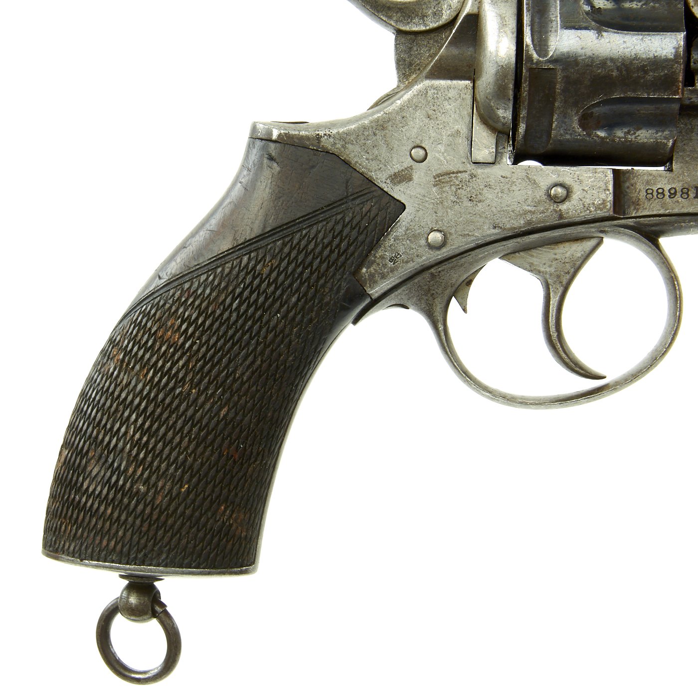 The revolver is fitted with a very short 2 1/2 inch snub barrel, which is marked with caliber of .450. The right side of the frame is marked under the cylinder with serial number 88981, and there are various proofs on the gun. The cylinder takes 6 cartridges, and is marked on the rear with caliber 450 and shortened serial number 981. The revolver operates in both Double Action and Single Action, and the wood grip is fully checkered. Folding side gate on the right hand side provides access to the chambers for ejection and reloading using the attached ejection rod. Action works well, though can be a bit finicky due to age and wear. The revolver breaks down correctly, with the only issue being that the retaining pin for the ejector rod is worn, so the rod can be removed.