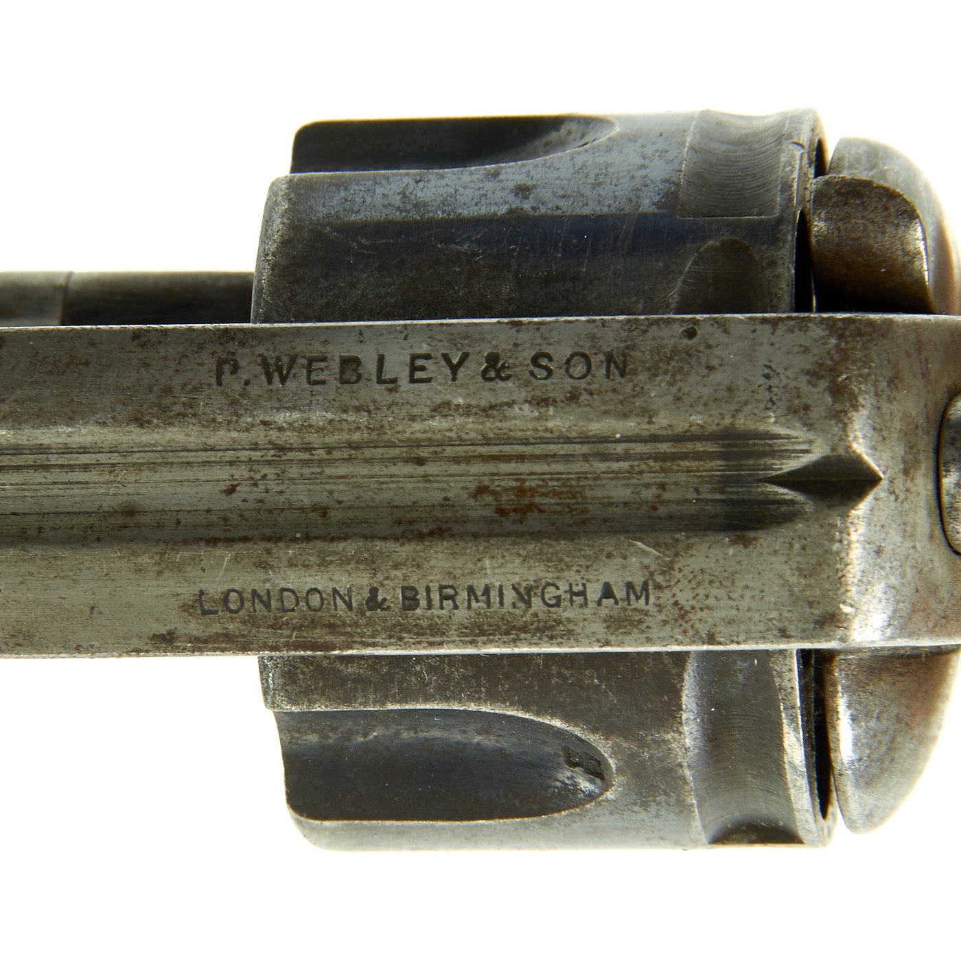 This indicates manufacture by the famous firm of P. Webley & Son, who would later design the famous "Top-Break" Webley Revolver. In 1897 they would merge with W & C Scott and Sons to become The Webley & Scott Revolver and Arms Company Ltd of Birmingham. The left side of the revolver is marked with: