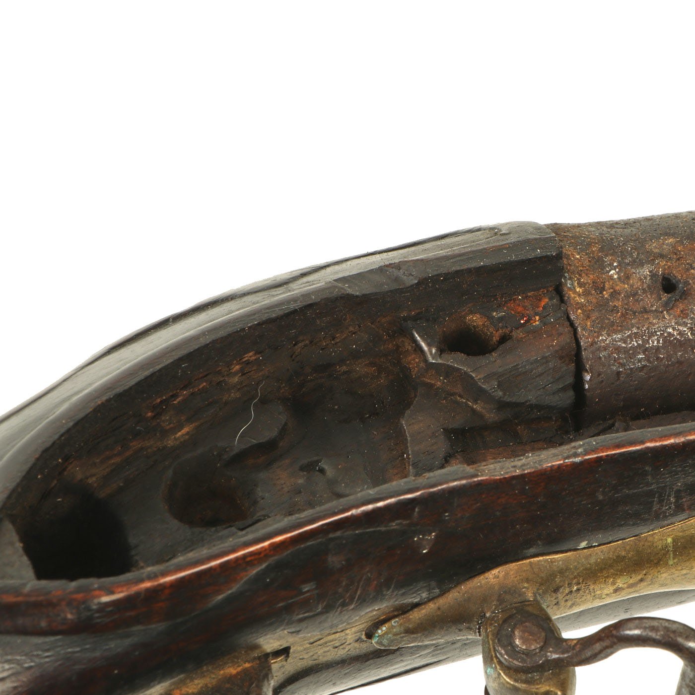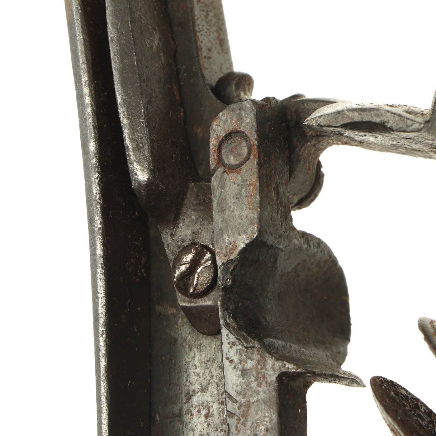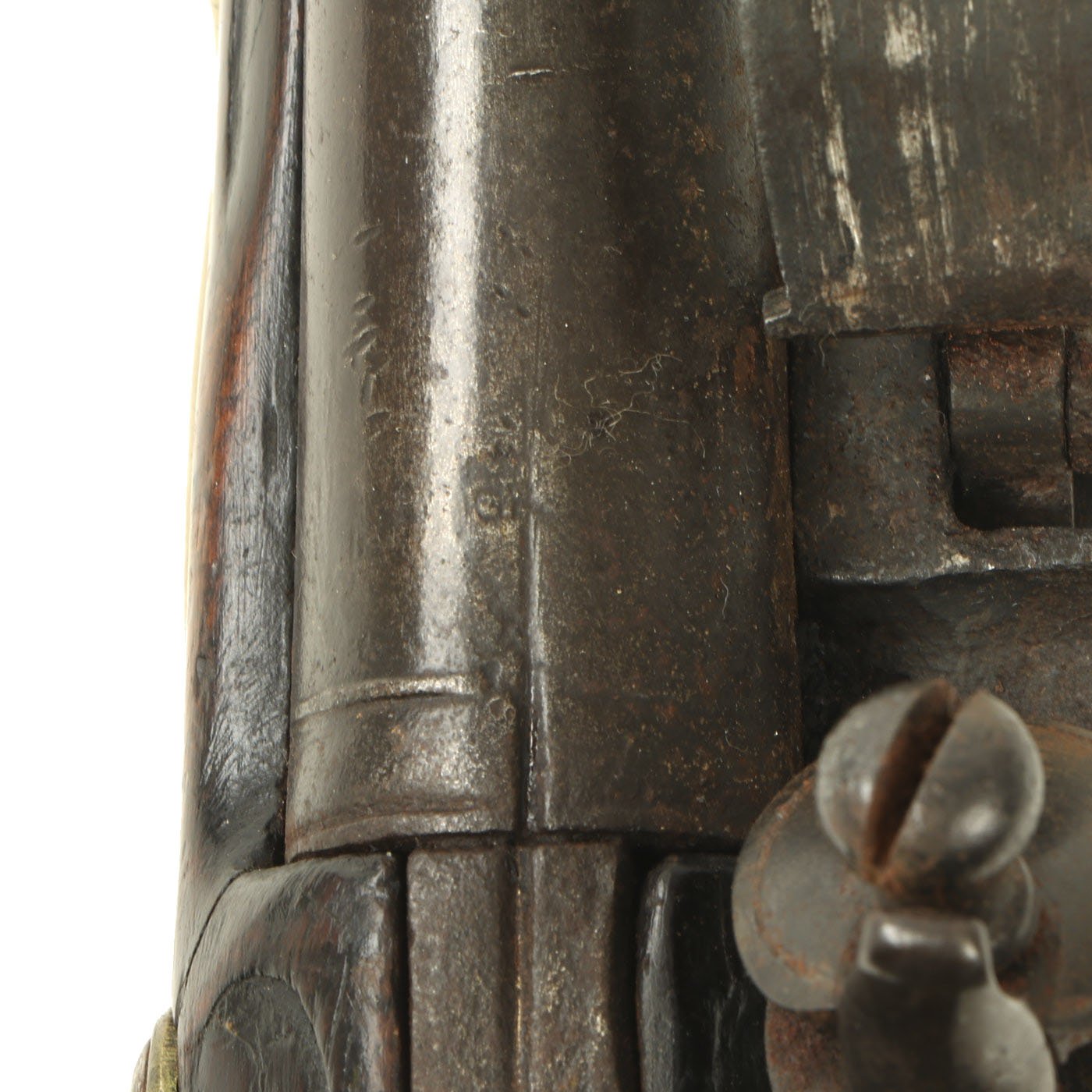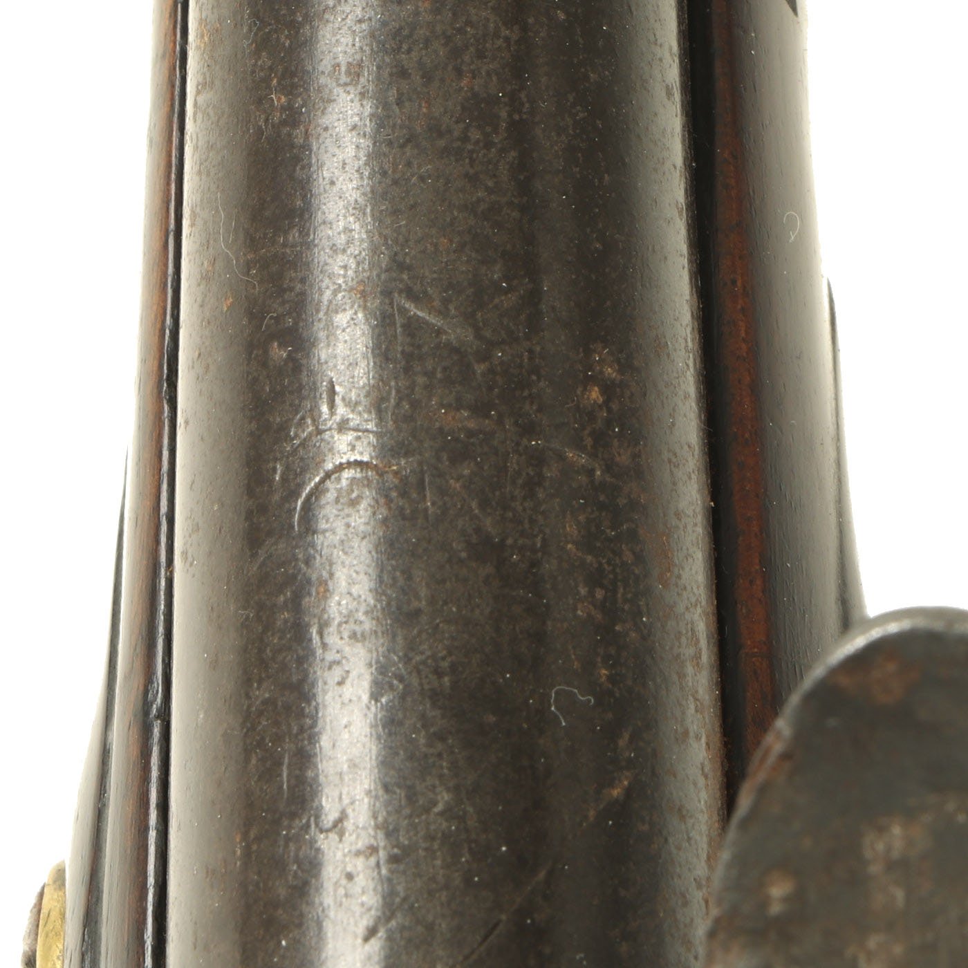 The barrel on this fine example is in .75 bore and measures 46 1/4", with a clear CROWN / GR proof on the breech. There also appears to be the remains of a larger "crown" engraving a few inches farther down the barrel. The banana shaped lock with without a frizzen support bar, typically called a “bridle”, was not introduced until later in the 18th century. The lock plate tail is engraved E. COOKES (EDWARD COOKES) over the date of 1729. It is also marked with a Crown over G.R. mid lock for King George II, with the "lock viewers mark" underneath the frizzen. Action is strong and holds at half cock and fired correctly at full cock. The lock is quite clean and in great shape.