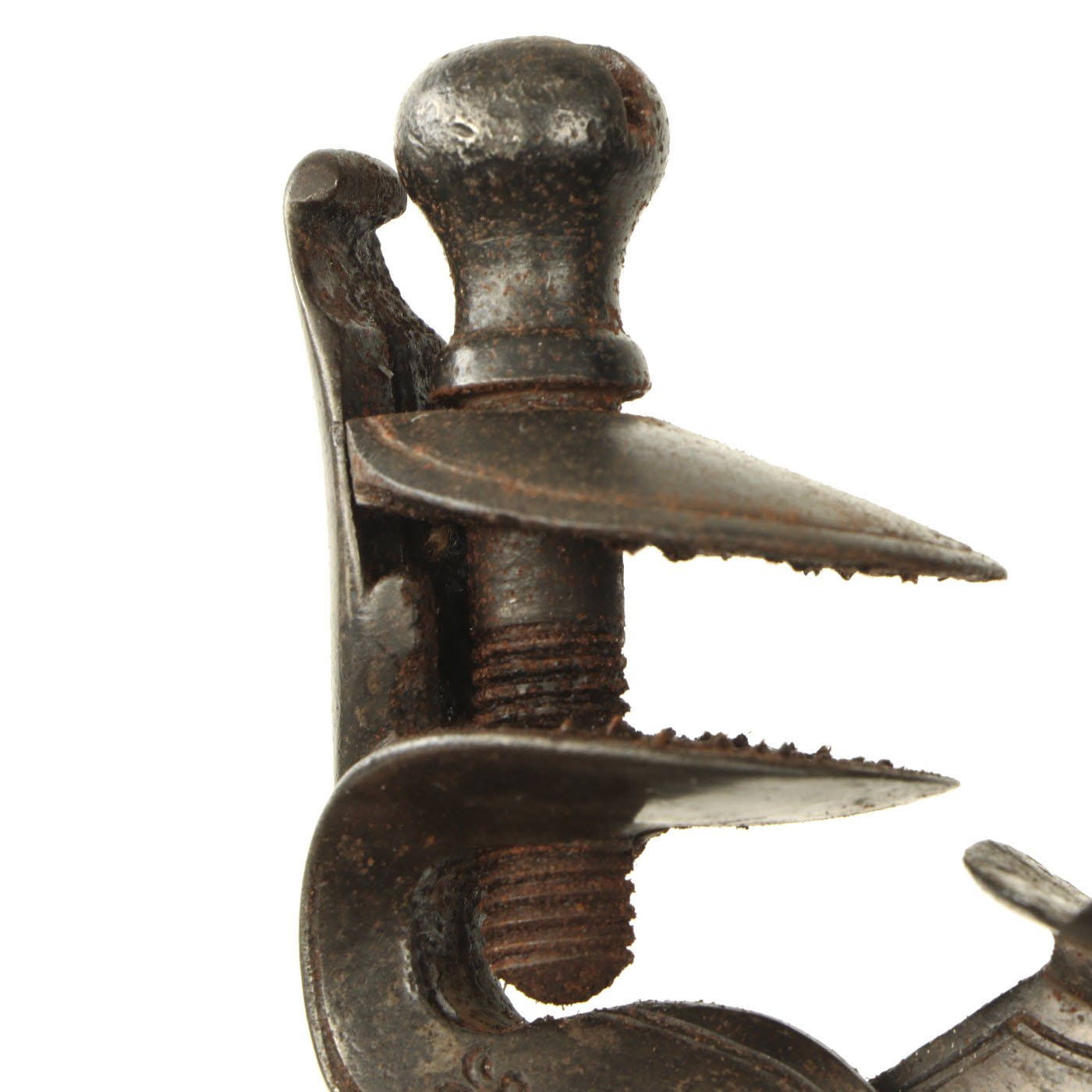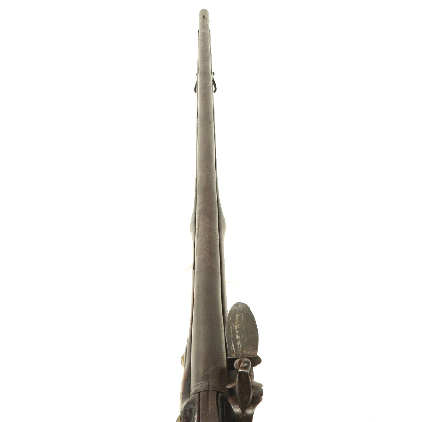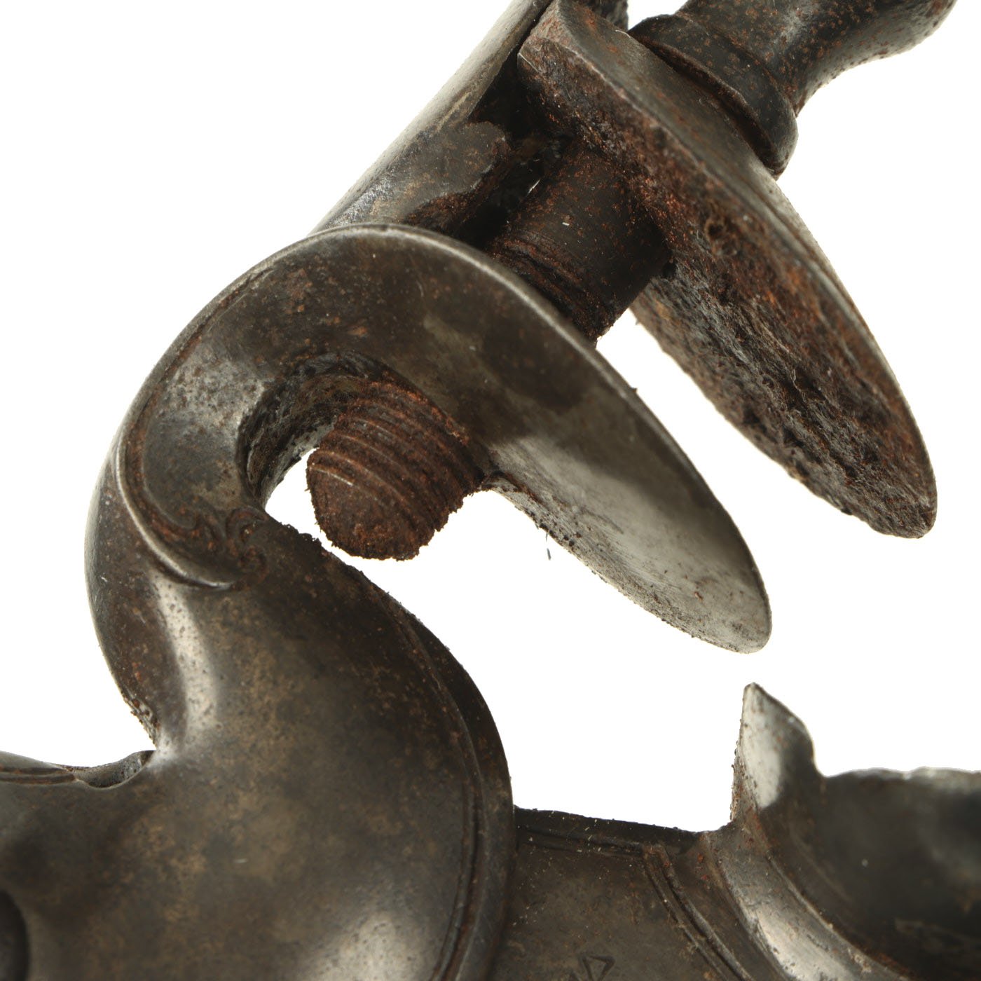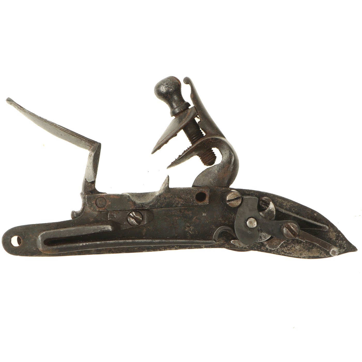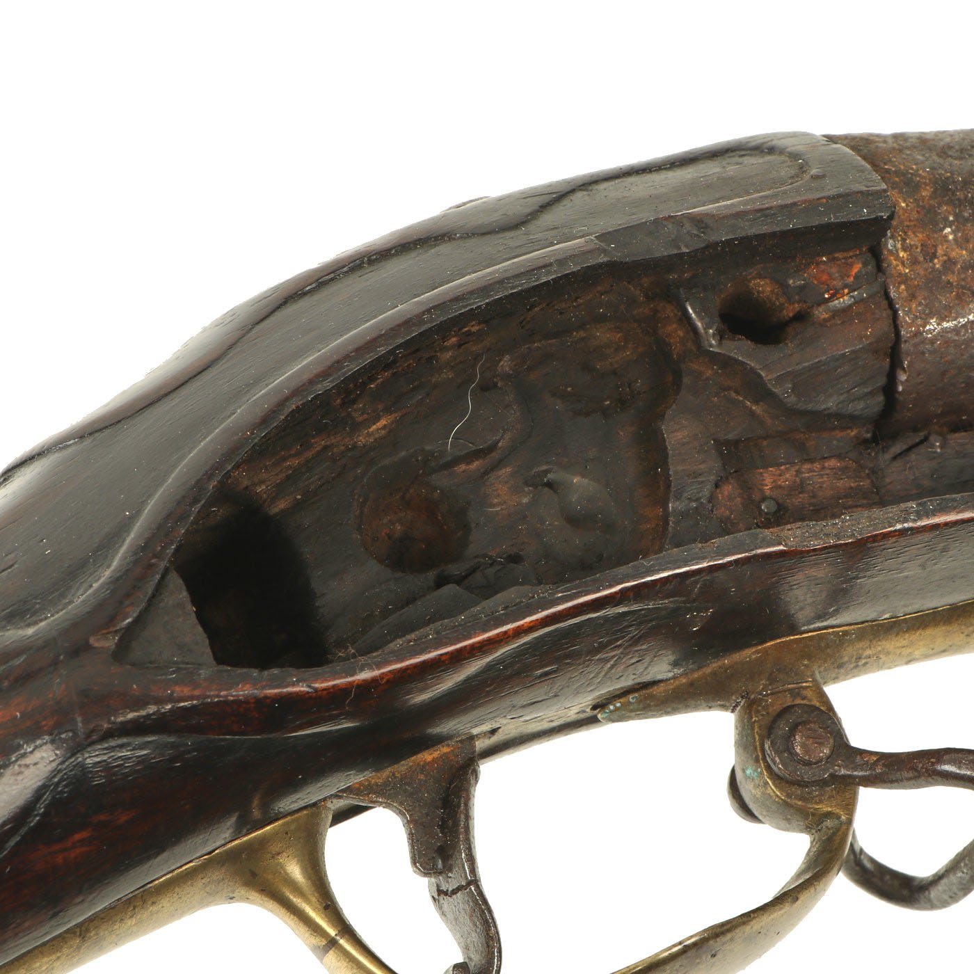 The barrel on this fine example is in .75 bore and measures 46 1/4", with a clear CROWN / GR proof on the breech. There also appears to be the remains of a larger "crown" engraving a few inches farther down the barrel. The banana shaped lock with without a frizzen support bar, typically called a “bridle”, was not introduced until later in the 18th century. The lock plate tail is engraved E. COOKES (EDWARD COOKES) over the date of 1729. It is also marked with a Crown over G.R. mid lock for King George II, with the "lock viewers mark" underneath the frizzen. Action is strong and holds at half cock and fired correctly at full cock. The lock is quite clean and in great shape.