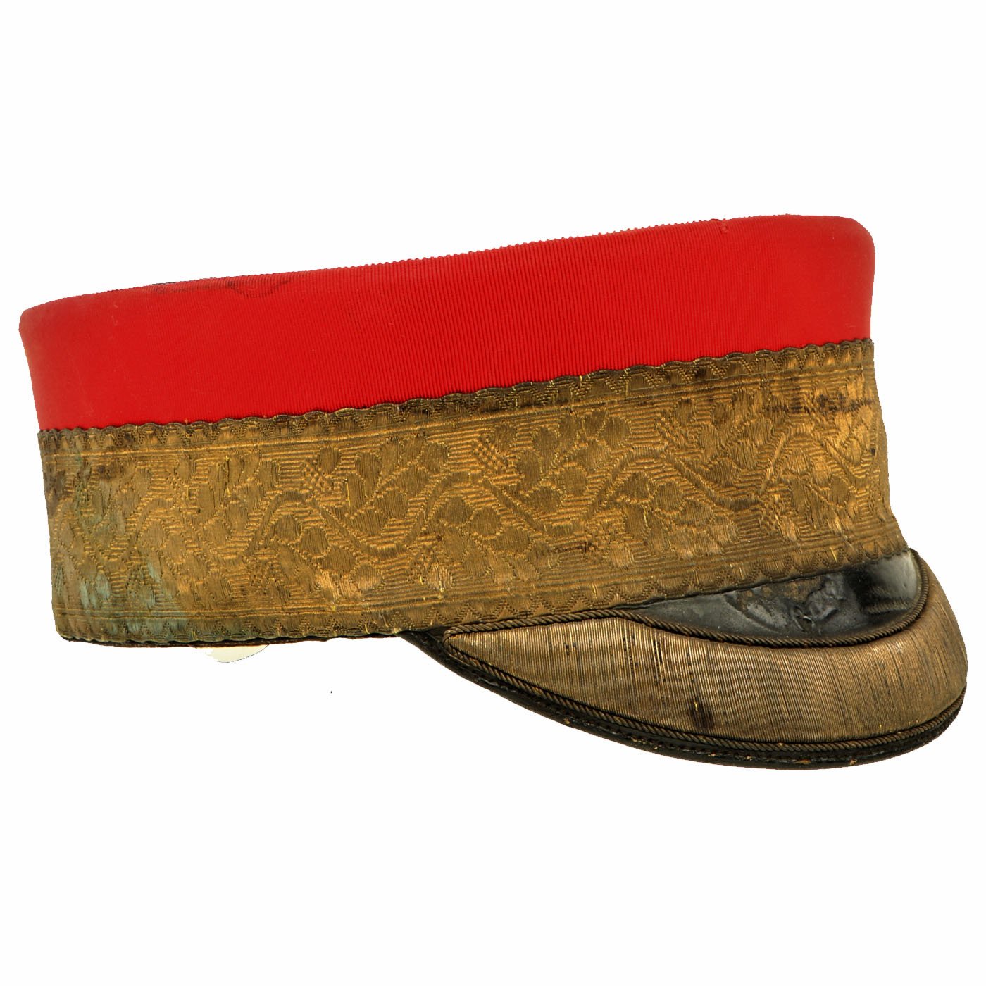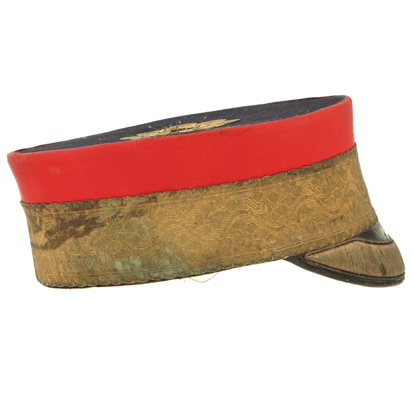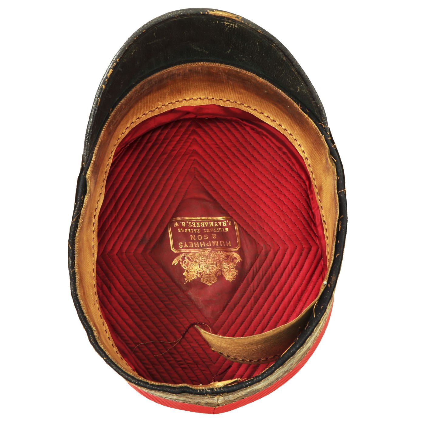 Original item: Only One Available. The round forage cap with drooping peak, was first introduced generally in 1880 (It had been worn for some time by the Foot Guards prior to 1880) and it was to replace the shallower, kepi style round cap with the flat straight peak that had been worn since just after the Crimean War. At first it had straight sides but after some time, it developed a bell top. The cap was worn by most branches of the army except the cavalry, Royal Artillery and Rifle regiments in the infantry who wore the pillbox cap. On the previous caps, infantry regiments had worn their cap badge which was the regimental number in gilt or brass and where appropriate, a regimental device above. When the Childers reforms of 1881 were enacted, the numbers disappeared and regimental badges were adopted in either embroidery or various metals like gilt or silver. These regimental badges and devices were first described in the Dress Regulations of 1883, and continued through to regulations of 1900. The badges themselves were quite elaborate and must have tested the skill of the embroiderer as it was all done by hand. Because of that, badges varied in detail (sometimes substantially) because the work was done at a different time or by a different firm.